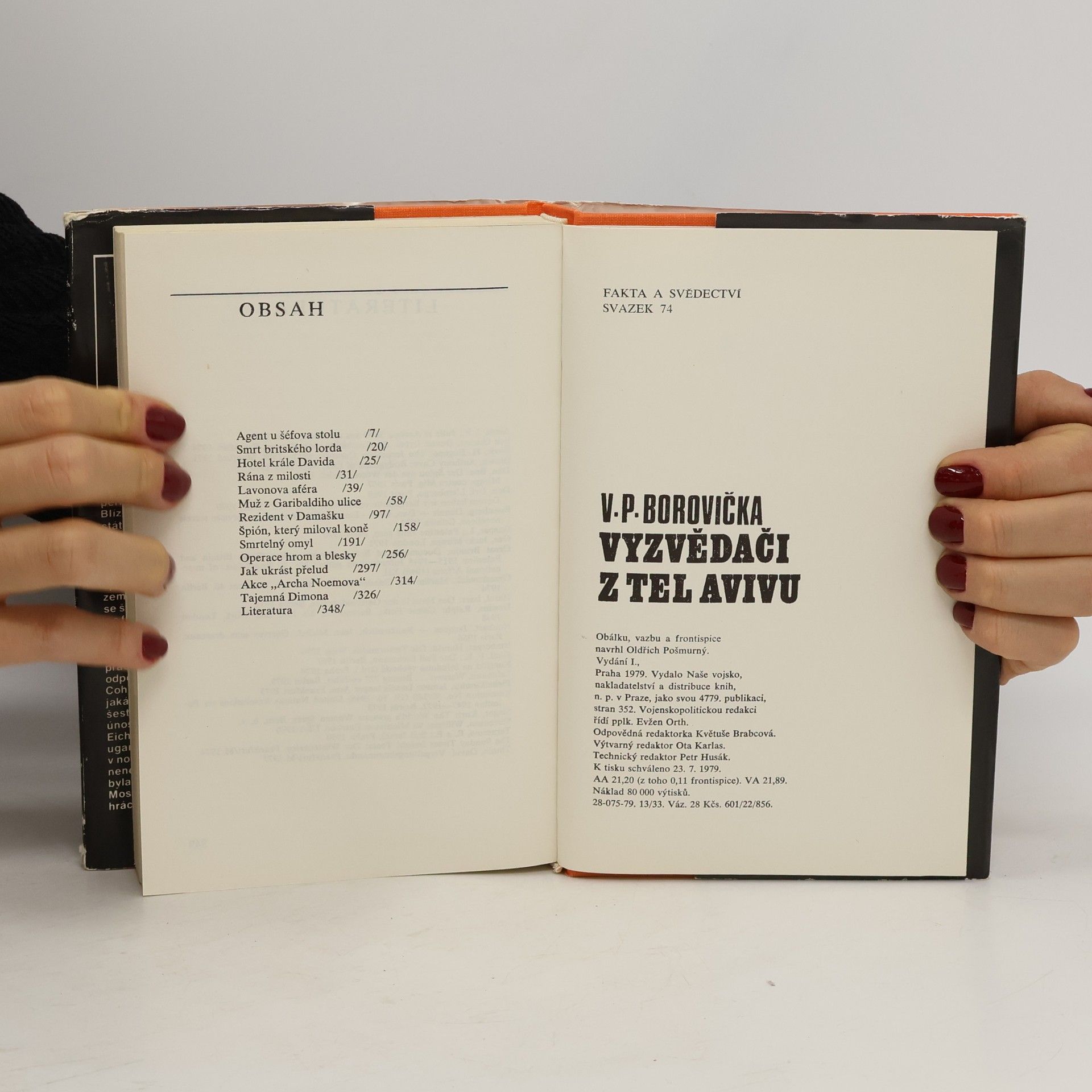 V. P. Borovička v řadě dramatických příběhů dává nahlédnout do způsobu práce izraelské tajné služby Mossad. Vypráví o spolupráci Mossadu s americkou CIA a s dalšími zpravodajskými centrálami, o získávání a přípravě agentů, kteří se podílejí na různých teroristických akcích apolitických vraždách, odhaluje pozadí Lavonovy aféry, informuje o vypátrání a únosu nacistického zločince Adolfa Eichmanna, o vyzvědačích Eliahu Cohenovi aj.