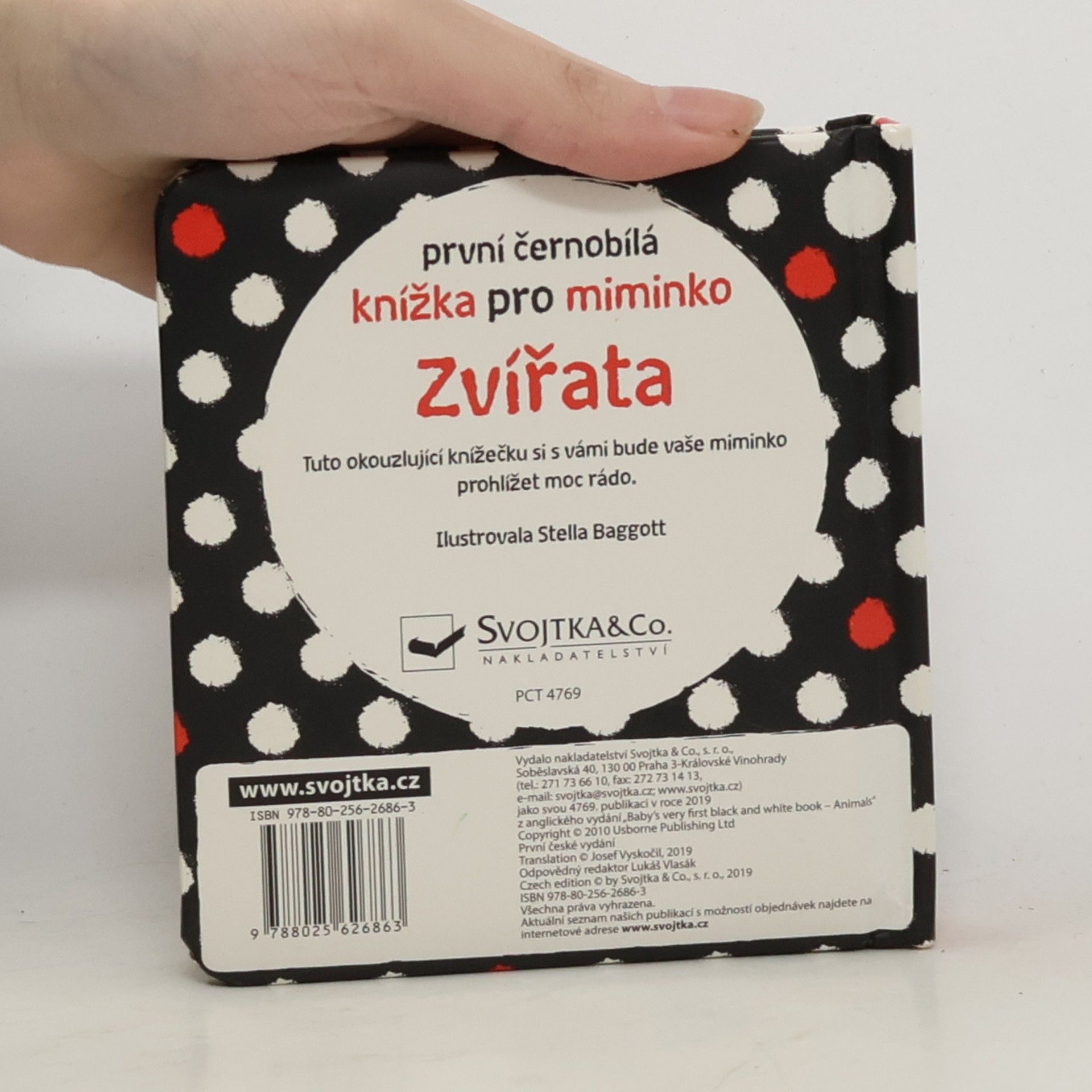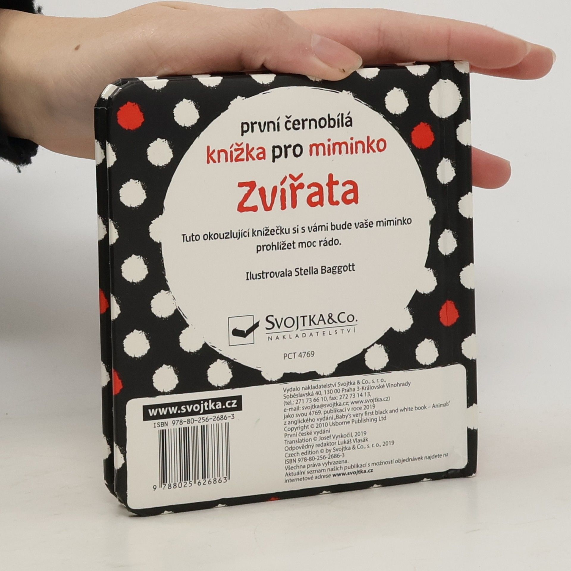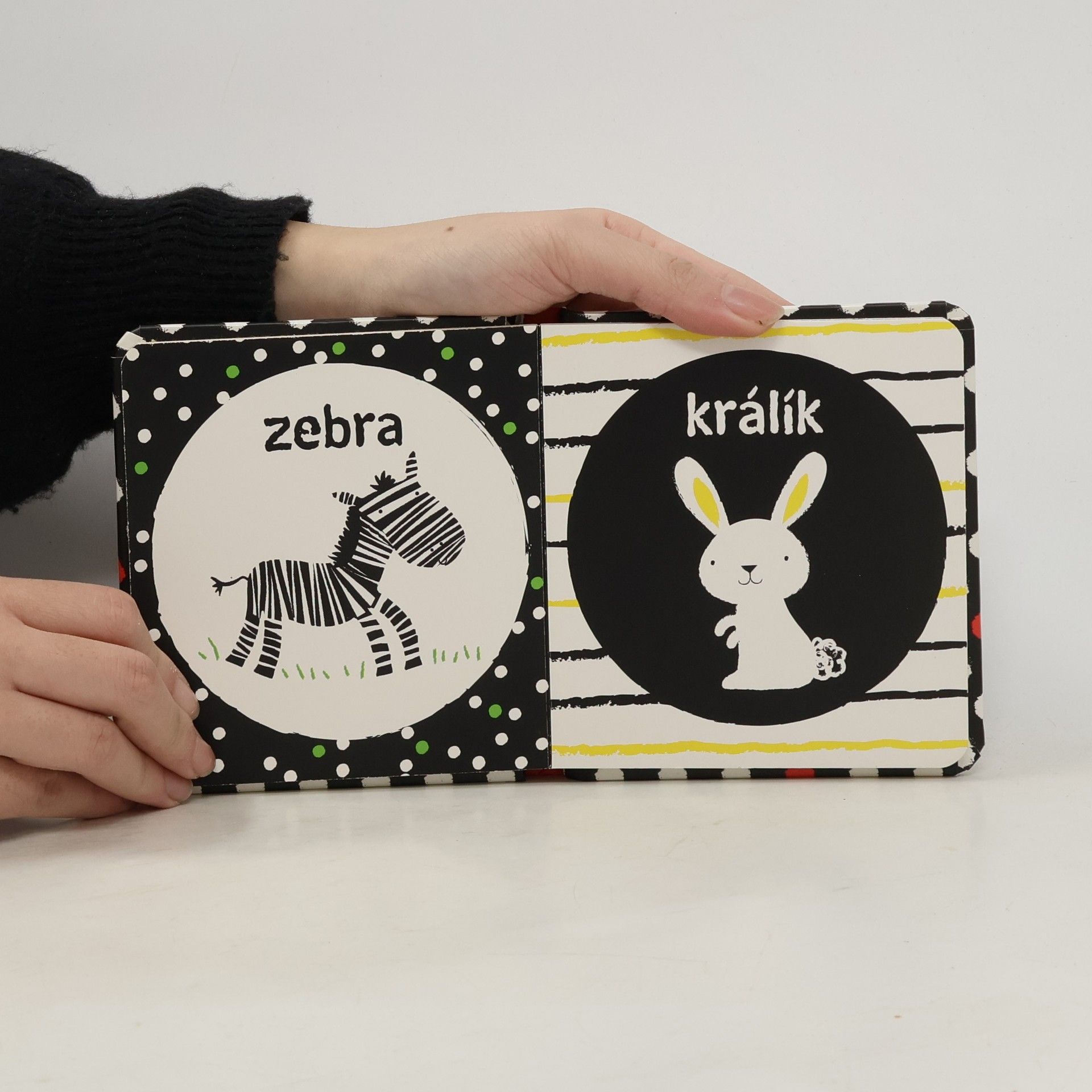 Ideální první knížka pro vaše miminko. Velká je tak akorát do dětských ručiček, má oblé hrany a díky pevným stránkám vydrží i méně šetrné zacházení. Obrázky zvířátek, uzpůsobené malému děťátku, si vaše miminko může prohlížet stále dokola. Černobílá varianta s jemnými barevnými prvky je pro správný vývoj zraku malého miminka vhodnější než pestrobarevné obrázky. Ukažte svému děťátku, jak má otáčet pevné stránky, a rozvíjejte tak u něj jemnou motoriku a koordinaci pohybu prstíků.