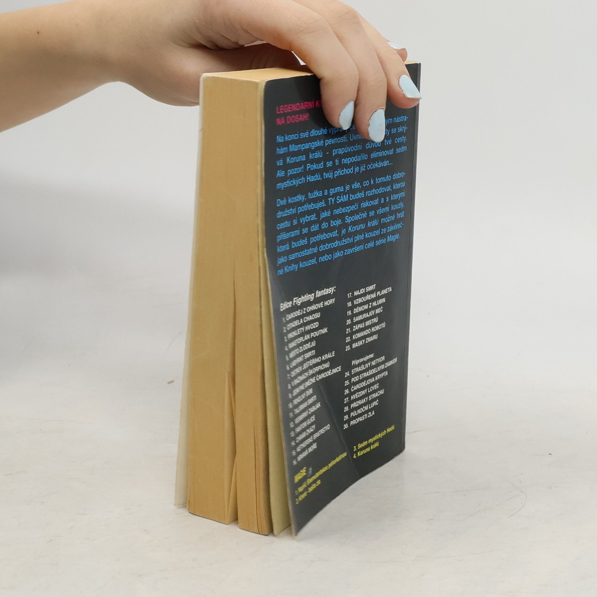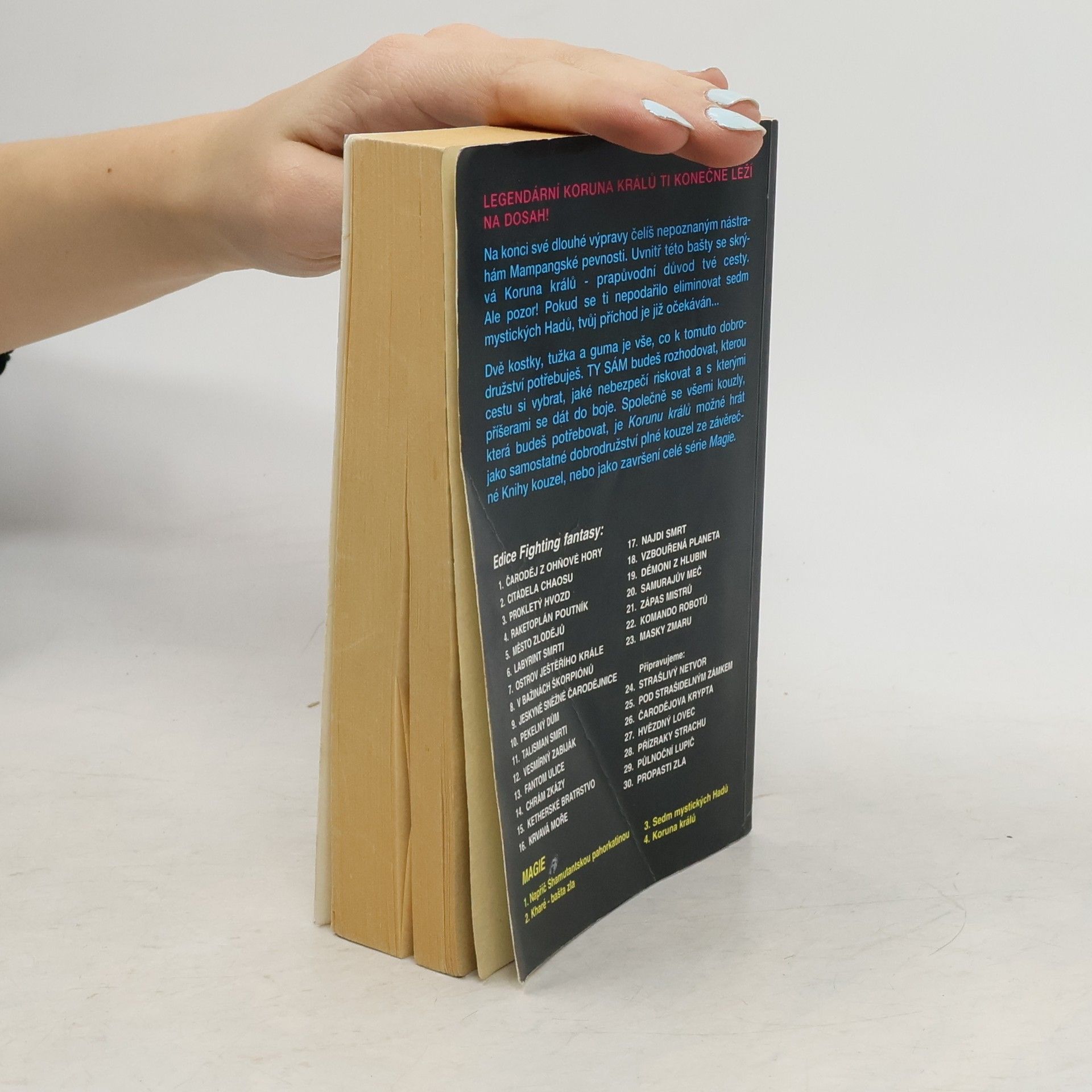 Na konci své dlouhé výpravy čelíš nepoznaným nástrahám Mampangské pevnosti. Uvnitř této bašty se skrývá Koruna králů – prapůvodní důvod tvé cesty. Ale pozor! Pokud se ti nepodařilo eliminovat sedm mystických Hadů, tvůj příchod je již očekáván… Dvě kostky, tužka a guma je vše, co k tomuto dobrodružství potřebuješ. Ty sám budeš rozhodovat, kterou cestu si vybrat, jaké nebezpečí riskovat a s kterými příšerami se dát do boje. Společně se všemi kouzly, která budeš potřebovat, je Korunu králů možné hrát jako samostatné dobrodružství plné kouzel ze závěrečné Knihy kouzel, nebo jako završení celé série Magie.