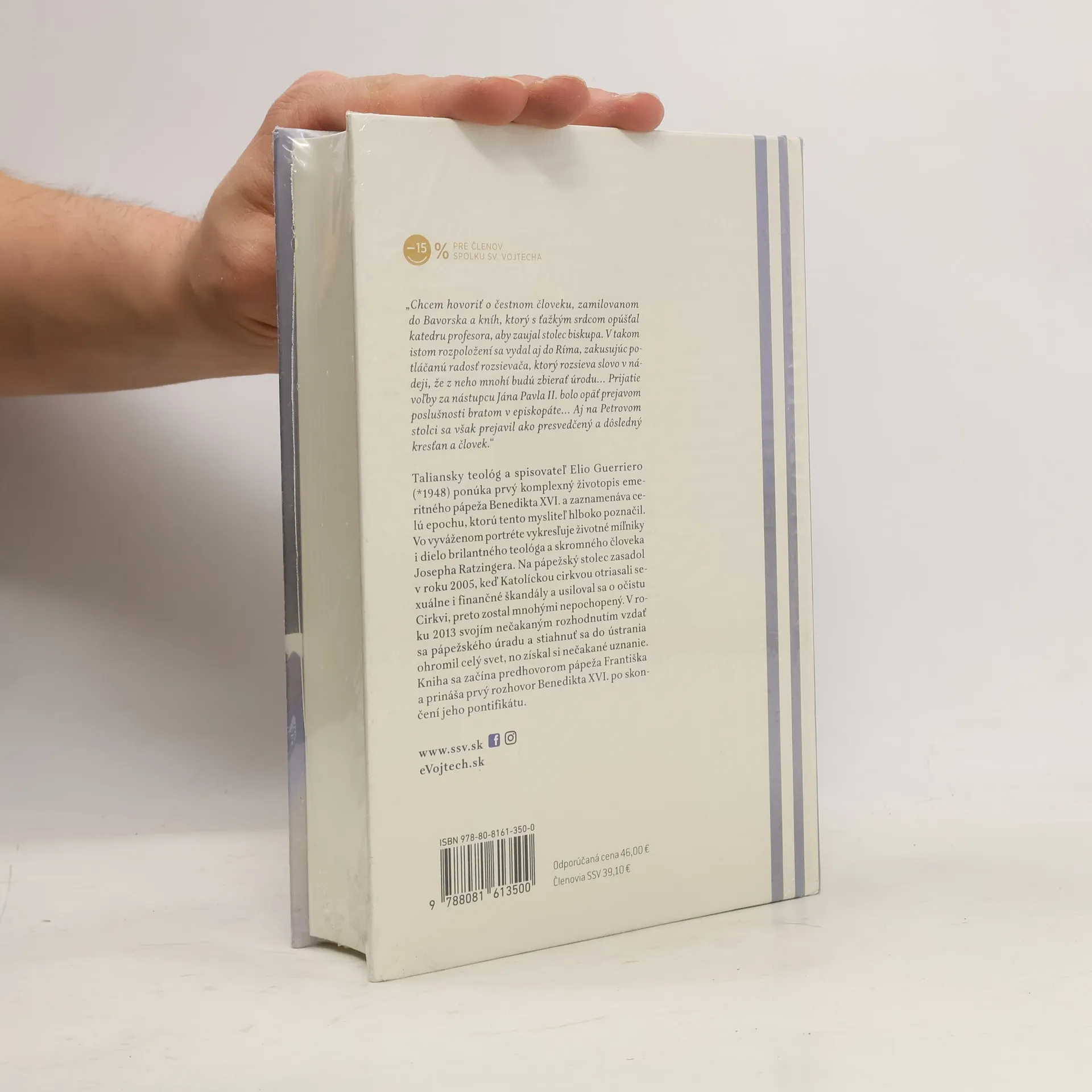 S predhovorom pápeža Františka Taliansky teológ a spisovateľ Elio Guerriero (*1948) ponúka prvý komplexný životopis emeritného pápeža Benedikta XVI. a zaznamenáva celú epochu, ktorú tento mysliteľ hlboko poznačil. Vo vyváženom portréte vykresľuje životné míľniky i dielo brilantného teológa a skromného človeka Josepha Ratzingera. Na pápežský stolec zasadol v roku 2005, keď Katolíckou cirkvou otriasali sexuálne i finančné škandály a usiloval sa o očistu Cirkvi, preto zostal mnohými nepochopený. V roku 2013 svojím nečakaným rozhodnutím vzdať sa pápežského úradu a stiahnuť sa do ústrania ohromil celý svet a získal si nečakané uznanie. Kniha sa začína predhovorom pápeža Františka a prináša prvý rozhovor Benedikta XVI. po skončení jeho pontifikátu.