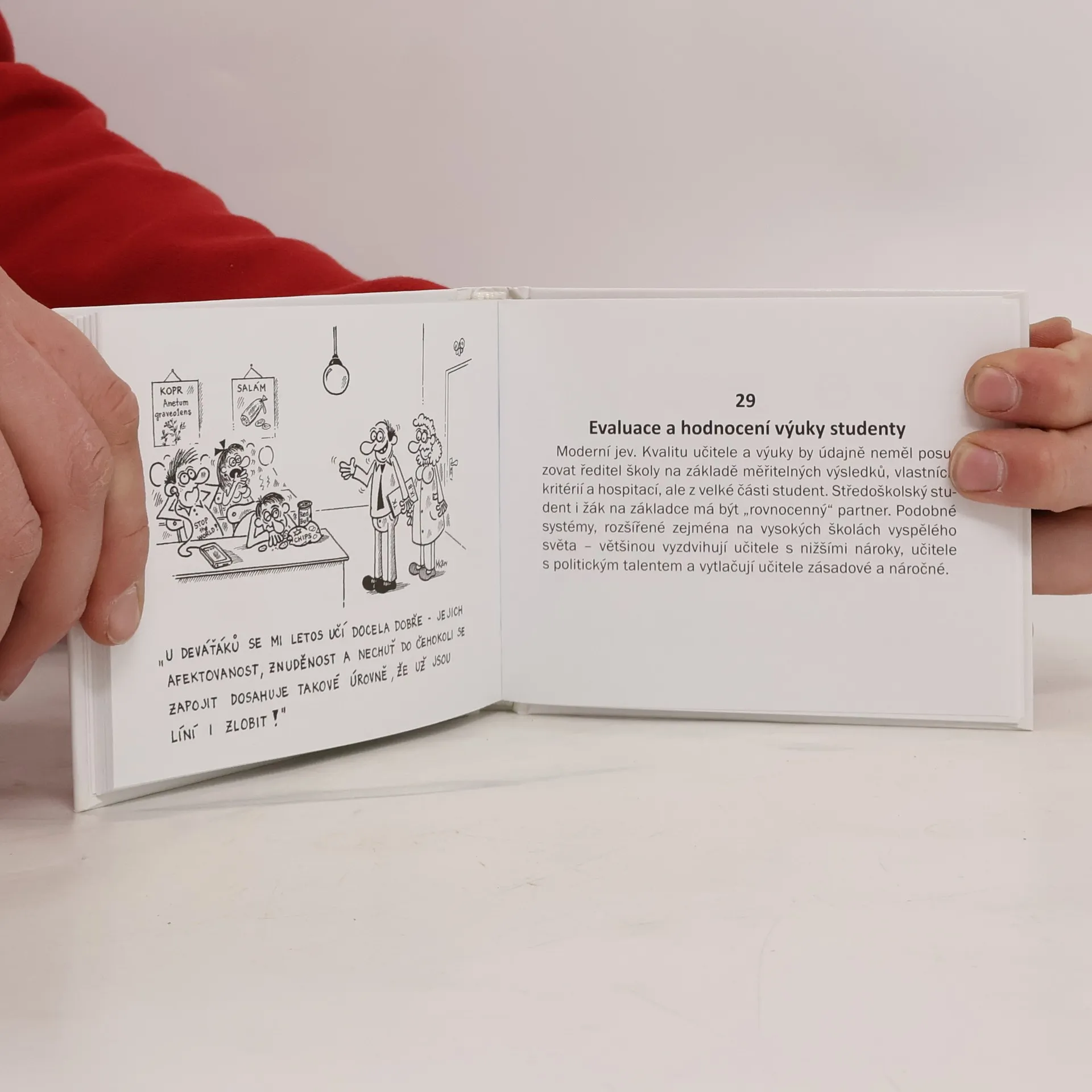 Pedagogové Václav Klaus ml. a Milan Kocmánek spolu napsali knížku. Vykašlali se na korektnost a ruku v ruce dali dohromady knihu vtipů o české škole. Možná kritici namítnou, že některé vtipy jsou za hranou, že jsou příliš zjednodušující, že přehánějí. Ale vtipy takové být musí, pokud jsou opatrné a korektní, moc vtipné většinou nejsou. Oběma stejně jako mnohým českým kantorům vadí experimentování sociálních inženýrů a zájmových neziskovek s našimi dětmi. Vadí jim hromady papírování, kterým jsou zahrnováni učitelé a ředitelé škol, když jejich úkolem na prvním místě je UČIT!