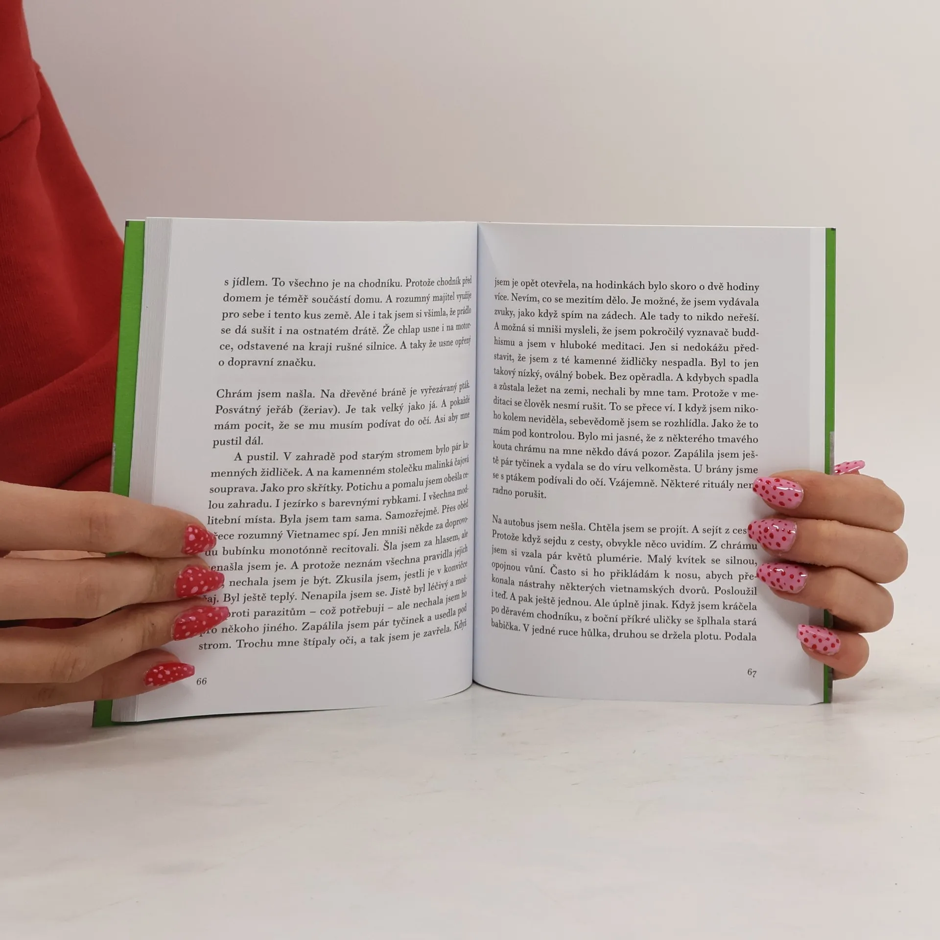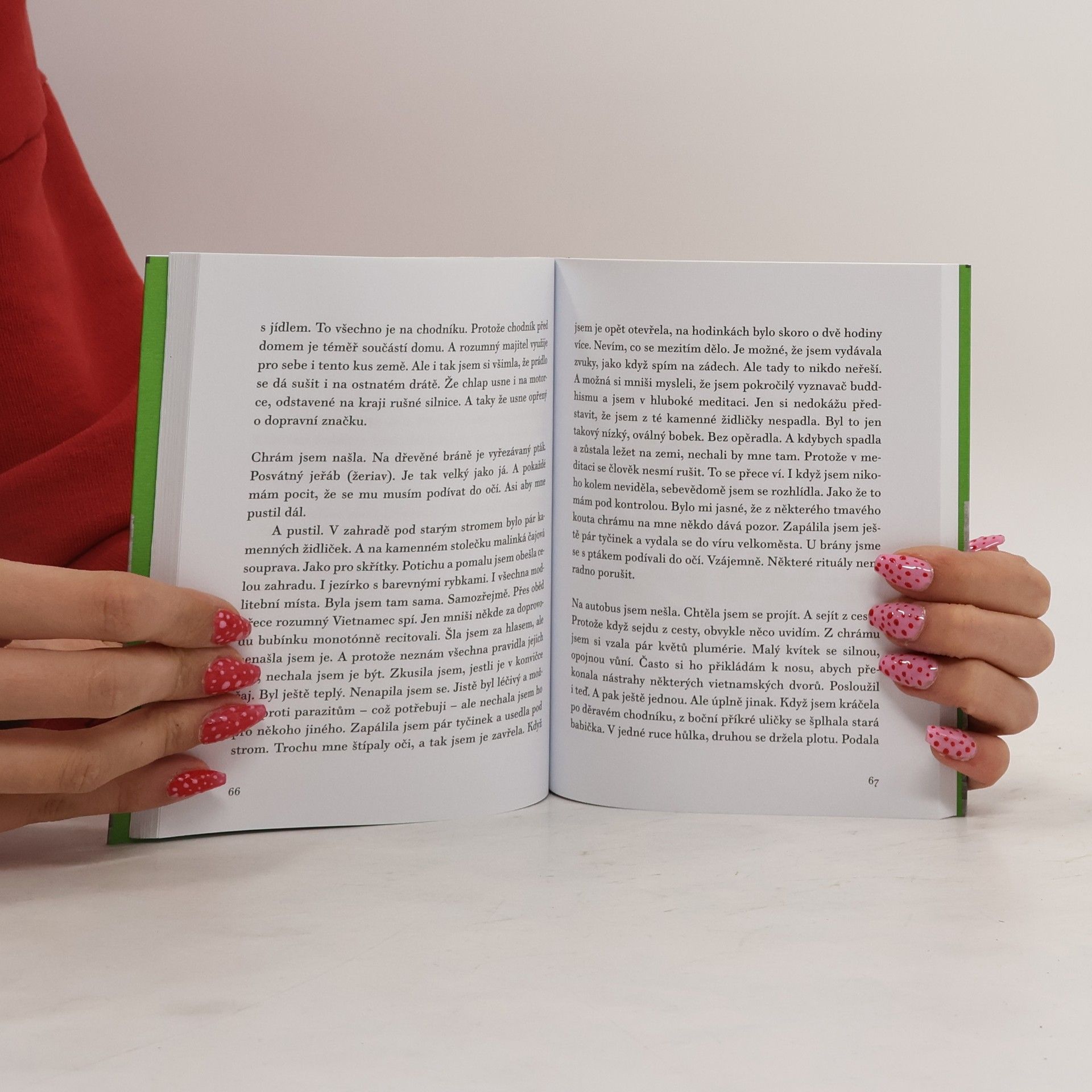 Poznat Vietnam zblízka, uvidět a hlavně prožít, jaký je… Tato netradičně pojatá knížka není klasickým cestopisem seznamujícím s památkami daného místa. Je to spíše „kniha oči i duši otevírající“, tvořená souborem „medailonků“ o Vietnamu a jeho obyvatelích. Jakýsi „pocitopis“ s řadou postřehů a údajů, kterých si klasický bedekr nevšímá a ani nemůže všimnout. Vyjeví se nám zde Vietnam a Vietnamci skuteční – ve světě reálném, ale plném někdy až surreálných zážitků. A my čtenáři si spolu s autorkou těchto cestopisných příběhů můžeme ono putování užívat. Žila zde dostatečně dlouho, aby se z Vietnamu stal její „paralelní svět“. Popis jejích příhod je velmi bezprostřední. A tak, když ona se těší z exotického jídla, jsme to i my, komu se sliny sbíhají, když se třese zimou (což je ve Vietnamu vzácnost), i nám začnou zuby drkotat, když ona si užívá divoké jízdy autobusem, jsme to my, kterým se opojně točí hlava. A spolu s autorkou se hlavně smějeme a usmíváme. Její postřehy jsou totiž neotřelé, zábavné, poetické, s citem pro paradox. To všechno je doplněno jemnou hrou s jazykem, ke kterému má jako česky píšící a v Čechách usedlá Slovenka (sama se považuje hlavně za Tatranku, neboť se narodila v Tatrách) osobitý přístup. Těží z jazykové blízkosti i rozdílnosti obou jazyků a obohacuje je trefnými novotvary. Zkrátka, čtenář se leccos nového dozví, dobře se naladí a zcela jistě se nebude nudit.