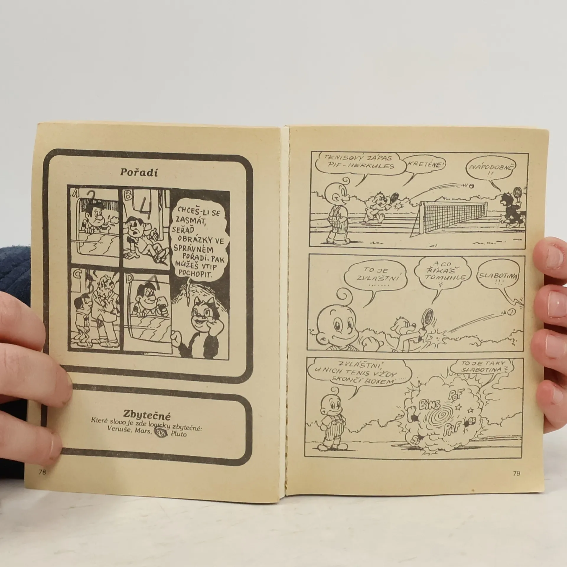 Jednostránkové humorné příběhy s Pifem a Herculem v hlavních rolích. Polovinu knížečky (každá sudá strana) tvoří hádanky, hlavolamy a vtipy.