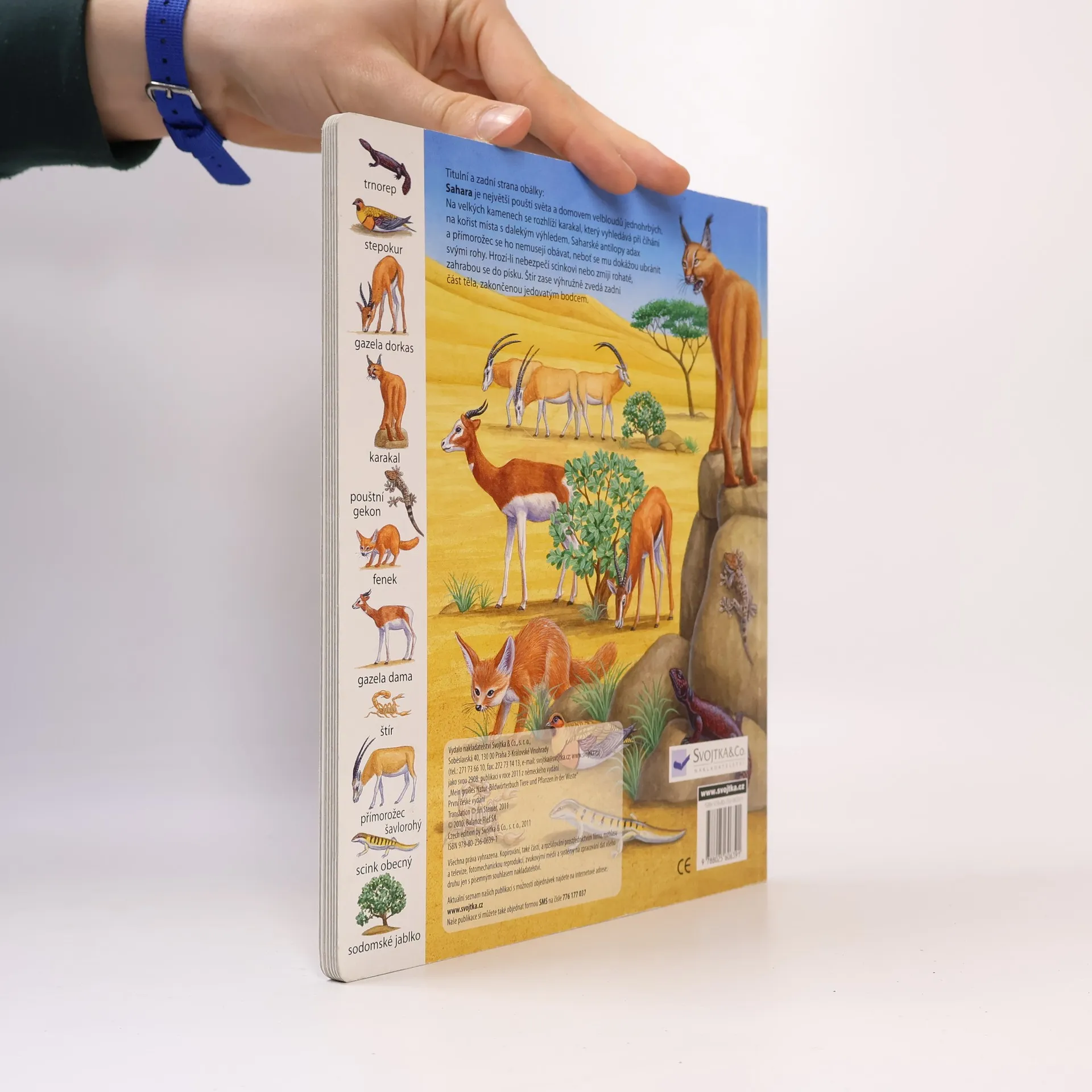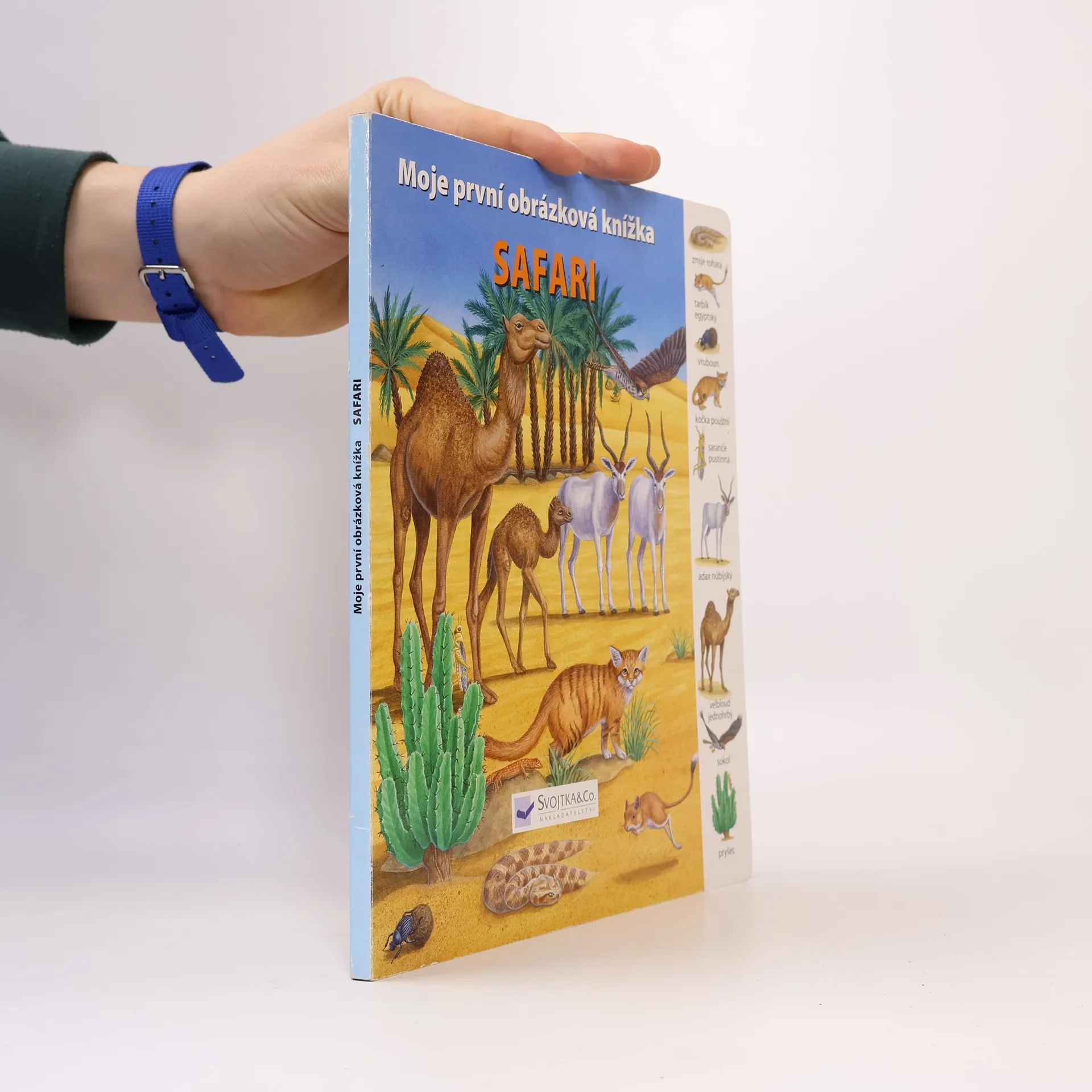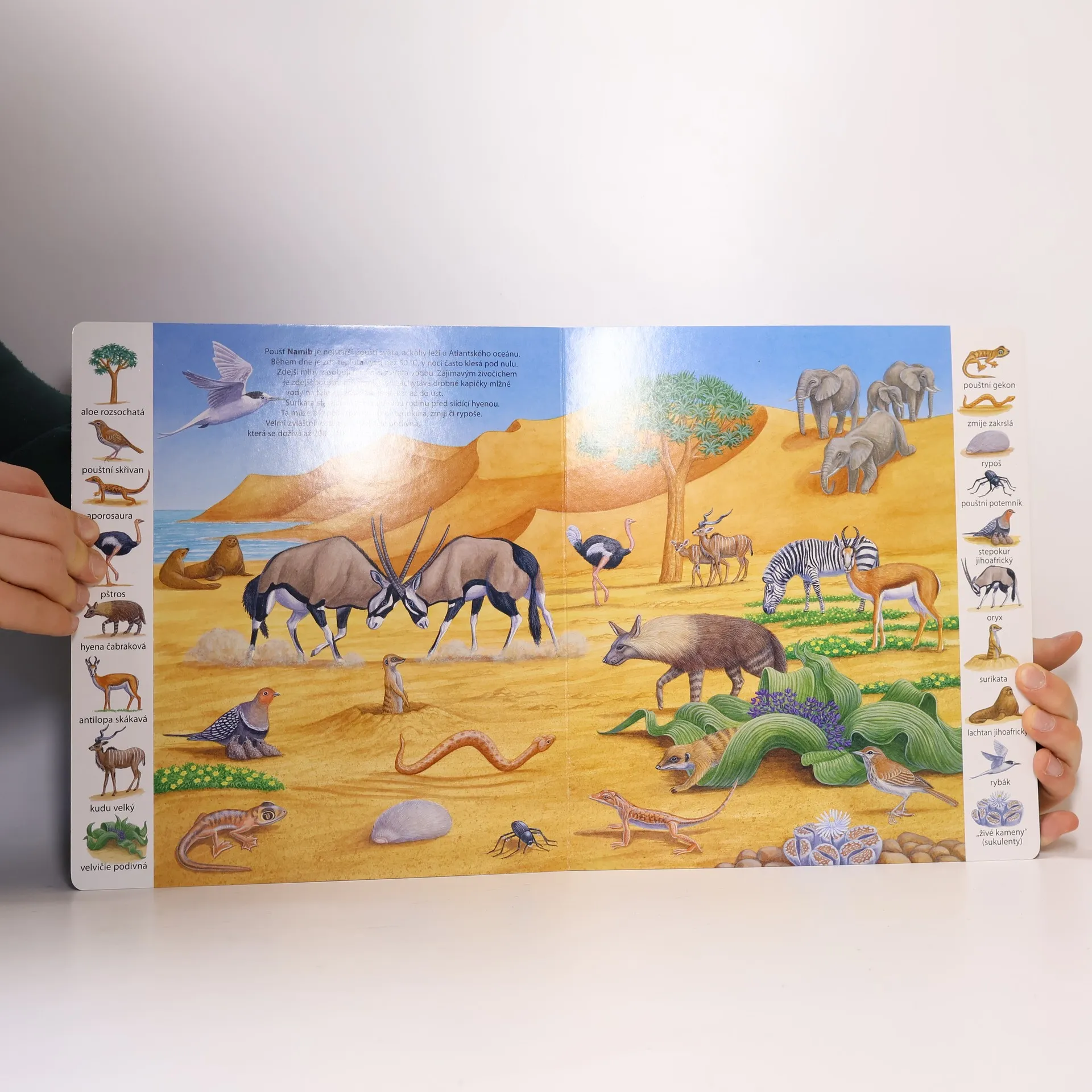 Toto leporelo je určeno pro děti, které se zajímají o svět kolem sebe. Malé čtenáře seznamuje s rostlinami, ptáky, plazy a dalšími zvířátky, která by mohli vidět na výpravě v poušti. Nechybějí jednoduché otázky, na které děti najdou srozumitelné odpovědi. Je doplněno půvabnými názornými barevnými ilustracemi a rastrem s podrobnými vyobrazeními.