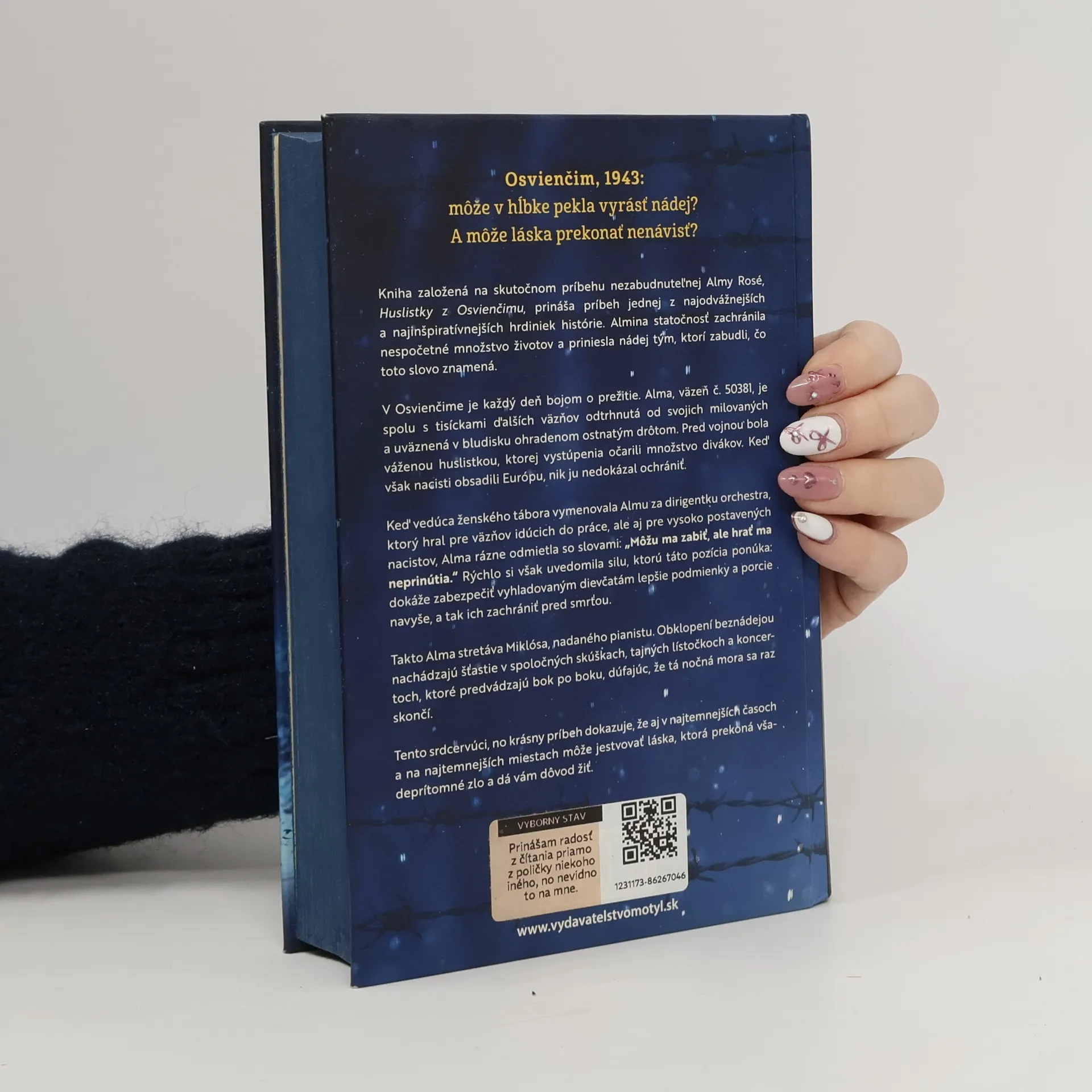 Auschwitz, 1943: Môže v hĺbke pekla vyrásť nádej? A môže láska prekonať nenávisť? Kniha založená na skutočnom príbehu Almy Rosé, huslistky z Auschwitzu, prináša príbeh jednej z najodvážnejších hrdiniek histórie. Almina statočnosť zachránila nespočetné množstvo životov a priniesla nádej tým, ktorí zabudli, čo toto slovo znamená. V Auschwitzi je každý deň bojom o prežitie. Alma, väzeň č. 50381, je odtrhnutá od svojich milovaných a uväznená v bludisku ohradenom ostnatým drôtom. Pred vojnou bola váženou huslistkou, no nacisti ju nedokázali zachrániť. Keď vedúca ženského tábora poverila Almu dirigentúrou orchestru, ktorý vystupoval pre väzňov aj nacistov, Alma rázne odmietla: „Môžu ma zabiť, no hrať ma neprinútia.“ Netrvalo však dlho, kým si uvedomila, že táto pozícia jej umožní zabezpečiť vyhladovaným dievčatám porcie navyše, čím ich môže zachrániť pred smrťou. Alma sa stretáva s Miklósom, nadaným pianistom. Obklopení beznádejou nachádzajú šťastie v spoločných skúškach, tajných lístočkoch a koncertoch, dúfajúc, že nočná mora sa raz skončí. Môže ich láska prežiť v takomto beznádejnom mieste? Tento srdcervúci príbeh dokazuje, že aj v najtemnejších časoch môže vzniknúť láska a dať dôvod žiť.
