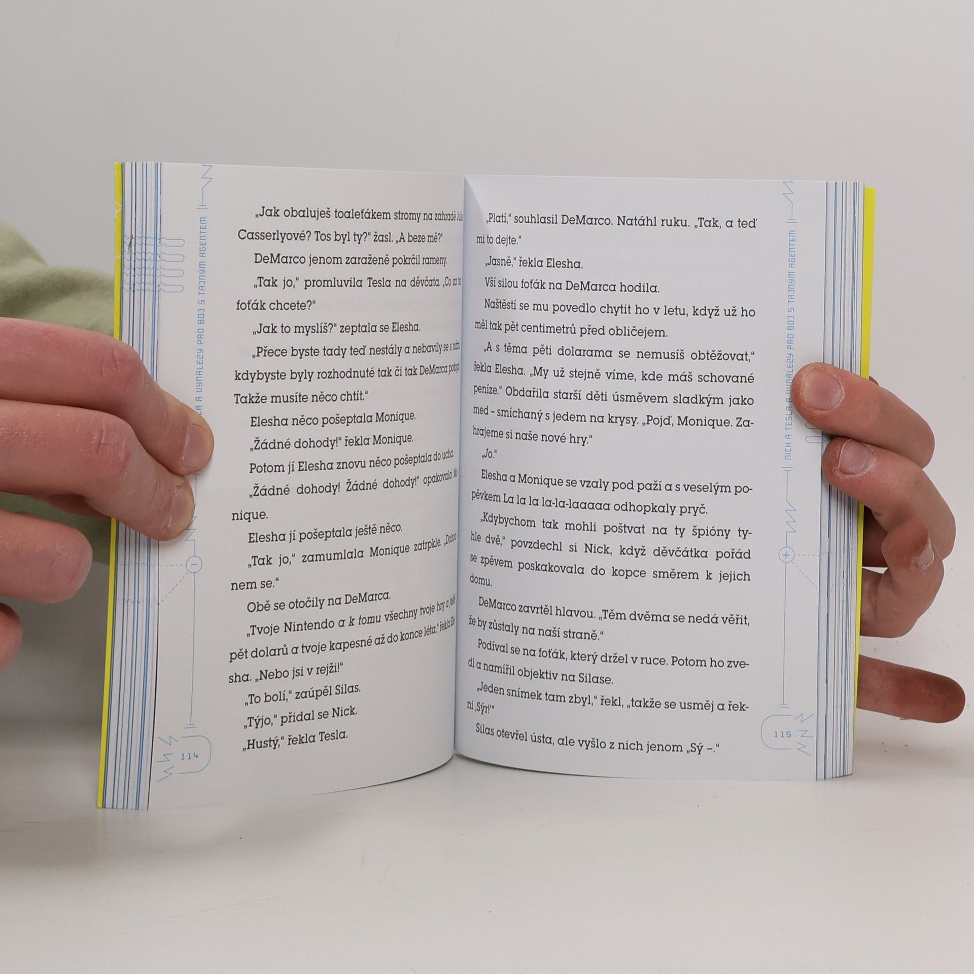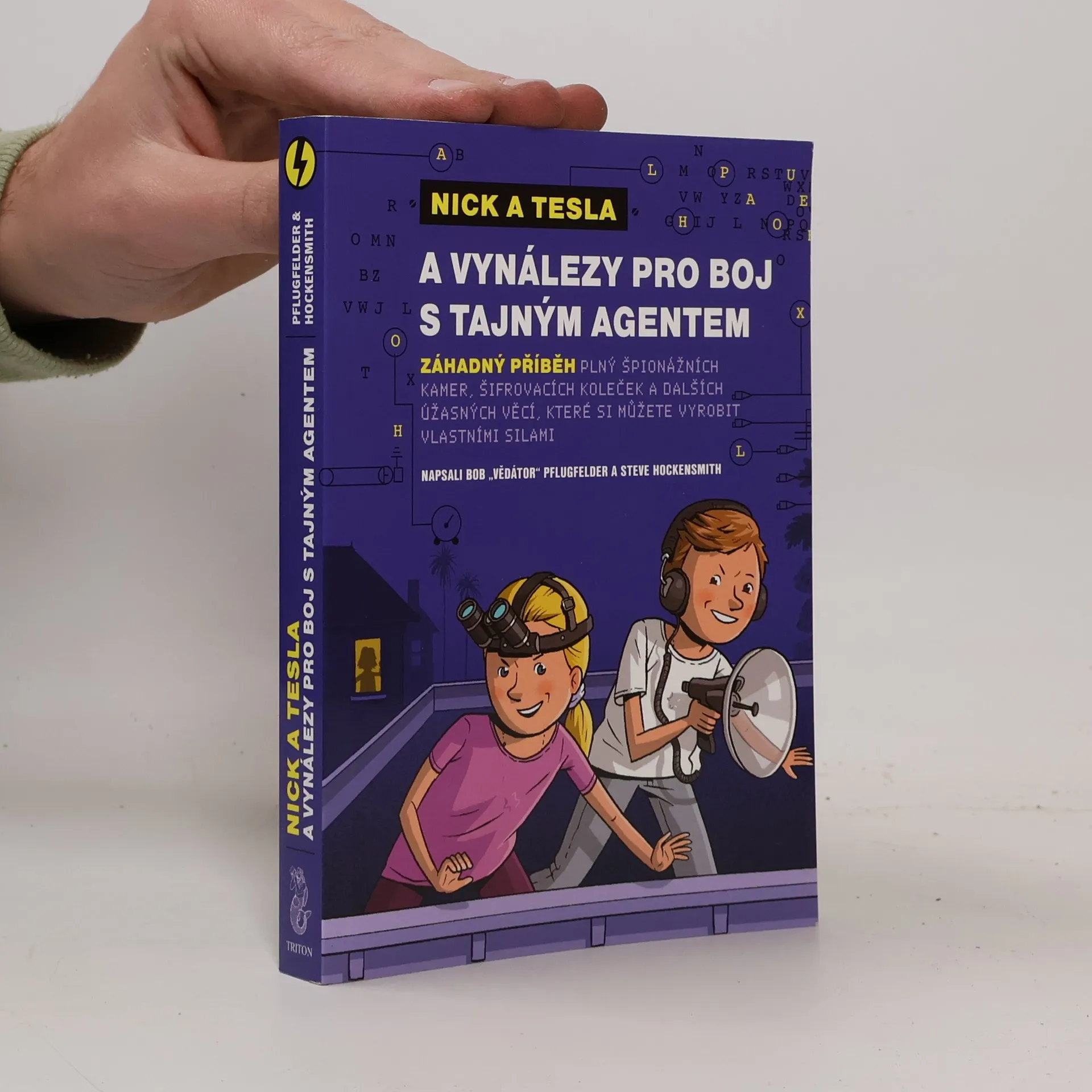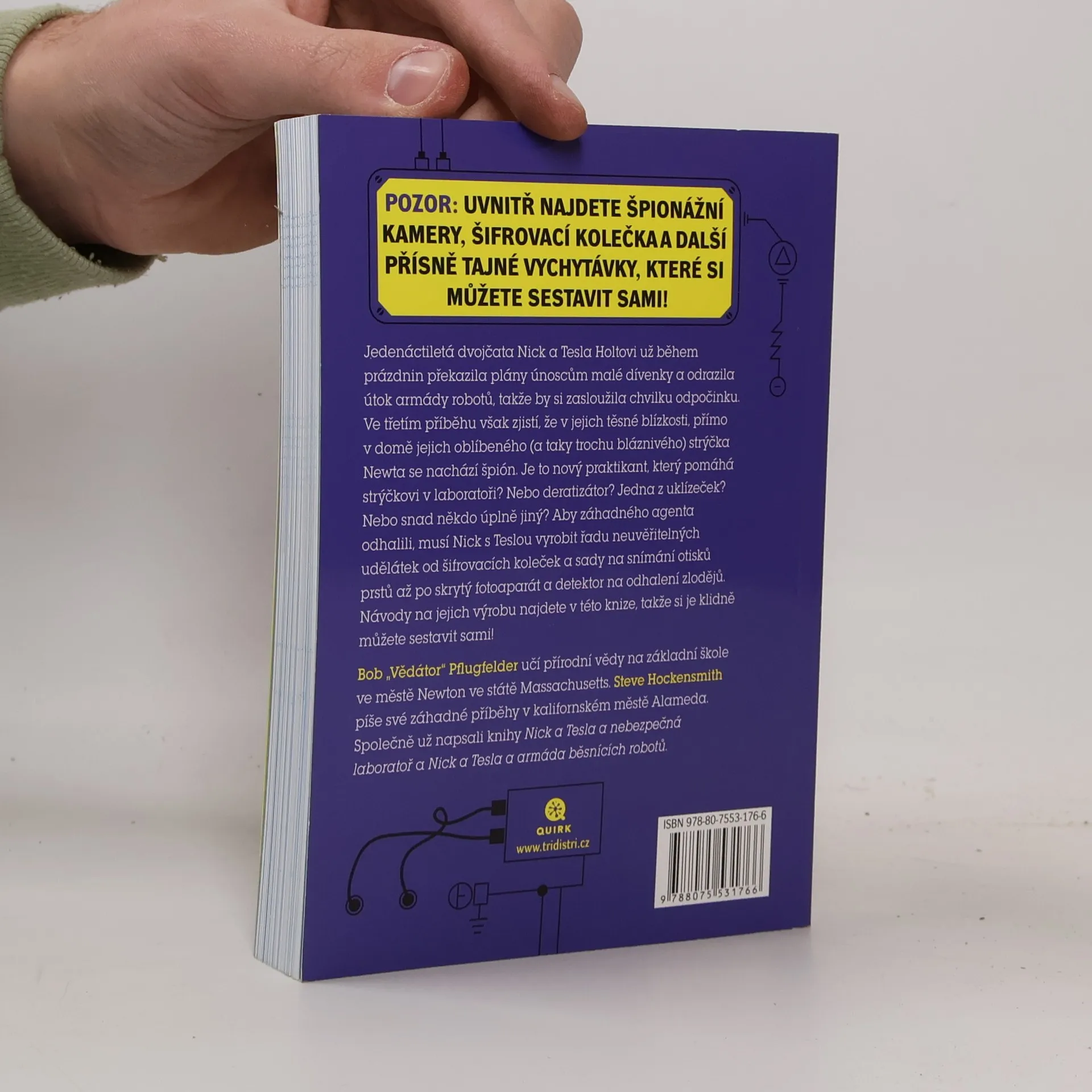 POZOR: UVNITŘ NAJDETE ŠPIONÁŽNÍ KAMERY, ŠIFROVACÍ KOLEČKA A DALŠÍ PŘÍSNĚ TAJNÉ VYCHYTÁVKY, KTERÉ SI MŮŽETE SESTAVIT SAMI! Jedenáctiletá dvojčata Nick a Tesla Holtovi už během prázdnin překazila plány únoscům malé dívenky a odrazila útok armády robotů, takže by si zasloužila chvilku odpočinku. Ve třetím příběhu však zjistí, že v jejich těsné blízkosti, přímo v domě jejich oblíbeného (a taky trochu bláznivého) strýčka Newta se nachází špión. Je to nový praktikant, který pomáhá strýčkovi v laboratoři? Nebo deratizátor? Jedna z uklízeček? Nebo snad někdo úplně jiný? Aby záhadného agenta odhalili, musí Nick s Teslou vyrobit řadu neuvěřitelných udělátek od šifrovacích koleček a sady na snímání otisků prstů až po skrytý fotoaparát a detektor na odhalení zlodějů. Návody na jejich výrobu najdete v této knize, takže si je klidně můžete sestavit sami! Bob „Vědátor“ Pflugfelder učí přírodní vědy na základní škole ve městě Newton ve státě Massachusetts. Steve Hockensmith píše své záhadné příběhy v kalifornském městě Alameda. Společně už napsali knihy Nick a Tesla a nebezpečná laboratoř a Nick a Tesla a armáda běsnících robotů.