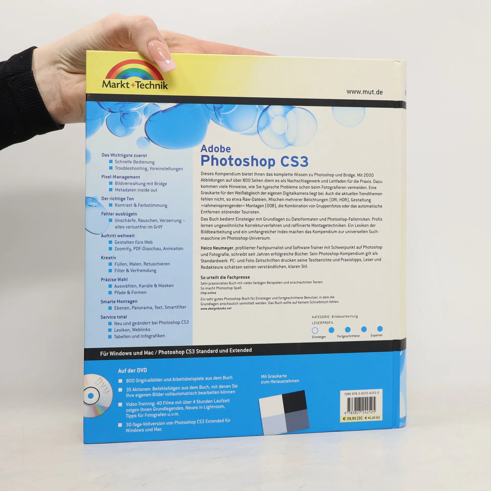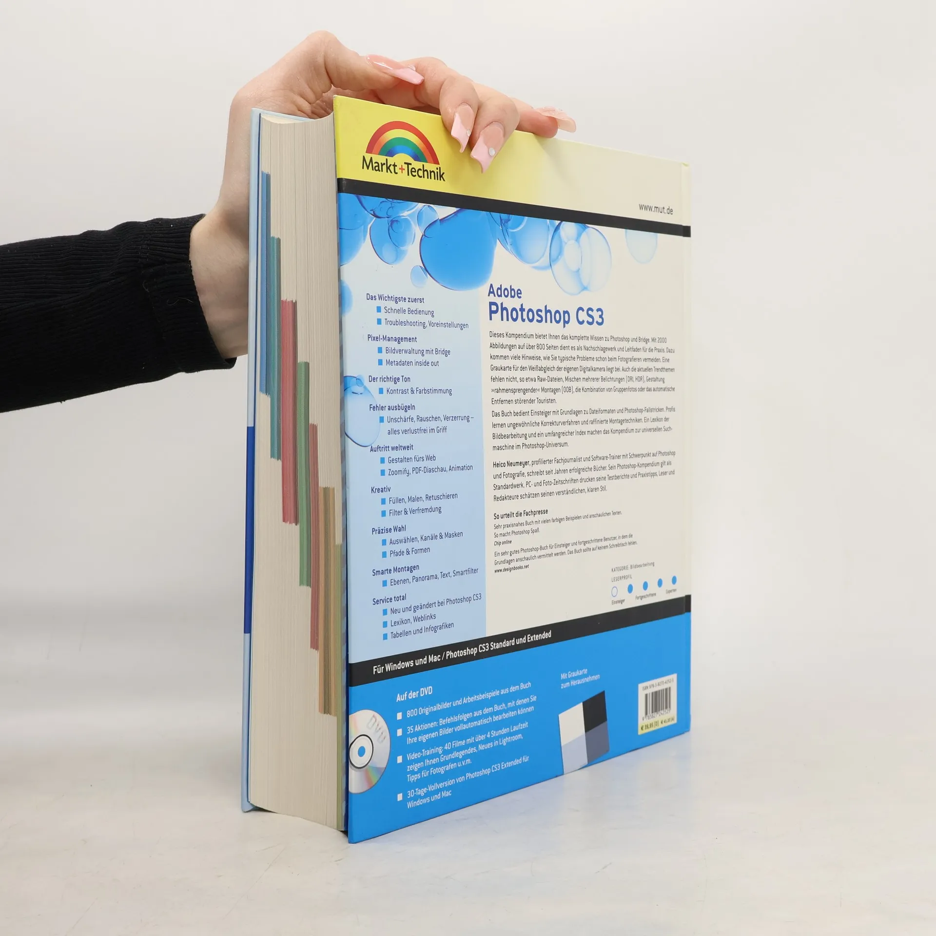 Das Photoshop-Kompendium gilt seit langem als Standardwerk, 2004 erhielt es verdient den deutschen Fotobuchpreis. Zu Photoshop CS3 erscheint auch das Photoshop-Kompendium völlig überarbeitet. Dabei festigt es seinen Ruf als treffsichere Suchmaschine im ausufernden Photoshop-Universum – mit vielen neuen Bildbeispielen und Profitricks, auch zu den wichtigen Funktionen der Programmvariante Photoshop CS3 Extended. Mit üblichem Handbuch-Blabla hält sich das Photoshop-Kompendium nicht lange auf: Das komplett vierfarbige Buch liefert neben Grundlagen tausende wertvolle Praxis-Tipps aus der langjährigen Erfahrung des Photoshop-Autors Heico Neumeyer – immer in erfrischend eingängiger, unterhaltsamer Sprache, und illustriert mit 2000 Bildern und wertvollen Infografiken. Dazu kommen drei Stunden Videotraining und eine Testversion von Photoshop CS3 Extended. Das Buch lädt ein zum kurzweiligen Stöbern, Entdecken, Ausprobieren, Nachschlagen: der perfekte Photoshop-Hausarzt zwischen zwei Buchdeckeln.