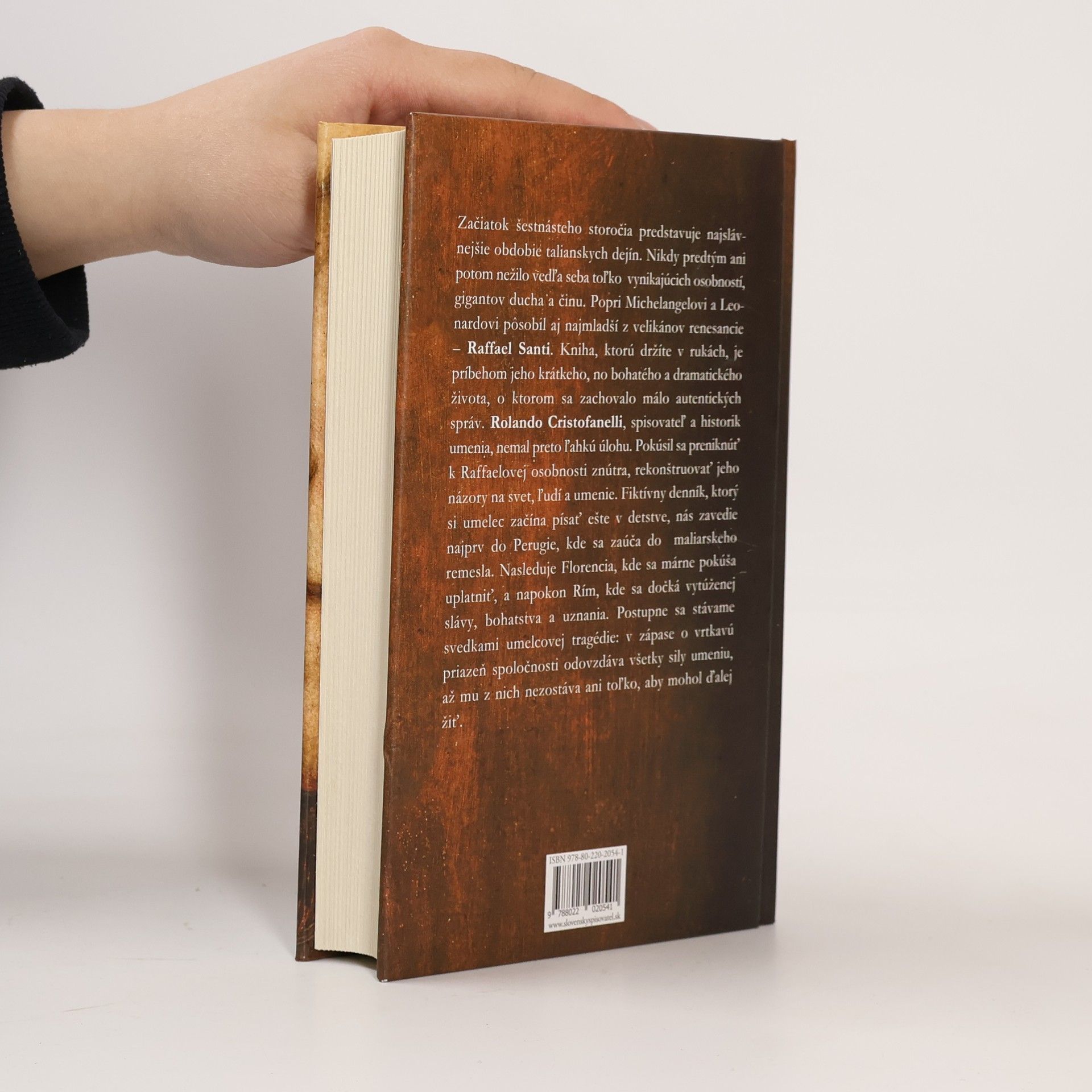 Začiatok šestnásteho storočia predstavuje najslávnejšie obdobie talianskych dejín. Nikdy predtým ani potom nežilo vedľa seba toľko vynikajúcich osobností, gigantov ducha a činu. Popri Michelangelovi a Leonardovi pôsobil aj najmladší z velikánov renesancie – Raffael Santi. Kniha, ktorú držíte v rukách, je príbehom jeho krátkeho, no bohatého a dramatického života, o ktorom sa zachovalo málo autentických správ. Rolando Cristofanelli, spisovateľ a historik umenia, nemal preto ľahkú úlohu. Pokúsil sa preniknúť k Raffaelovej osobnosti znútra, rekonštruovať jeho názory na svet, ľudí a umenie. Fiktívny denník, ktorý si umelec začína písať ešte v detstve, nás zavedie najprv do Perugie, kde sa zaúča do maliarskeho remesla. Nasleduje Florencia, kde sa márne pokúša uplatniť, a napokon Rím, kde sa dočká vytúženej slávy, bohatstva a uznania. Postupne sa stávame svedkami umelcovej tragédie: v zápase o vrtkavú priazeň spoločnosti odovzdáva všetky sily umeniu, až mu z nich nezostáva ani toľko, aby mohol ďalej žiť.