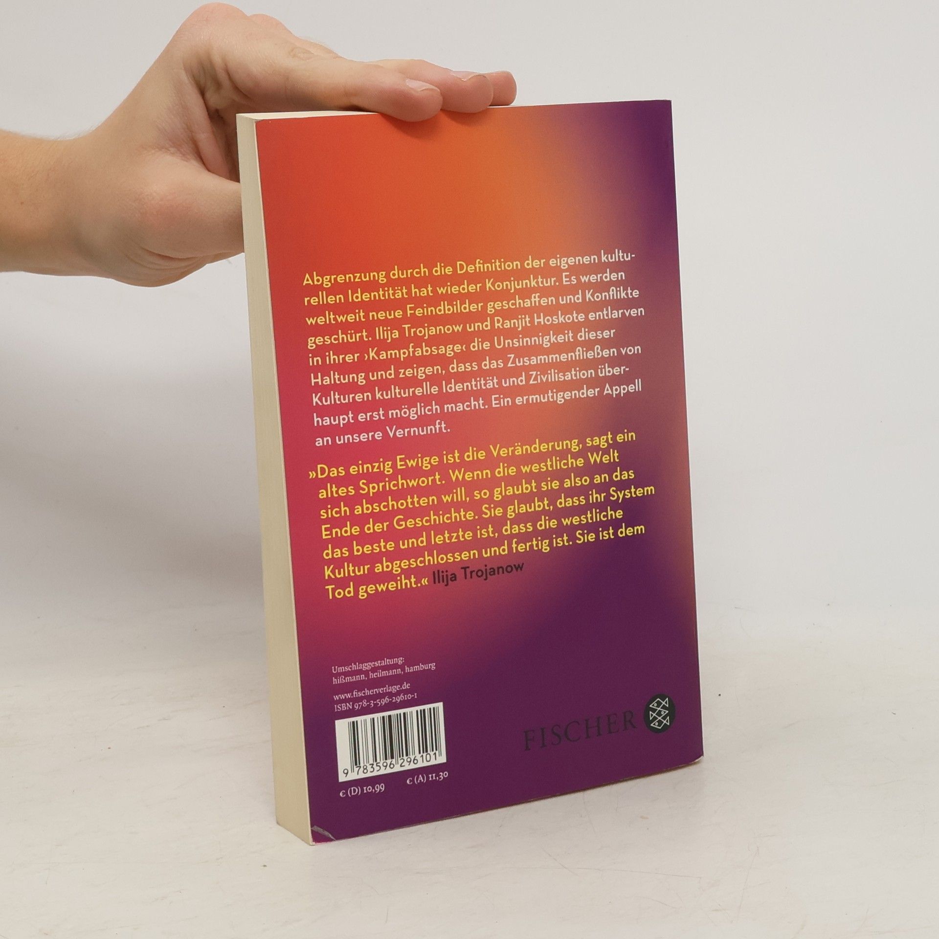 Bestseller-Autor Ilija Trojanow und der indische Dichter und Kulturkritiker Ranjit Hoskote haben mit ›Kampfabsage: Kulturen bekämpfen sich nicht - sie fließen zusammen‹ eine radikale Streitschrift gegen neue Feindbilder verfasst. Sie wollten damit einst Samuel Huntigtons These vom »Kampf der Kulturen« eine Antwort geben, doch das Thema ist aktueller denn je. Abgrenzung durch die Definition der eigenen kulturellen Identität hat leider wieder Konjunktur. So werden weltweit neue Feindbilder geschaffen und Konflikte geschürt. Die Autoren entlarven die Unsinnigkeit dieser Haltung und rücken den Propheten eines kulturellen Weltkriegs die Köpfe zurecht. Sie zeigen, dass das Zusammenfließen von Kulturen kulturelle Identität und Zivilisation überhaupt erst möglich macht. Ein ermutigender Appell an unsere Vernunft. Trojanow und Hoskote haben das erstmals 2007 erschienene Buch aktualisiert und ergänzt; Pankaj Mishra hat ein Nachwort zu der Neuausgabe verfasst. »Das einzig Ewige ist die Veränderung, sagt ein altes Sprichwort. Wenn die westliche Welt sich abschotten will, so glaubt sie also an das Ende der Geschichte. Sie glaubt, dass ihr System das beste und letzte ist, dass die westliche Kultur abgeschlossen und fertig ist. Sie ist dem Tod geweiht.« Ilija Trojanow