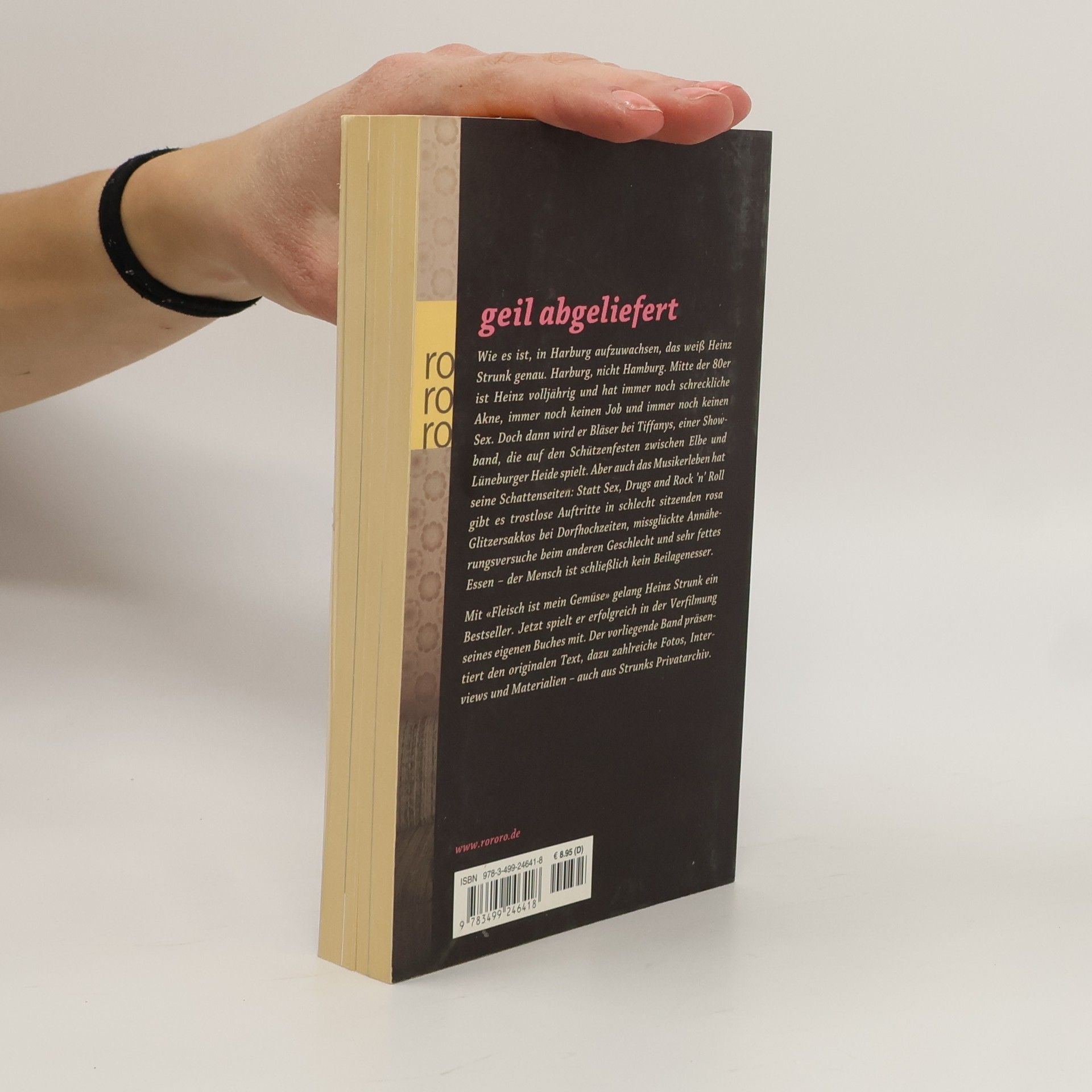 Geil abgeliefert Wie es ist, in Harburg aufzuwachsen, das weiß Heinz Strunk genau. Harburg, nicht Hamburg. Mitte der 80er ist Heinz volljährig und hat immer noch schreckliche Akne, immer noch keinen Job und immer noch keinen Sex. Doch dann wird er Bläser bei Tiffanys, einer Showband, die auf den Schützenfesten zwischen Elbe und Lüneburger Heide spielt. Aber auch das Musikerleben hat seine Schattenseiten: Statt Sex, Drugs and Rock’n’Roll gibt es trostlose Auftritte in schlecht sitzenden rosa Glitzersakkos bei Dorfhochzeiten, missglückte Annäherungsversuche ans andere Geschlecht und sehr fettes Essen – der Mensch ist schließlich kein Beilagenesser. Mit „Fleisch ist mein Gemüse“ gelang Heinz Strunk ein Bestseller. Jetzt spielt er erfolgreich in der Verfilmung seines eigenen Buches mit. Der vorliegende Band präsentiert den originalen Text, dazu zahlreiche Fotos, Interviews und Materialien – auch aus Strunks Privatarchiv.