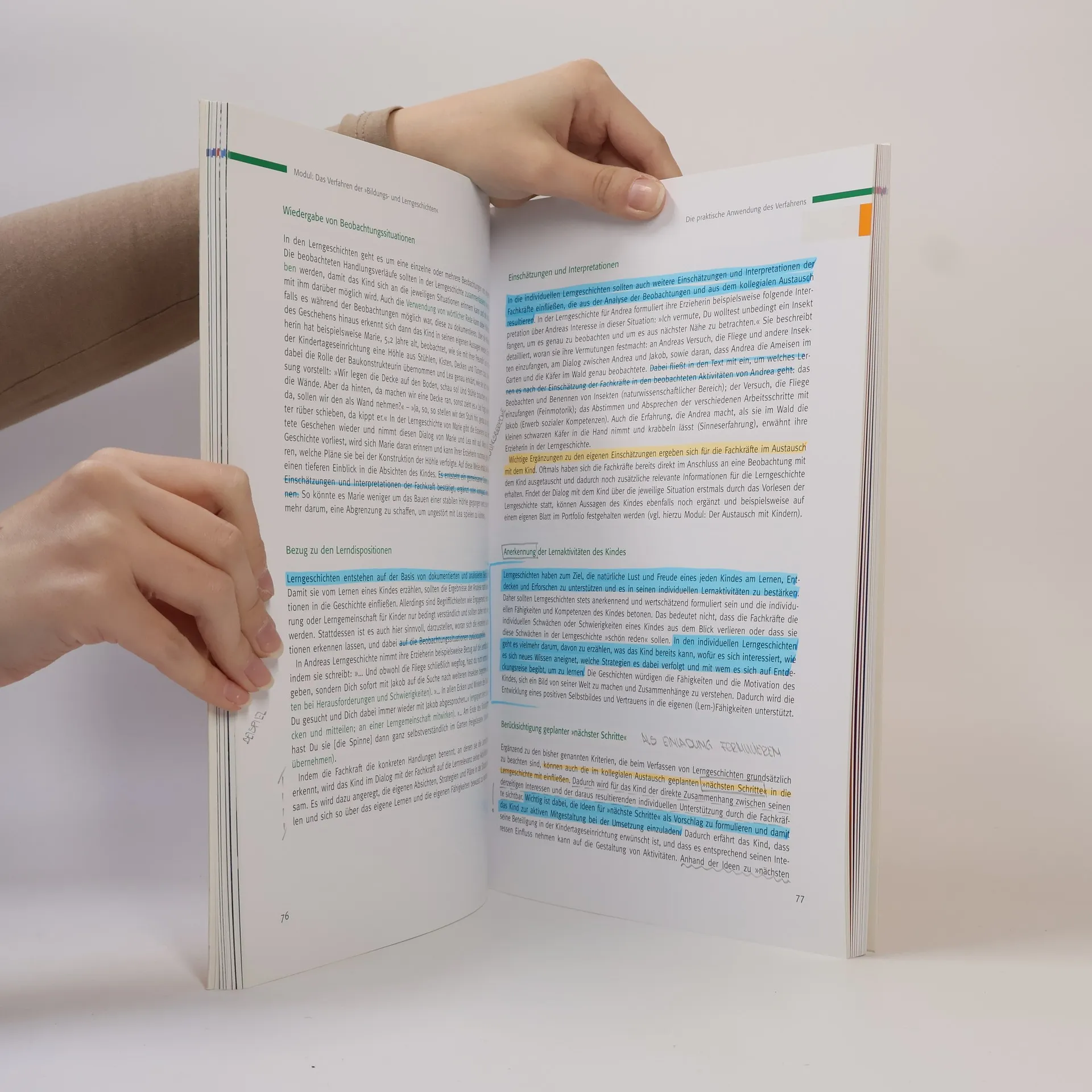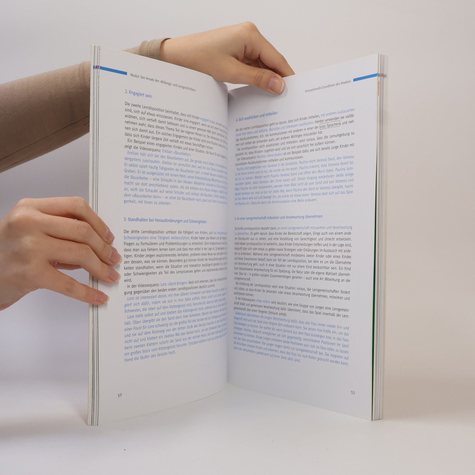 Die 'Bildungs- und Lerngeschichten' setzen an den Stärken und Kompetenzen jedes einzelnen Kindes an und beziehen sowohl die Kinder als auch ihre Eltern mit ein. Dem Verfahren liegt das Konzept der Lerndispositionen zugrunde, das von Margaret Carr in Neuseeland entwickelt wurde. Dabei werden der Beitrag des Kindes und die Bedeutung der situativen Bedingungen für sein Lernen gleichermaßen berücksichtigt. Anhand von acht flexibel einsetzbaren Modulen können die grundlegenden Inhalte des Verfahrens erarbeitet und durch praktische Übungen und Reflexionen vertieft werden. Die vorliegenden Materialien bieten Fortbildnerinnen und pädagogischen Fachkräften alle nötigen Grundlagen, um das Verfahren in der Praxis einzuführen und umzusetzen.