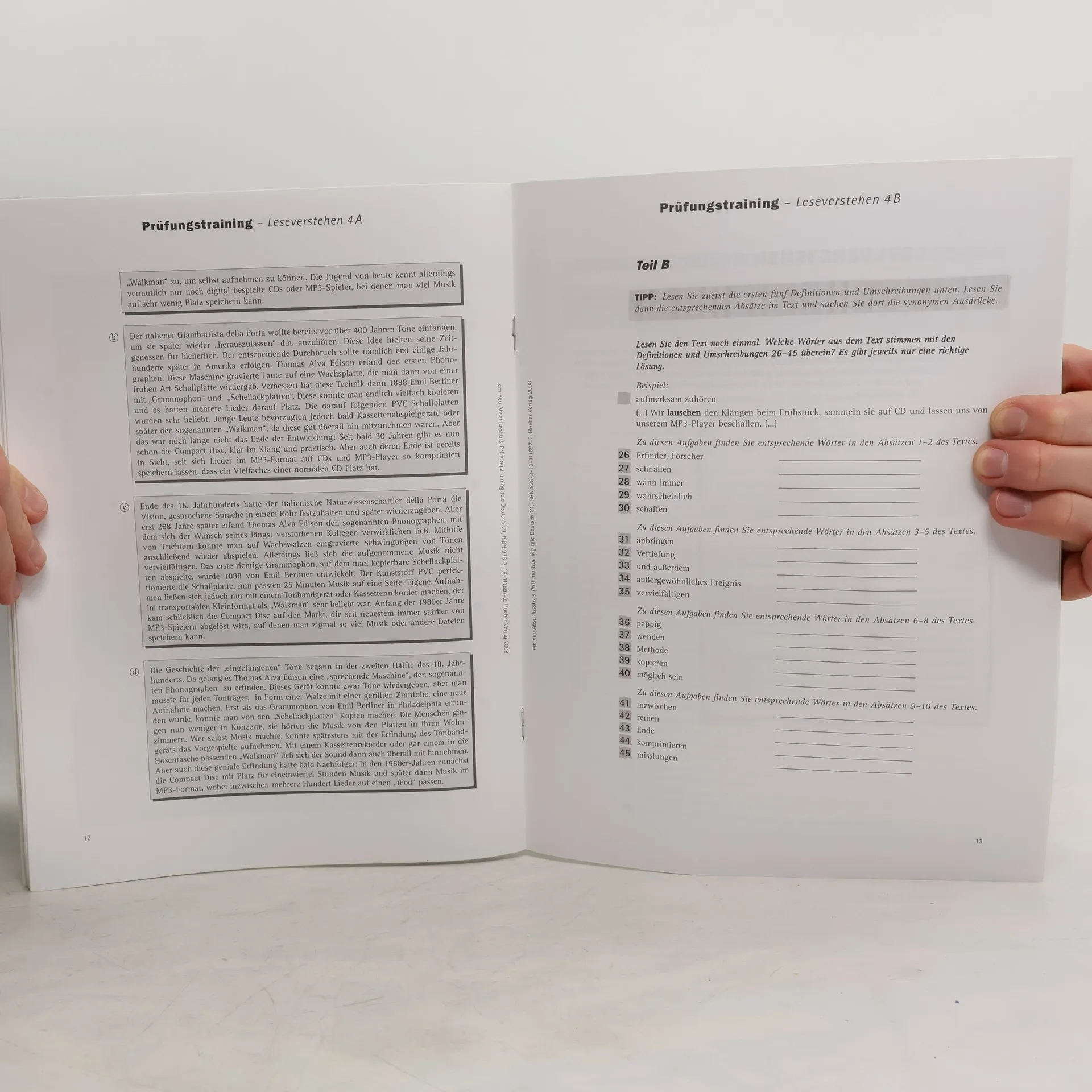 Das Arbeitsbuch zum Kursbuch (BA 4/05; kaum veränderte Neuauflage in dieser Nr.) bietet vertiefende Übungen und einen Lernwortschatz zu jeder Lektion des Kursbuches, sowie Übungen analog zu den Bausteinen Lesen, Hören, Schreiben, Sprechen, Wortschatz und Grammatik. Im Anhang die Lösungen und ein Prüfungstraining für das Zertifikat C1. In das Arbeitsbuch integriert ist eine Lerner-CD mit den Hörtexten des Arbeitsbuches. Das Buch eignet sich zum selbstständigen Üben zu Hause wie auch für den Unterricht. In jedem Fall dem Kursbuch hinzufügen