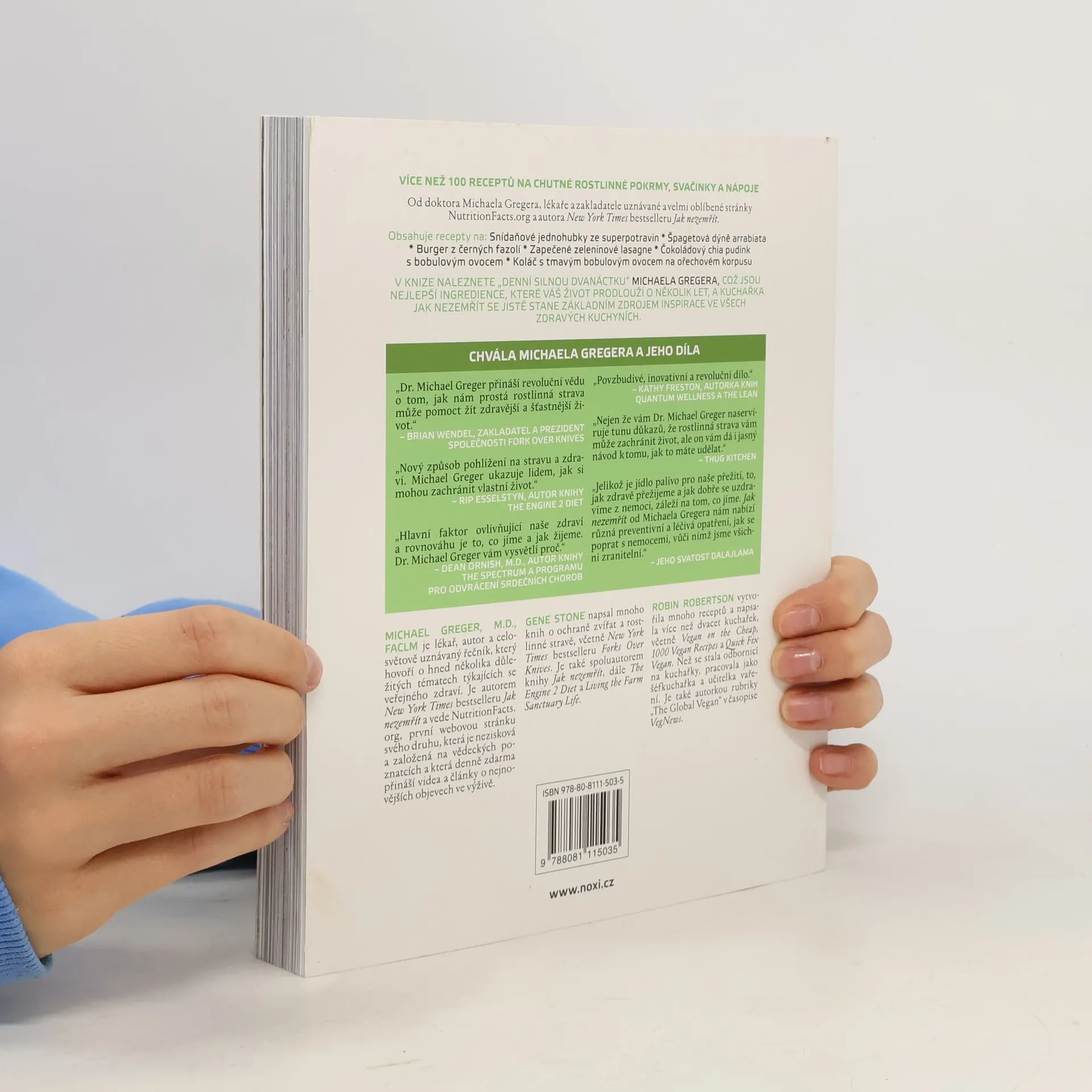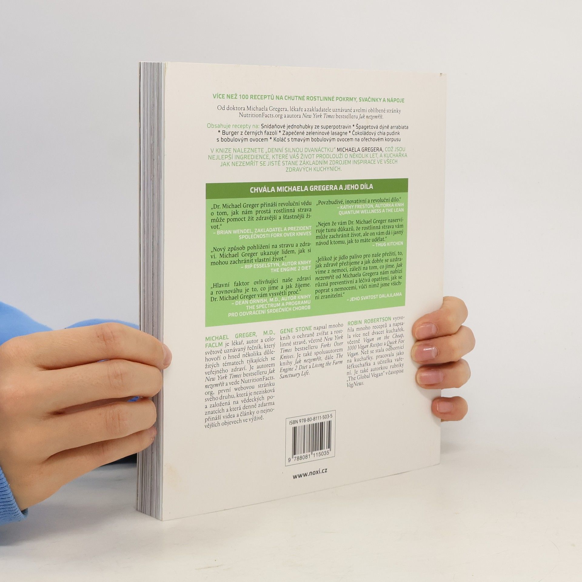 V knize naleznete „denní silnou dvanáctku“ Michaela Gregera, což jsou nejlepší ingredience, které váš život prodlouží o několik let, a kuchařka Jak nezemřít se jistě stane základním zdrojem inspirace ve všech zdravých kuchyních. MICHAEL GREGER, M.D., FACLM je lékař, autor a celosvětově uznávaný řečník, který hovoří o hned několika důležitých tématech týkajících se veřejného zdraví. Je autorem New York Times bestselleru Jak nezemřít a vede NutritionFacts. org, první webovou stránku svého druhu, která je nezisková a založená na vědeckých poznatcích a která denně zdarma přináší videa a články o nejnovějších objevech ve výživě. GENE STONE napsal mnoho knih o ochraně zvířat a rostlinné stravě, včetně New York Times bestselleru Forks Over Knives. Je také spoluautorem knihy Jak nezemřít, The Engine 2 Diet a Living the Farm Sanctuary Life. ROBIN ROBERTSON vytvořila mnoho receptů a napsala více než dvacet kuchařek, včetně Vegan on the Cheap, 1000 Vegan Recipes a Quick Fix Vegan. Než se stala odbornicí na kuchařky, pracovala jako šéfkuchařka a učitelka vaření. Je také autorkou rubriky „The Global Vegan“ v časopise VegNews.