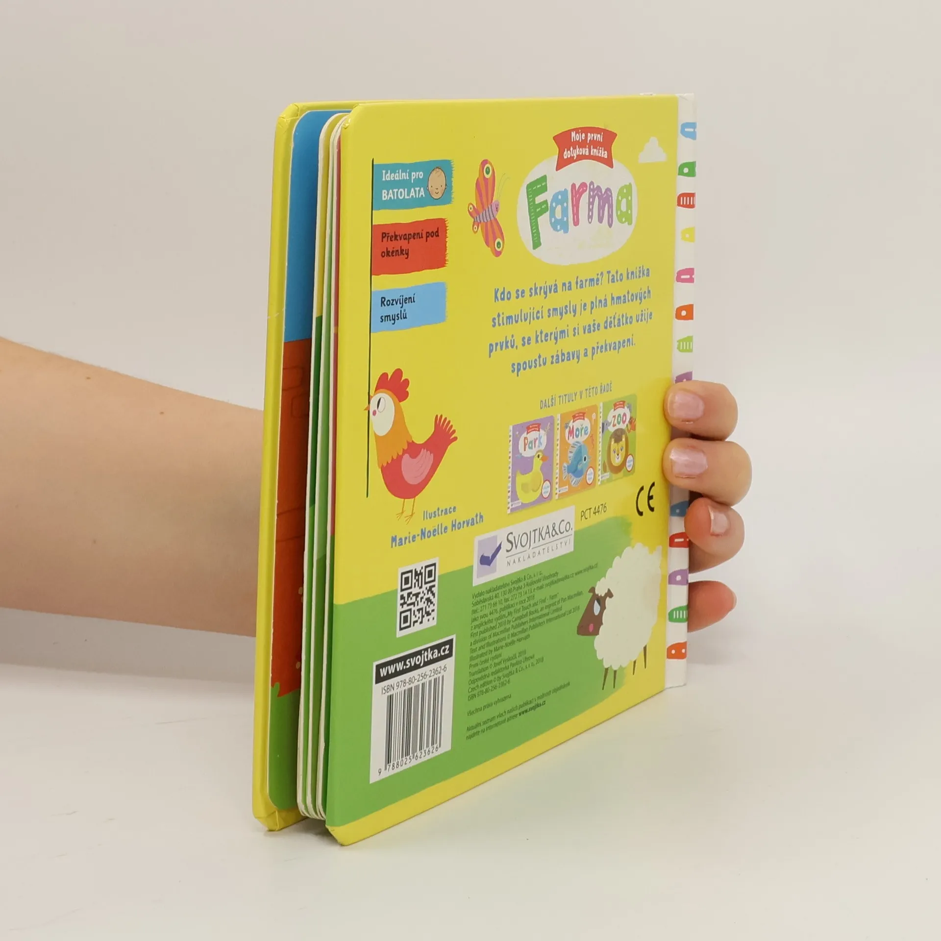 Dotyková knížka se zvířátky na farmě je ideální pomůcka pro batolata, která díky hmatovým prvkům v knize procvičí svou jemnou motoriku. Zjisti, která zvířátka žijí na farmě, a poznávej je dotykem. Které zvířátko je huňaté, chlupaté nebo hebounké? Kdo se rád rochní v bahně a kdo vysedává na seně? Výřezy s hmatovými prvky stimulují a rozvíjejí smysly vašeho dítěte.