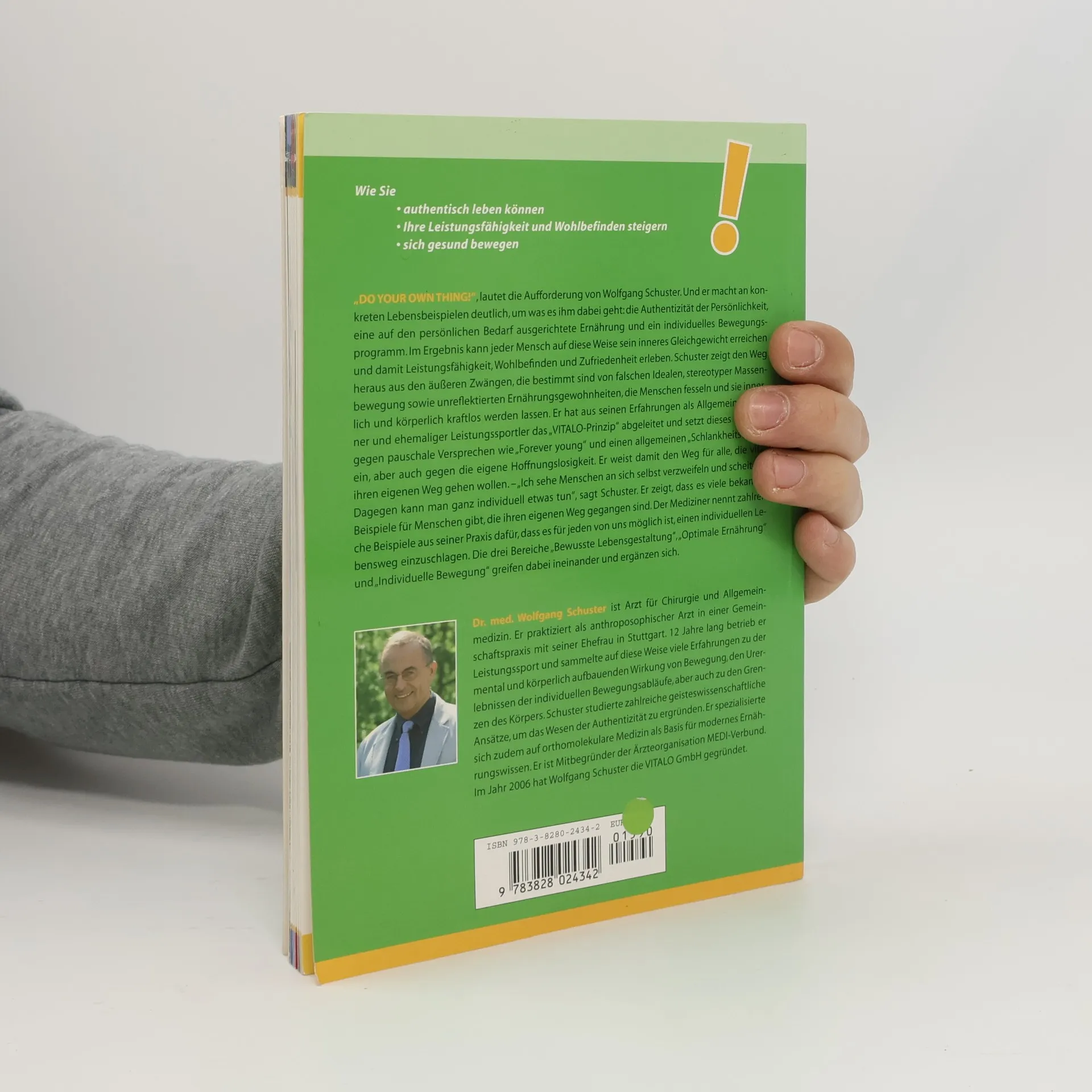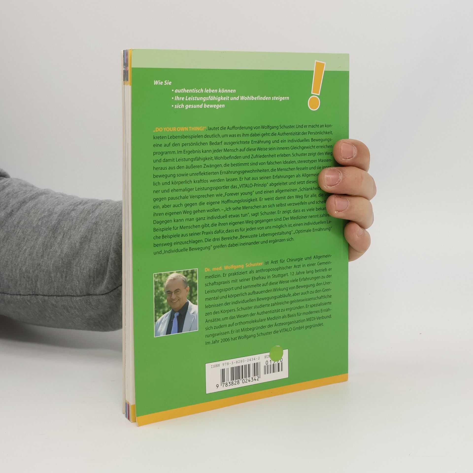 „DO YOUR OWN THING“, lautet die Aufforderung von Wolfgang Schuster. Und er macht an konkreten Lebensbeispielen deutlich, um was es ihm dabei geht: die Authentizität der Persönlichkeit, eine auf den persönlichen Bedarf ausgerichtete Ernährung und ein individuelles Bewegungsprogramm. Im Ergebnis kann jeder Mensch auf diese Weise sein inneres Gleichgewicht erreichen und damit Leistungsfähigkeit, Wohlbefinden und Zufriedenheit erleben. Schuster zeigt den Weg heraus aus den äußeren Zwängen, die bestimmt sind von falschen Idealen, stereotyper Massenbewegung sowie unreflektierten Ernährungsgewohnheiten. Er hat aus seinen Erfahrungen als Allgemeinmediziner und ehemaliger Leistungssportler das „VITALO-Prinzip“ abgeleitet und setzt dieses bewusst gegen pauschale Versprechen wie „Forever young“ und einen allgemeinen „Schlankheitswahn“ ein, aber auch gegen die eigene Hoffnungslosigkeit. Schuster weist damit den Weg für alle, die vital ihren eigenen Weg gehen wollen