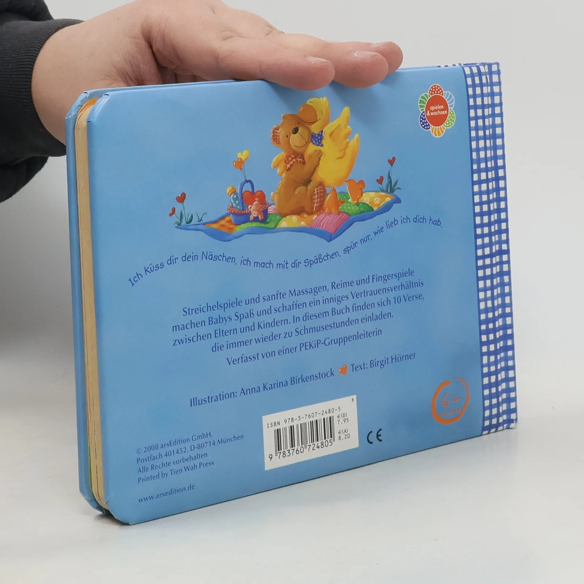 Ein Buch für Eltern und Babys: Hier werden Reime und Kinderlieder ansprechend für beide präsentiert. Professionelle Anleitungen zur Babymassage und Streichelspielen nach PEKIP unterstützen die Eltern im Umgang mit den Kindern. Die Reime sind auch für Massagen bei Neugeborenen zu empfehlen. Das Bilderbuch bietet leicht umzusetzenden Anregungen vom morgendlichen Begrüßungsküsschen bis zum beruhigenden abendlichen Einschlafgedicht. Diese Schmuserituale geben Babys eine innere Sicherheit, die wichtig ist für ihre Entwicklung. Durch die farbenfrohen Illustrationen von Anna Karina Birkenstock und durch die besondere Ausstattung mit dem wattierten Umschlag wird „Was kitzelt dich am Näschen?“ zu einem „must-have“ in jedem Kinderzimmer. „Was macht das rote Käferlein? Krabbelt es an deinem Bein? Und der kleine Schmusebär? Kommt zum Kraulen zu dir her… Zehn süße Verse als Anregung zu ersten Babymassagen und Streichelspielen bietet dieses kleine Werk Müttern und Vätern mit Babys ab 3 Monaten. Mit Spiel- und Schmusebildern von Teddys, Entchen usw. liebevoll illustriert - ideal für Kuschelstunden (fast) von Anfang an.“ Dirk Müller, Familie & CO