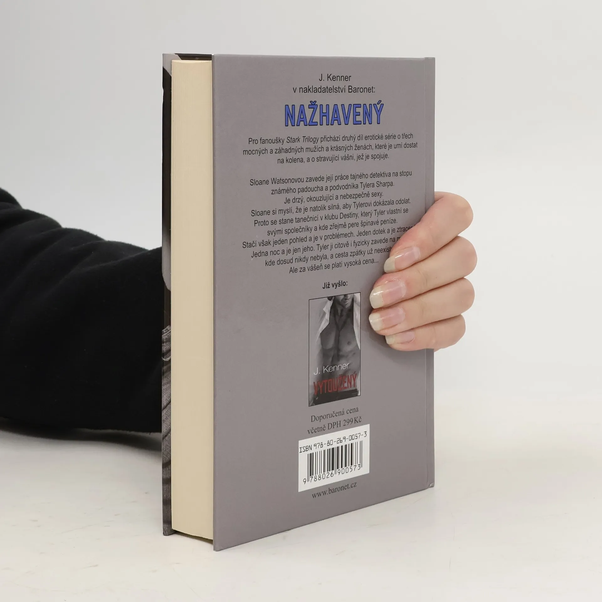 Pro fanoušky Padesáti odstínů šedi a především Stark Trilogy přichází další nová erotická série o třech mocných a záhadných mužích a krásných ženách, které je umí dostat na kolena, a o stravující vášni, která je spojuje. Ve druhém dílu s názvem Nažhavený zavede Sloane Watsonovou její práce tajného detektiva na stopu známého padoucha a podvodníka Tylera Sharpa. Je drzý, okouzlující a nebezpečně sexy. Vyrostla jsem ve víře, že existuje černá a bílá, dobro a zlo - a že některé hranice nikdy nesmím překročit. Sloane si myslí, že je tak silná, aby Tylerovi dokázala odolat. Proto se stane exotickou tanečnicí v klubu Destiny, který Tyler vlastní se svými společníky a kde pere špinavé peníze. Měla jsem mít víc rozumu a nevěřit mu, neměla jsem riskovat svoje srdce. Stačil však jeden pohled - a byla v problémech. Jeden dotek - a byla ztracená. Jedna noc - a byla jen jeho. Tyler ji citově i fyzicky zavede na místa, kde dosud nikdy nebyla, a cesta zpátky už neexistuje. Ale za vášeň se platí vysoká cena…