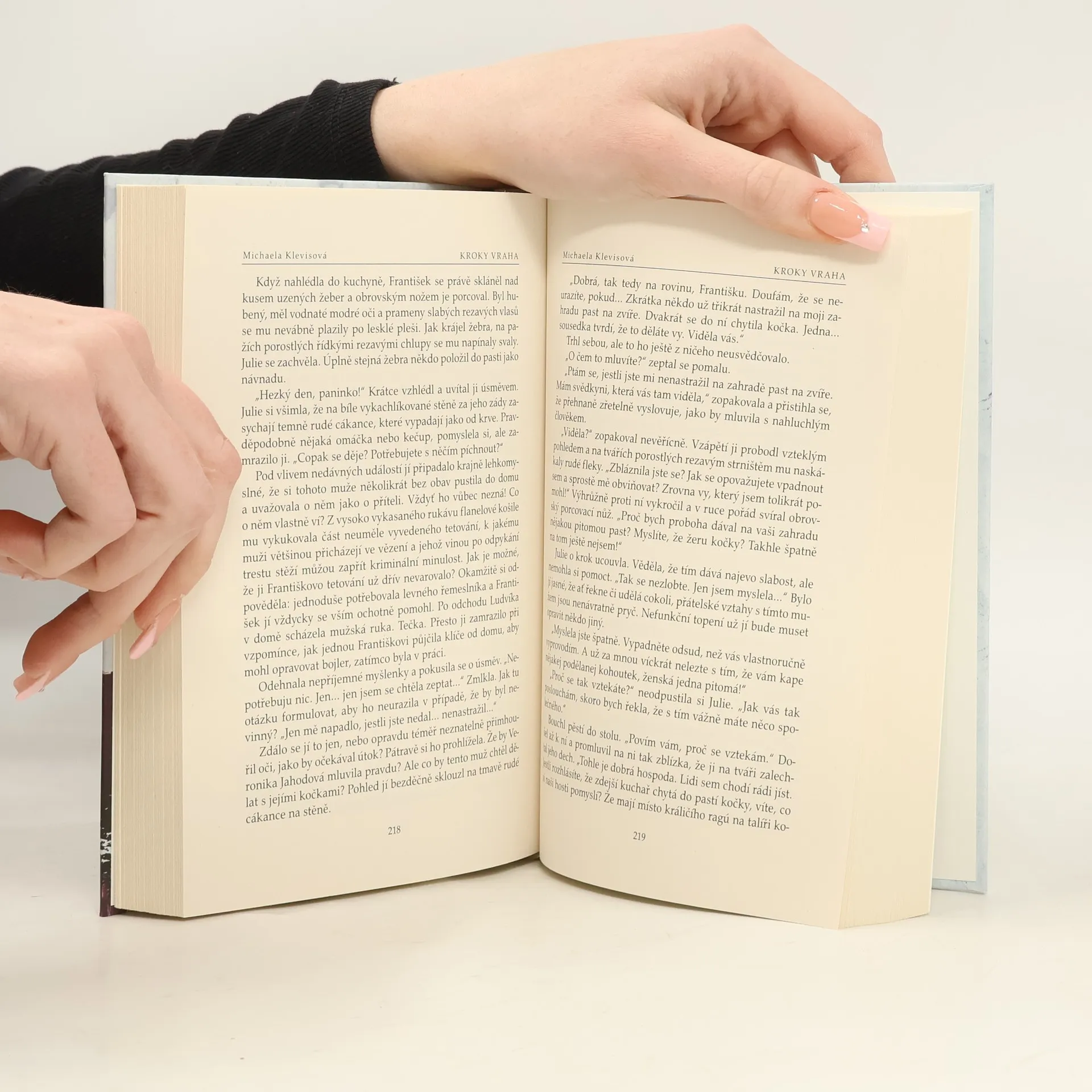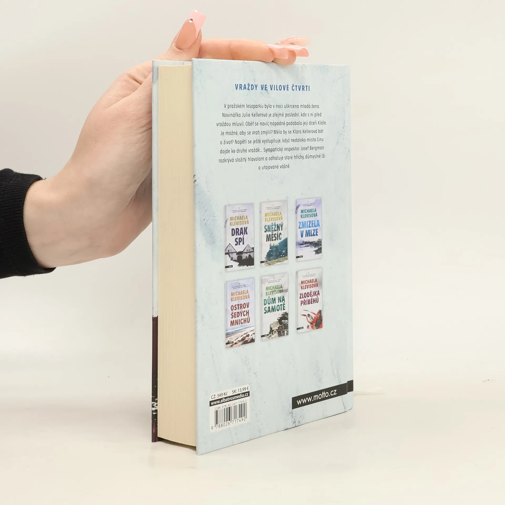 Nový případ inspektora Josefa Bergmana! Nový případ inspektora Josefa Bergmana! V pražském lesoparku byla v noci uškrcena mladá žena. Novinářka Julie Kellerová je zřejmě poslední, kdo s ní před vraždou mluvil. Oběť se navíc nápadně podobala její dceři Kláře. Je možné, aby se vrah zmýlil? Měla by se Klára Kellerová bát o život? Napětí se ještě vystupňuje, když nedaleko místa činu dojde ke druhé vraždě… Sympatický inspektor Josef Bergman rozkrývá složitý hlavolam a odhaluje staré hříchy, důmyslné lži a utajované vášně. Michaela Klevisová (*1976 v Praze) Vystudovala žurnalistiku na Fakultě sociálních věd Univerzity Karlovy a od roku 1997 pracuje jako novinářka. Jejím největším koníčkem je cestování a psaní reportáží z míst, která navštívila. Její prvotina Kroky vraha (2007) sklidila mimořádný úspěch a dostala za ni Cenu Jiřího Marka. Úspěšný byl i její druhý detektivní román Zlodějka příběhů (2009) a také třetí, Dům na samotě (2011), který jí vynesl opět Cenu Jiřího Marka. Zatím posledním detektivním románem je Ostrov šedých mnichů (2015). Kromě detektivních příběhů vydala také dvě knihy příběhů o kočkách Čekání na kocoura (2012)a Kocour z Montmartru (2013).
