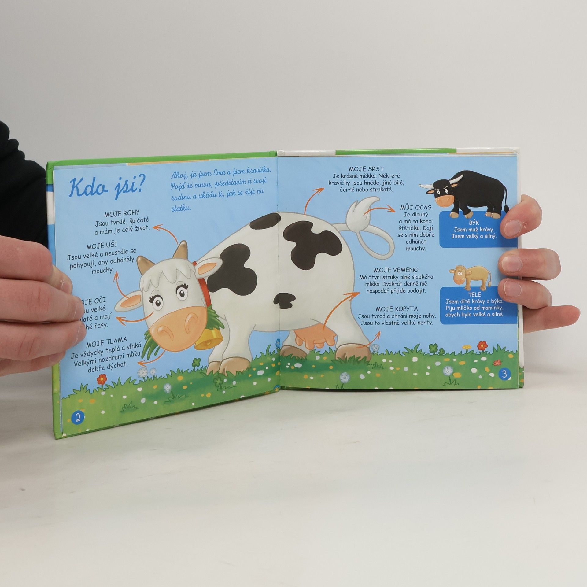 Kniha představuje krávu v jejím přirozeném prostředí, jak vypadá, jak se nazývají její části těla, co jí, kde bydlí. Dále představuje různá plemena. Na konci knihy jsou dvě krátké pohádky.