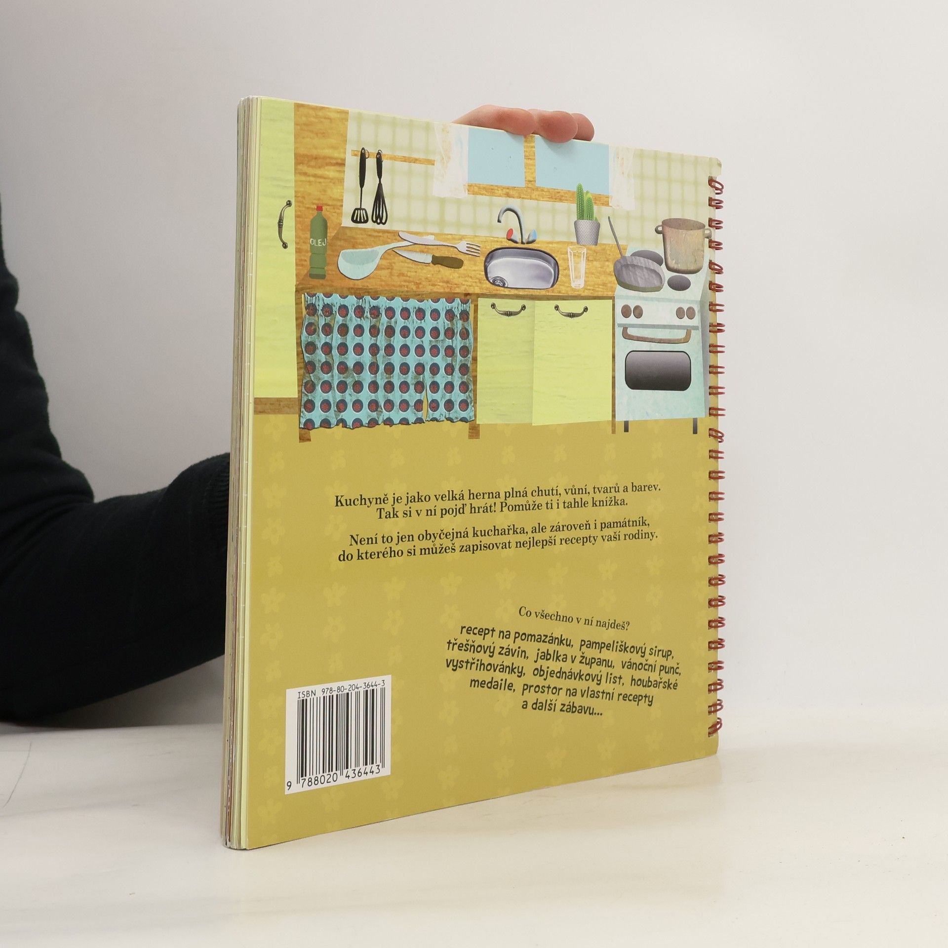 Kuchyně je jako herna plná barev, chutí a vůní a dají se v ní vykouzlit neobyčejné věci. Ještě zábavnější bude takové kouzlení za pomoci originálního kuchařského zápisníku. V jeho jednotlivých částech rozdělených podle ročních období se totiž neukrývají jen hotové návody na jednoduchá, ale chutná jídla (například na výtečný třešňový závin, tvarohovou pomazánku, pampeliškový sirup, dětský vánoční punč aj.), která děti dokážou vyrobit samy téměř bez pomoci, ale také možnost zapisovat si tradiční recepty maminek, tatínků, babiček či tetiček, jmenovky na sváteční stůl, nebo třeba deník hrachového lusku. Zkrátka, s touhle knížkou si v kuchyni užijete zábavu od jara až do zimy a navíc vám z ní časem vznikne neopakovatelná kuchařka!