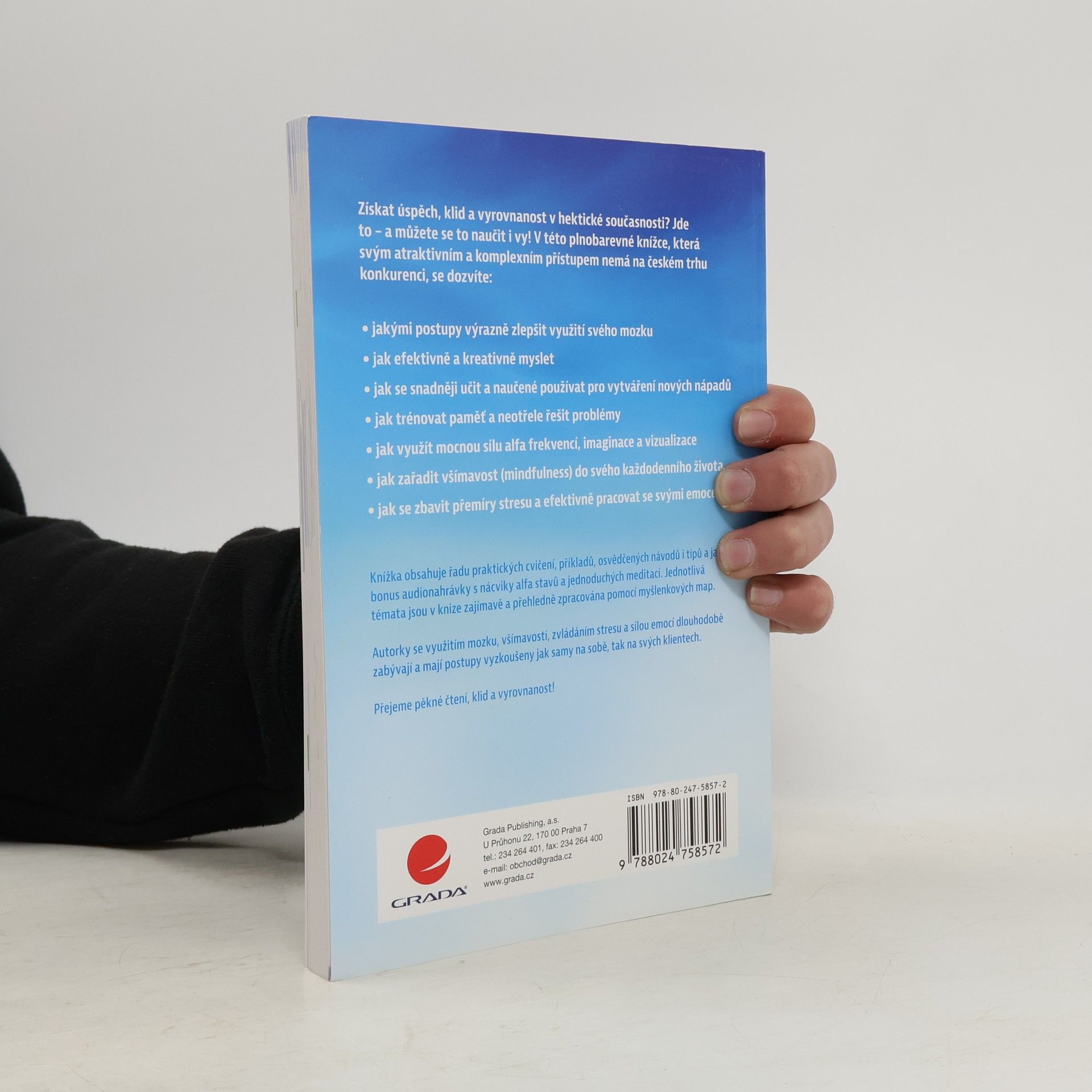 Pokud si myslíte, že v dnešní hektické současnosti nelze být úspěšný, a zároveň žít harmonicky a v klidu, pak si přečtěte tuto knihu. Ukážeme vám, že to možné je. V této plnobarevné knížce, která svým atraktivním a komplexním přístupem nemá na českém trhu konkurenci, se dozvíte: jakými postupy výrazně zlepšit využití svého mozku jak efektivně a kreativně myslet jak se snadněji učit se a naučené používat pro vytváření nových nápadů jak trénovat paměť a neotřele řešit problémy jak využít mocnou sílu alfa frekvencí, imaginace a vizualizace jak zařadit všímavost (mindfulness) do svého každodenního života jak se zbavit přemíry stresu a efektivně pracovat se svými emocemi Jednotlivá témata jsou v knize zajímavě a přehledně zpracována pomocí myšlenkových map. Knížka obsahuje řadu praktických cvičení, příkladů, osvědčených návodů i tipů a jako bonus audionahrávky s nácviky alfa stavů a jednoduchých meditací (odkazy na stažení naleznete v tištěné knize). Autorky se využitím mozku, všímavostí, zvládáním stresu a silou emocí dlouhodobě zabývají a mají postupy vyzkoušeny jak samy na sobě, tak na svých klientech.