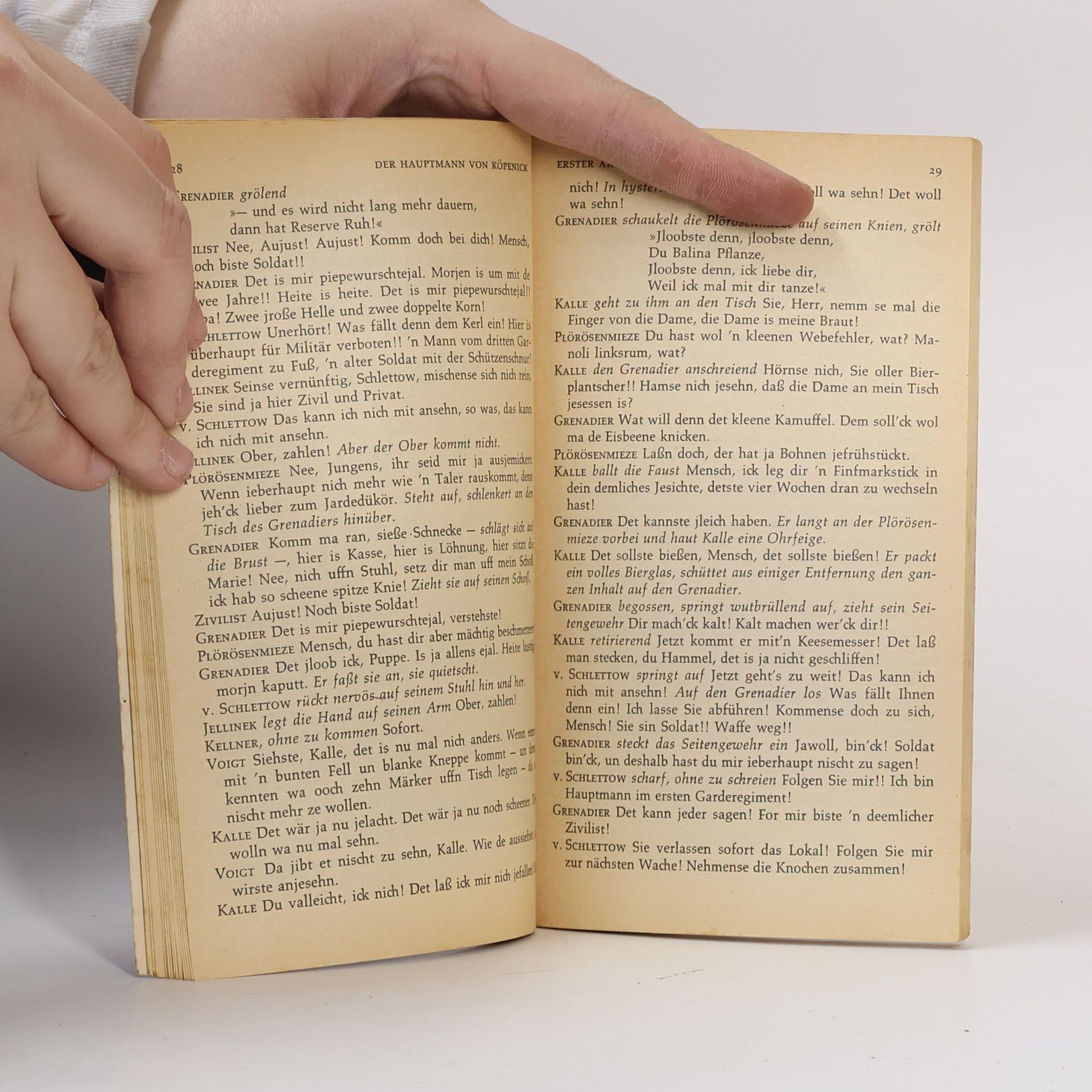 "Ein als Hauptmann verkleideter Mensch führte gestern eine von Tegel kommende Abteilung Soldaten nach dem Köpenicker Rathaus, ließ den Bürgermeister verhaften, beraubte die Gemeindekasse und fuhr in einer Droschke davon." So zu lesen am 17. Oktober 1906 in den Berliner Zeitungen. Dieser Mensch hieß Wilhelm Voigt. In jungen Jahren war der Schustergeselle aus Not mit dem Gesetz in Konflikt geraten. 15 Jahre Zuchthaus waren die Strafe dafür, daß er die Reichspost um 300 Mark geschädigt hatte: Er geriet in den Teufelskreis der Bürokratie. Ohne ordentliche Abmeldung fand er nirgends Arbeit, ohne Arbeitsnachweis erhielt er keine Anmeldung. Voigt wird wieder straffällig; mit 56 Jahren hat er mehr als 30 Jahre seines Lebens im Zuchthaus verbracht. In diesem Augenblick seines Lebens stößt er auf jene Uniform im Trödlerladen in der Berliner Grenadierstraße, die von nun an sein weiteres Schicksal bestimmen wird.Dieses Deutsche Märchen erschien zum erstenmal 1931; es ist heute eines der bekanntesten Stücke Zuckmayers. Die Verfilmung, mit Heinz Rühmann in der Hauptrolle, ist vielen Zuschauern unvergeßlich.