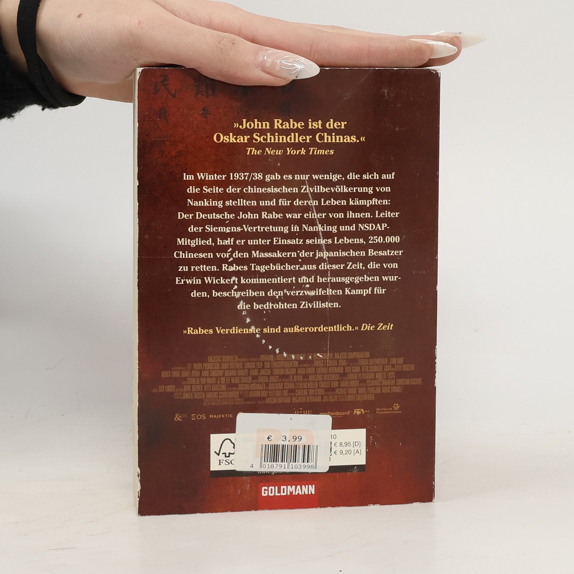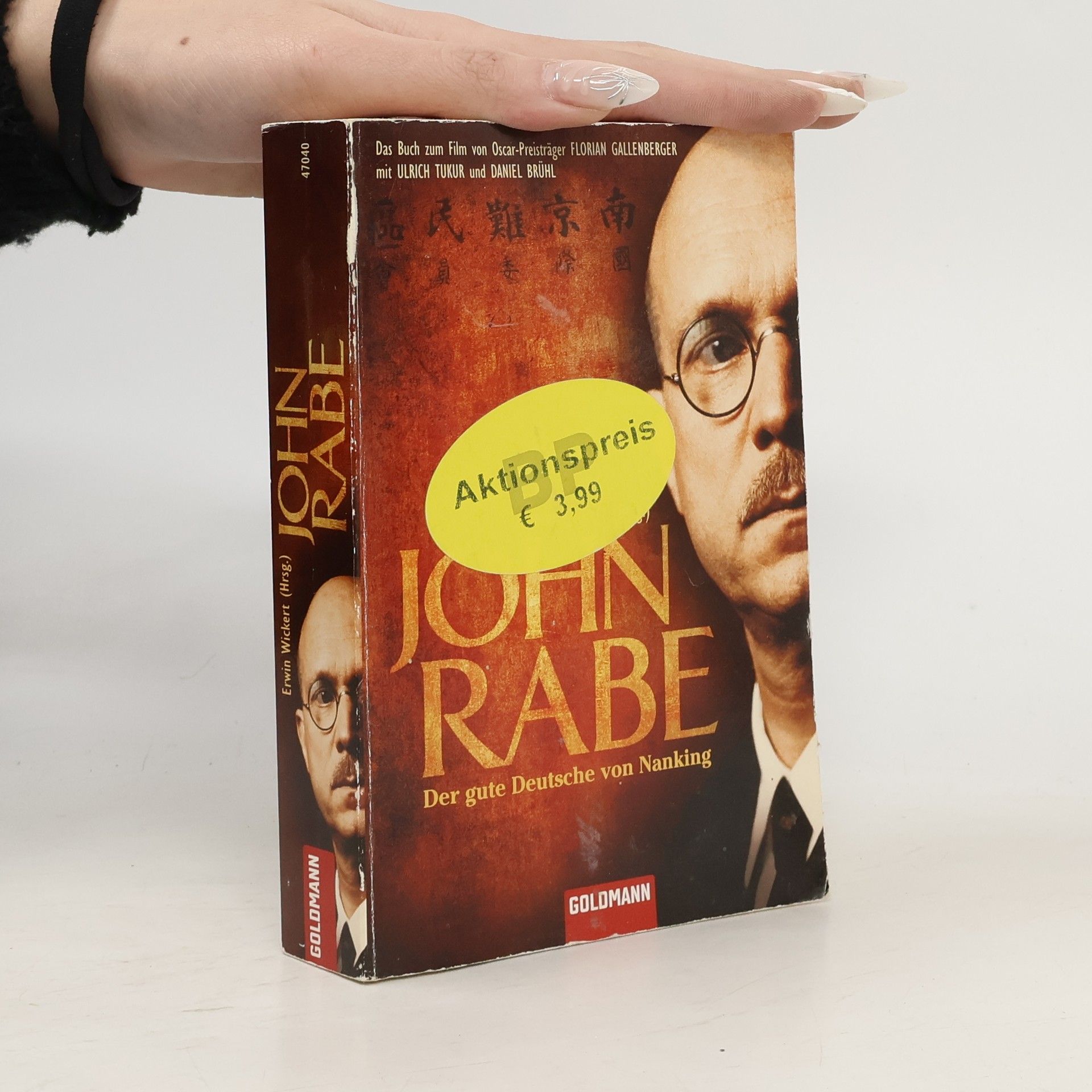 „John Rabe war kein spektakulärer Held, sein Motiv war pure Menschlichkeit.“ DIE WELT Der deutsche Kaufmann John Rabe (1882-1950) half in den Jahren 1937/38 unter Einsatz seines Lebens, 250.000 Chinesen in Nanjing vor den Massakern der japanischen Besatzer zu retten. Seine von Erwin Wickert herausgegebenen und kommentierten Tagebücher aus dieser Zeit beschreiben den verzweifelten Einsatz für die bedrohten Zivilisten. Die Verfilmung der Geschichte mit Ulrich Tukur in der Hauptrolle kommt Anfang 2009 in die Kinos.