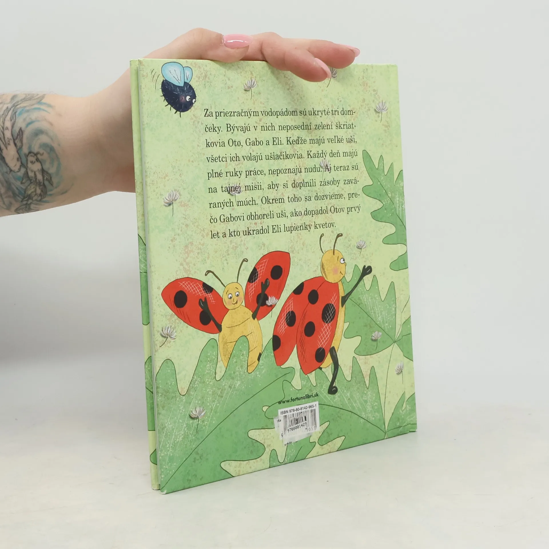 Za priezračným vodopádom sú ukryté tri domčeky. Bývajú v nich neposední zelení škriatkovia Oto, Gabo a Eli. Keďže majú veľké uši, všetci ich volajú ušiačikovia. Každý deň majú plné ruky práce, nepo-znajú nudu. Aj teraz sú na tajnej misii, aby si doplnili zásoby zaváraných múch. Okrem toho sa dozvieme, prečo Gabovi obhoreli uši, ako dopadol Otov prvý let a kto ukradol Eli lupienky kvetov.