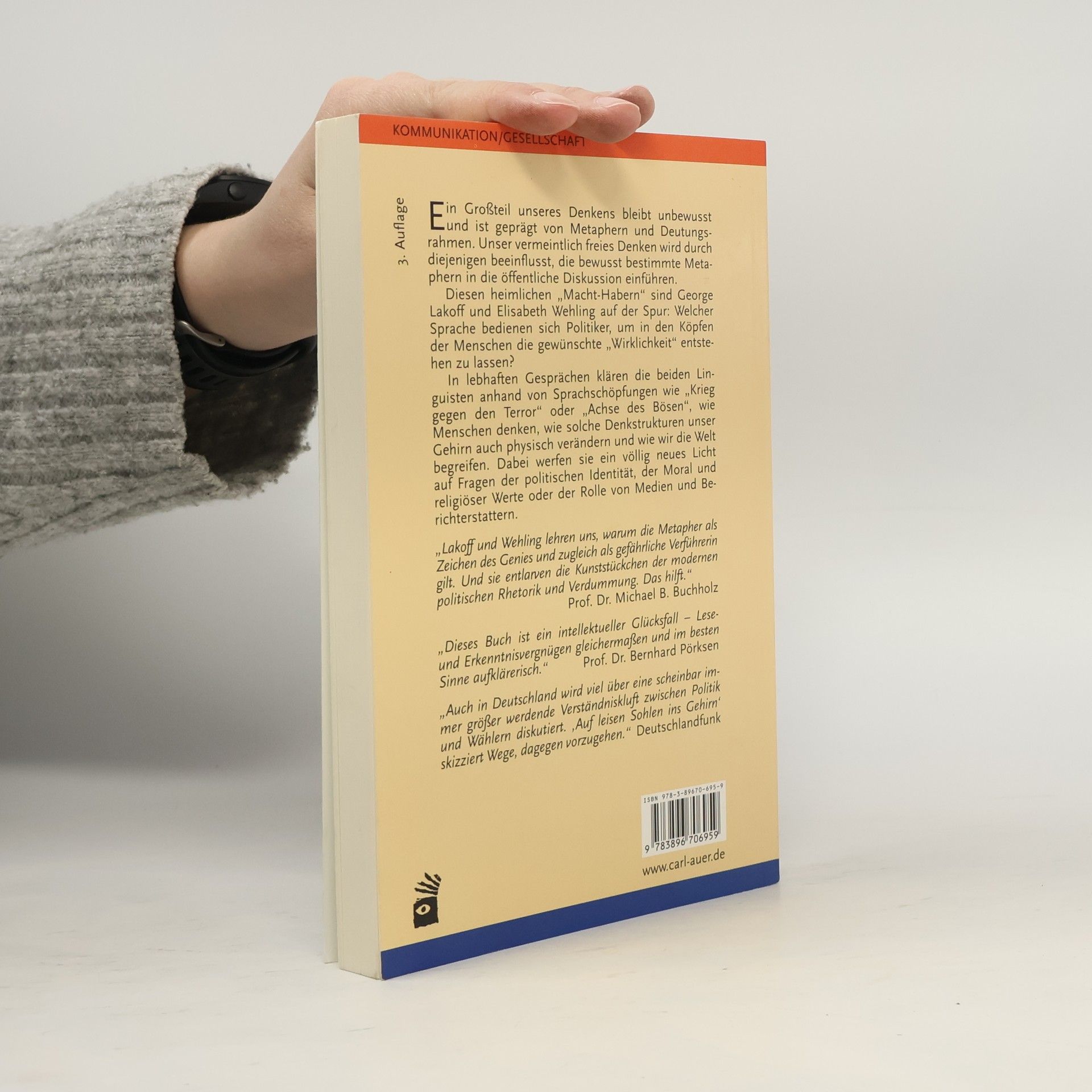 80 Prozent unseres Denkens bleiben unbewusst und werden durch Metaphern und Deutungsrahmen geprägt. Unser vermeintlich freies Denken wird durch diejenigen beeinflusst, die bewusst bestimmte Metaphern in die öffentliche Diskussion einführen. Diesen „heimlichen Macht-Habern“ sind George Lakoff und Eva Elisabeth Wehling auf der Spur: Welcher Sprache bedienen sich Politiker in öffentlichen Debatten, um in den Köpfen der Menschen die gewünschte „Wirklichkeit“ entstehen zu lassen? In lebhaften Gesprächen klären die beiden Wissenschaftler anhand von Sprachschöpfungen wie „Krieg gegen den Terror“ oder „Achse des Bösen“, wie Menschen denken, wie solche Denkstrukturen unser Gehirn auch physisch verändern und wie wir die Welt begreifen. Dabei werfen sie ein völlig neues Licht auf Fragen der politischen Identität, der Moral und religiöser Werte oder der Rolle von Medien und Berichterstattern. Als Leser lernt man so die Mechanismen seines eigenen politischen Denkens, Sprechens und Handelns besser kennen. Man erfährt, wie stark und gleichzeitig subtil die eigenen politischen Einstellungen durch Metaphern bestimmt sind und was nötig ist, um sich davon zu befreien.