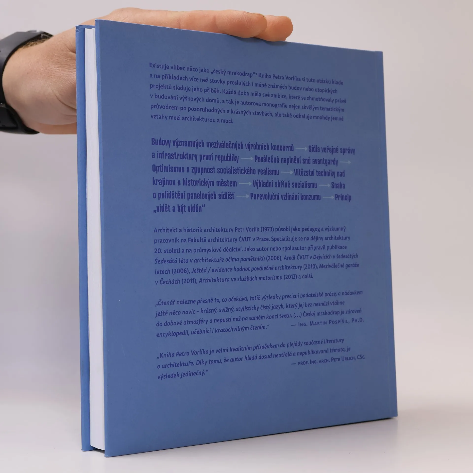 Existuje vůbec něco jako „český mrakodrap“? Kniha Petra Vorlíka sleduje na příkladech více než stovky proslulých i méně známých staveb nebo utopických projektů příběh skromného českého mrakodrapu. Zachycuje např.budovy významných meziválečných výrobních koncernů, sídel veřejné právy a infrastruktury pokrokové republiky, poválečné naplnění snů avantgardy, nekritický optimismus, ale i zpupnost socialistického realismu, vítězství techniky nad krajinou a historickým městem, prominentní výkladní skříně socialismu, snahu o polidštění jednotvárných panelových sídlišť i porevoluční vzlínání konzumu a principu „vidět a být viděn“. Každá doba měla své ambice, které se mnohdy zhmotnily právě v budování výškových staveb. Na příkladech jednotlivých výškových budov lze tedy oukázat na mnohdy jemné vztahy mezi mocí a architekturou.