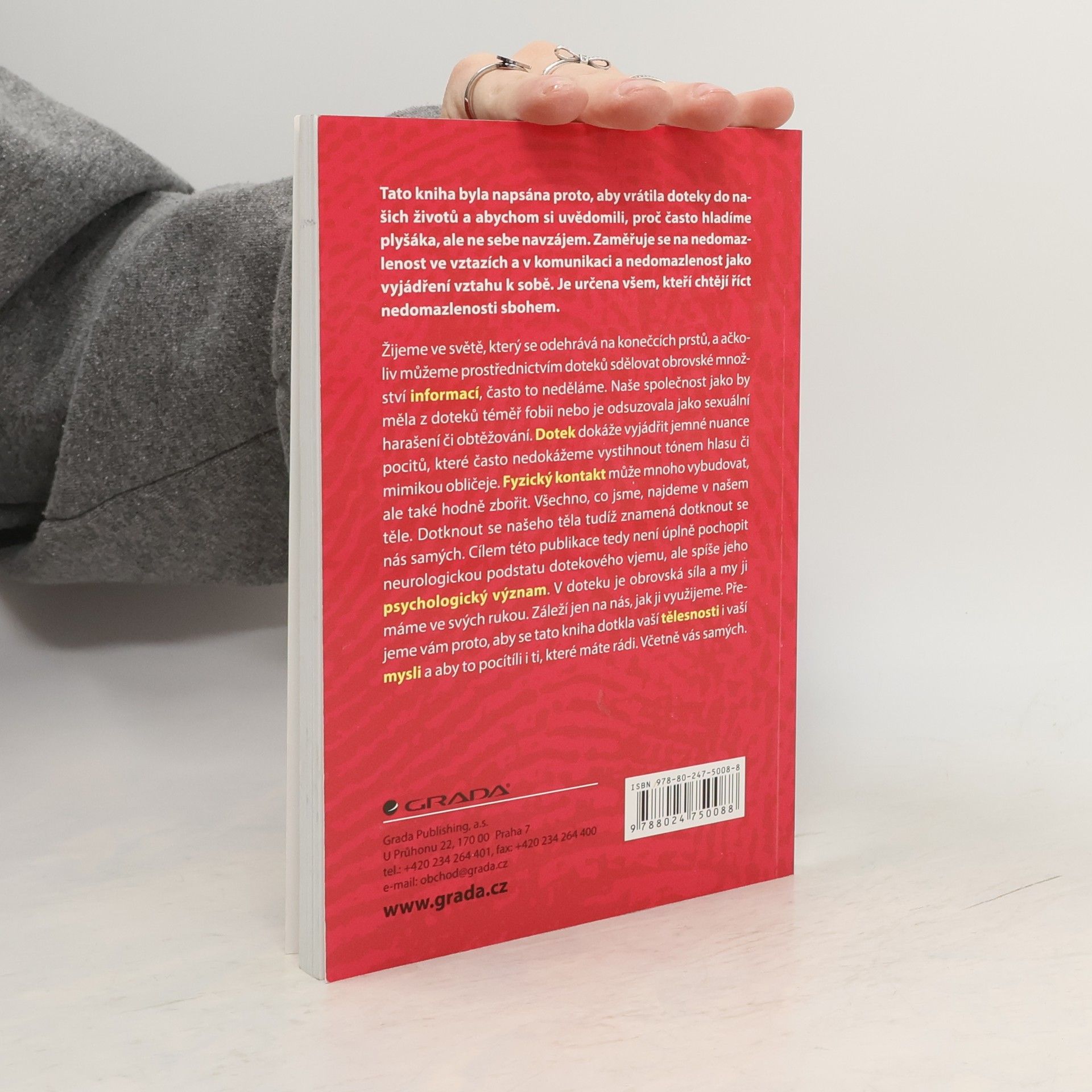 Tato kniha byla napsána proto, aby vrátila doteky do našich životů a abychom si uvědomili, proč často hladíme plyšáka, ale ne sebe navzájem. Zaměřuje se na nedomazlenost ve vztazích a v komunikaci a nedomazlenost jako vyjádření vztahu k sobě. Je určena všem, kteří chtějí říct nedomazlenosti sbohem. Žijeme ve světě, který se odehrává na konečcích prstů, a ačkoliv můžeme prostřednictvím doteků sdělovat obrovské množství informací, často to neděláme. Naše společnost jako by měla z doteků téměř fobii nebo je odsuzovala jako sexuální harašení či obtěžování. Dotek dokáže vyjádřit jemné nuance pocitů, které často nedokážeme vystihnout tónem hlasu či mimikou obličeje. Fyzický kontakt může mnoho vybudovat, ale také hodně zbořit. Všechno, co jsme, najdeme v našem těle. Dotknout se našeho těla tudíž znamená dotknout se nás samých. Cílem této publikace tedy není úplně pochopit neurologickou podstatu dotekového vjemu, ale spíše jeho psychologický význam. V doteku je obrovská síla a my ji máme ve svých rukou. Záleží jen na nás, jak ji využijeme. Přejeme vám proto, aby se tato kniha dotkla vaší tělesnosti i vaší mysli a aby to pocítíli i ti, které máte rádi. Včetně vás samých.