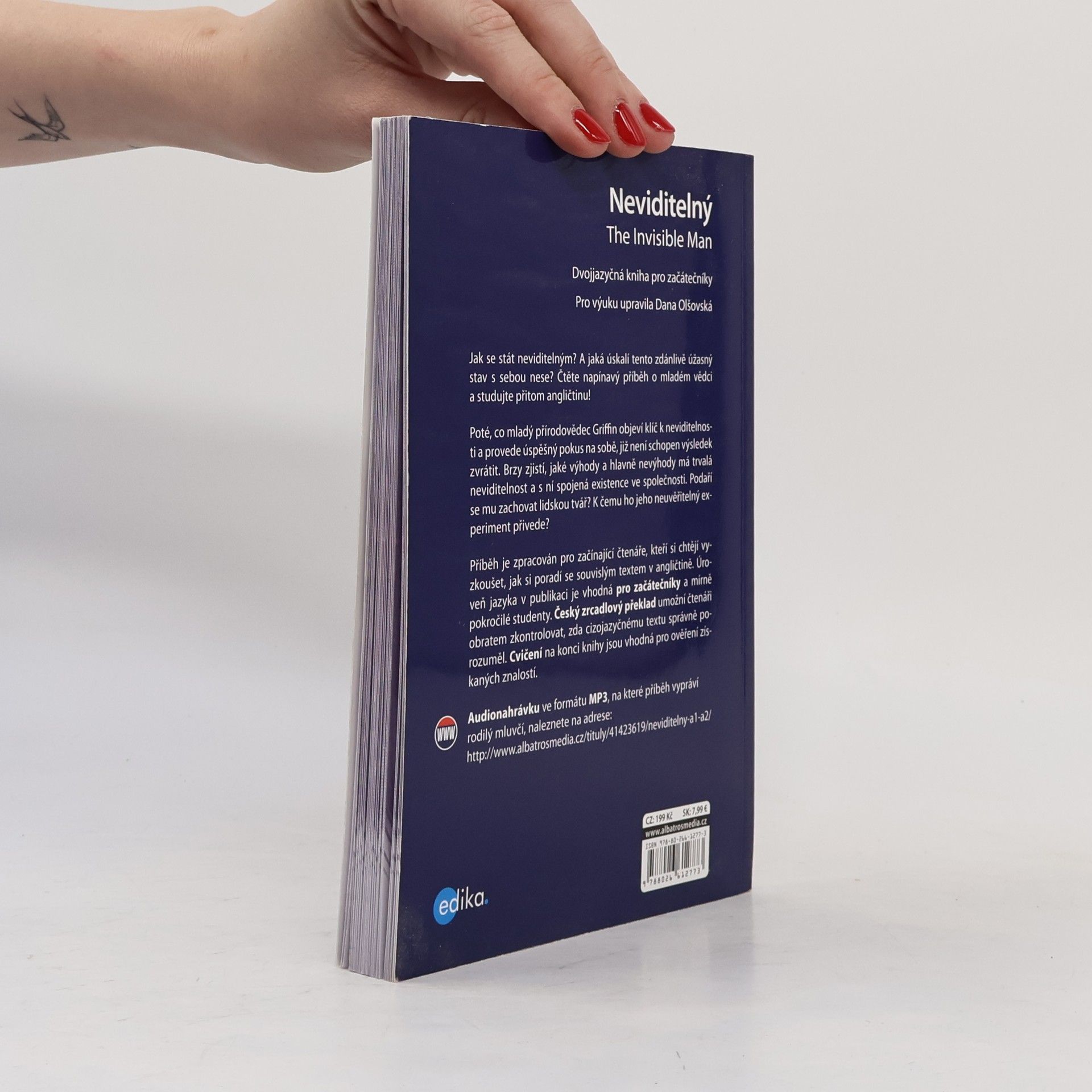 Jak se stát neviditelným? A jaká úskalí tento zdánlivě úžasný stav s sebou nese? Čtěte napínavý příběh o mladém vědci a studujte přitom angličtinu! Poté, co mladý přírodovědec Griffin objeví klíč k neviditelnosti a provede úspěšný pokus na sobě, již není schopen výsledek zvrátit. Brzy zjistí, jaké výhody a hlavně nevýhody má trvalá neviditelnost a s ní spojená existence ve společnosti. Podaří se mu zachovat lidskou tvář? K čemu ho jeho neuvěřitelný experiment přivede? Příběh je zpracován pro začínající čtenáře, kteří si chtějí vyzkoušet, jak si poradí se souvislým textem v angličtině. Úroveň jazyka v publikaci je vhodná pro začátečníky a mírně pokročilé studenty. Český zrcadlový překlad umožní čtenáři obratem zkontrolovat, zda cizojazyčnému textu správně porozuměl. Cvičení na konci knihy jsou vhodná pro ověření získaných znalostí.