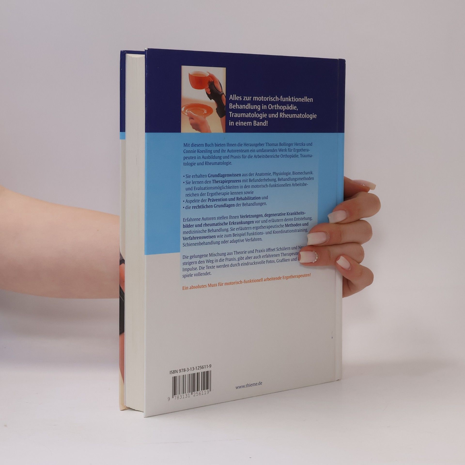 Alles zur motorisch-funktionellen Behandlung in Orthopädie, Traumatologie und Rheumatologie in einem Band! Mit diesem Buch bieten Ihnen die Herausgeber Thomas Bollinger Herzka und Connie Koesling und ihr Autorenteam ein umfassendes Werk für Ergotherapeuten in Ausbildung und Praxis für die Arbeitsbereiche Orthopädie, Traumatologie und Rheumatologie. - Sie erhalten Grundlagenwissen aus der Anatomie, Physiologie, Biomechanik. - Sie lernen den Therapieprozess mit Befunderhebung, Behandlungsmethoden und Evaluationsmöglichkeiten in den motorisch-funktionellen Arbeitsbereichen der Ergotherapie kennen sowie - Aspekte der Prävention und Rehabilitation und - die rechtlichen Grundlagen der Behandlungen. Erfahrene Autoren stellen Ihnen Verletzungen, degenerative Krankheitsbilder und rheumatische Erkrankungen vor und erläutern deren Entstehung, medizinische Behandlung. Sie erläutern ergotherapeutische Methoden und Verfahrensweisen wie zum Beispiel Funktions- und Koordinationstraining, Schienenbehandlung oder adaptive Verfahren. Die gelungene Mischung aus Theorie und Praxis öffnet Schülern und Neueinsteigern den Weg in die Praxis, gibt aber auch erfahrenen Therapeuten neue Impulse. Die Texte werden durch eindrucksvolle Fotos, Grafiken und Fallbeispiele vollendet. Ein absolutes Muss für motorisch-funktionell arbeitende Ergotherapeuten!