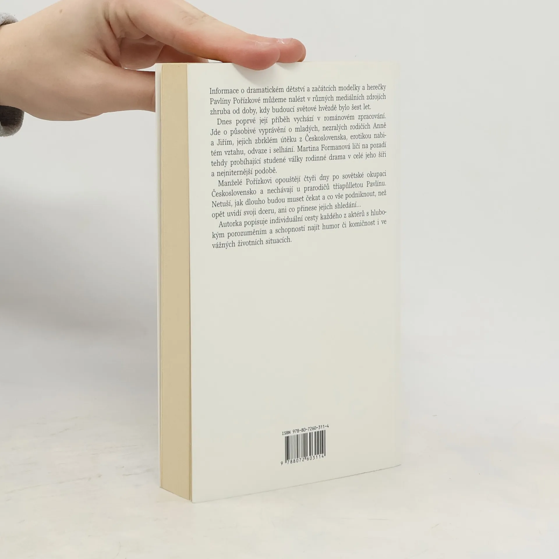 Informace o dramatickém dětství a začátcích modelky a herečky Pavlíny Pořízkové můžeme nalézt v různých mediálních zdrojích zhruba od doby, kdy budoucí světové hvězdě bylo šest let. Dnes poprvé její příběh vychází v románovém zpracování. Jde o působivé vyprávění o mladých, nezralých rodičích Anně a Jiřím, jejich zbrklém útěku z Československa, erotikou nabitém vztahu, odvaze i selhání. Martina Formanová líčí na pozadí tehdy probíhající studené války rodinné drama v celé jeho šíři a nejniternější podobě. Manželé Pořízkovi opouštějí čtyři dny po sovětské okupaci Československo a nechávají u prarodičů tříapůlletou Pavlínu. Netuší, jak dlouho budou muset čekat a co vše podniknout, než opět uvidí svoji dceru, ani co přinese jejich shledání… Autorka popisuje individuální cesty každého z aktérů s hlubokým porozuměním a schopností najít humor či komičnost i ve vážných životních situacích.
