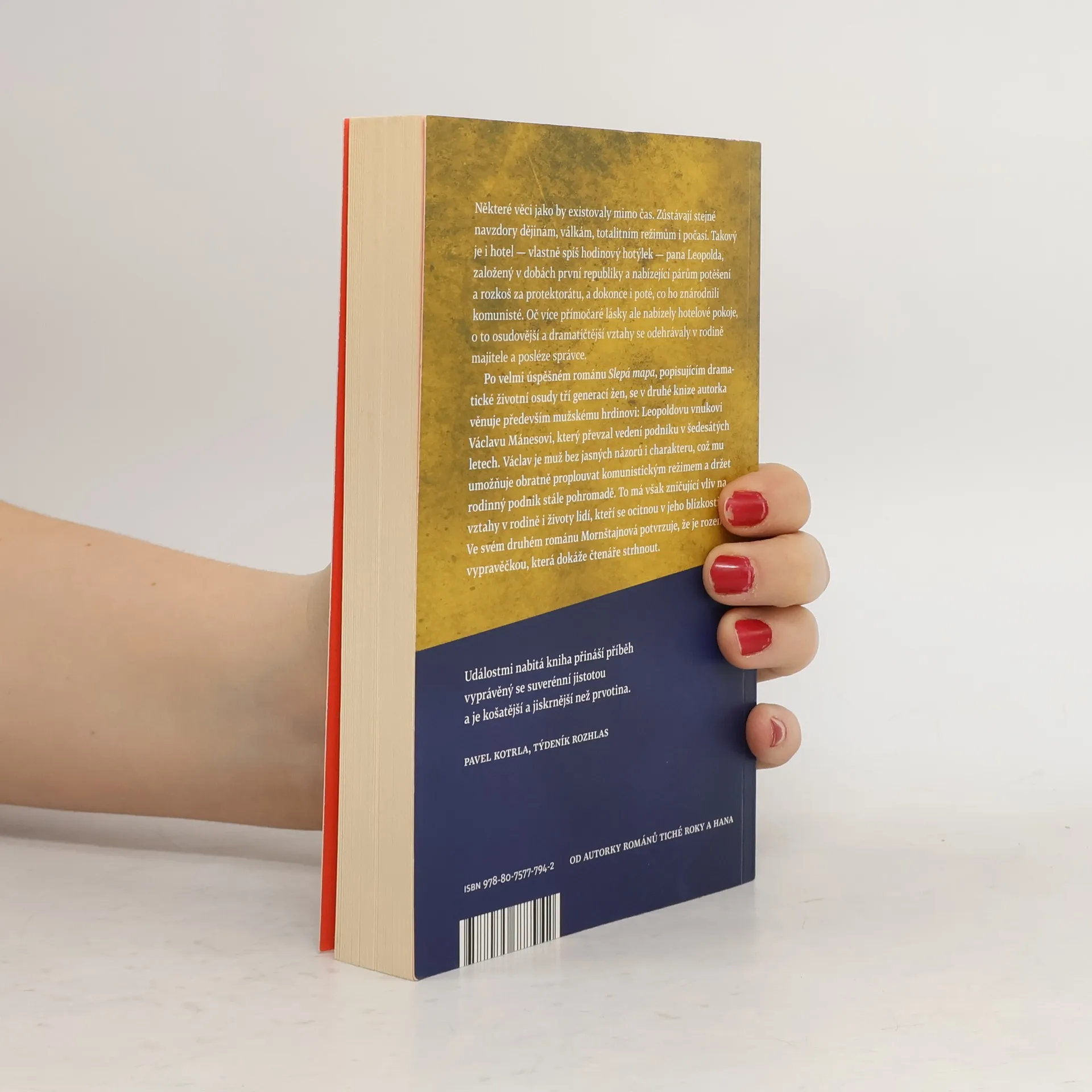 Některé věci jakoby existovaly mimo čas. Zůstávají stejné navzdory dějinám, válkám, totalitním režimům i počasí. Takový je i hotel pana Leopolda, vlastně spíše hodinový hotýlek, založený v dobách první republiky a nabízející potěšení a rozkoš párům za protektorátu, a dokonce i poté, co ho znárodnili komunisté. Oč více přímočaré lásky ale nabízely hotelové pokoje, o to osudovější a dramatičtější vztahy se odehrávaly v rodině majitele a posléze správce. Po velmi úspěšném románu Slepá mapa popisujícím dramatické životní osudy tří generací žen se v nové knize autorka věnuje především postavě jediné: Leopoldovu vnukovi Václavu Mánesovi, který převzal vedení podniku v šedesátých letech. Václav je muž bez vlastností, jasných názorů i charakteru, což mu umožňuje obratně proplouvat komunistickým režimem a držet rodinný podnik stále pohromadě, má však zničující vliv na vztahy v rodině i životy lidí, kteří se ocitnou v jeho blízkosti. Mornštajnová popisuje a vysvětluje Václavovy skutky tak obratně, že se teprve na konci knihy zděsíme, komu jsme to vlastně po celou dobu drželi palce.