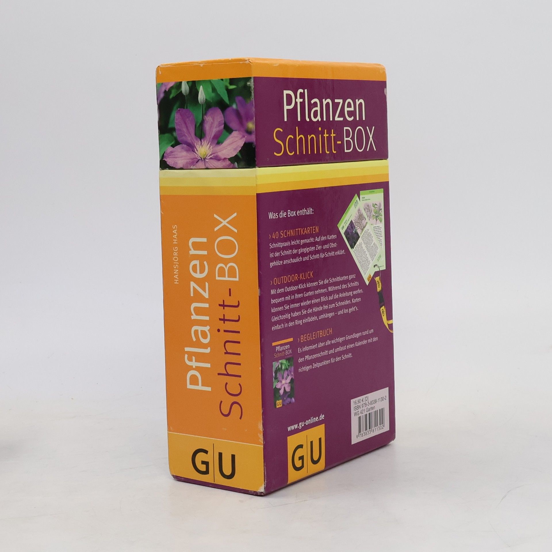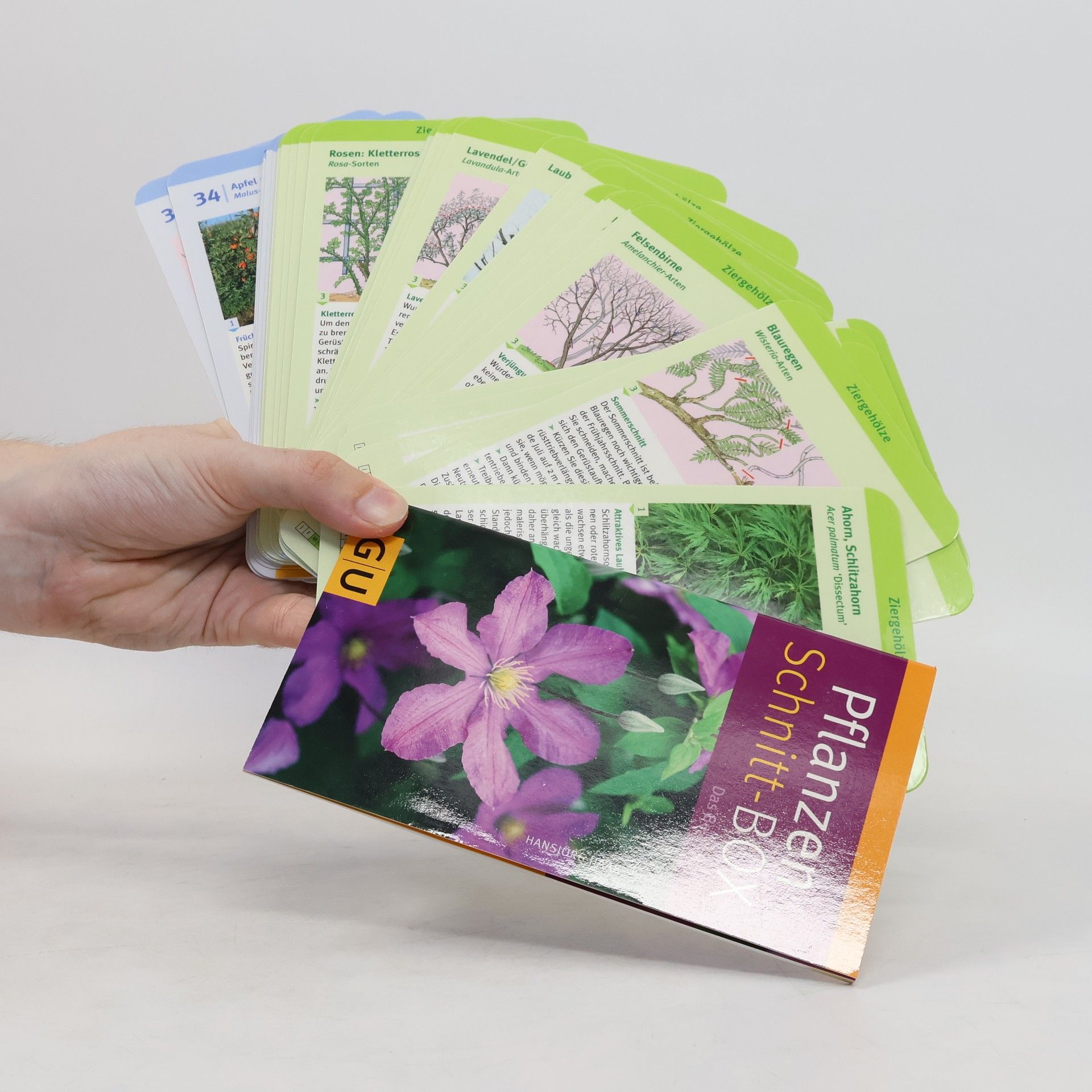 Wann schneidet man Flieder, damit er Jahr für Jahr üppig blüht? Wie setzt man die Schere richtig an, damit Buchs und Eibe dichte Hecken bilden? Und welchen Schnitt brauchen Apfel, Zwetschge oder Johannisbeere, um viele Früchte zu tragen? Ob Frühlings- oder Sommerblüher, Kletterrose oder Beerenstrauch - jedes Gehölz braucht einen speziellen Schnitt. Gewusst wie, fördern Sie nicht nur üppige Blüte und reiche Ernte. Sie erhalten Ihre Gehölze auch gesund und vital. Auf 40 Karten ist der Schnitt von 30 Zier- und 10 Obstgehölzen anschaulich und Schritt für Schritt erklärt. Damit Sie die Karten bequem in den Garten mitnehmen können, enthält die Box das Umhängesystem GU-Outdoor-Klick: Fädeln Sie die Karten einfach in den Ring ein und tragen Sie sie mit einem langen Umhängeband um den Hals oder mit einem kurzen Band an der Gürtelschlaufe. Ein Begleitbuch bietet Ihnen alle Informationen, die rund um das Thema Pflanzenschnitt wichtig sind.