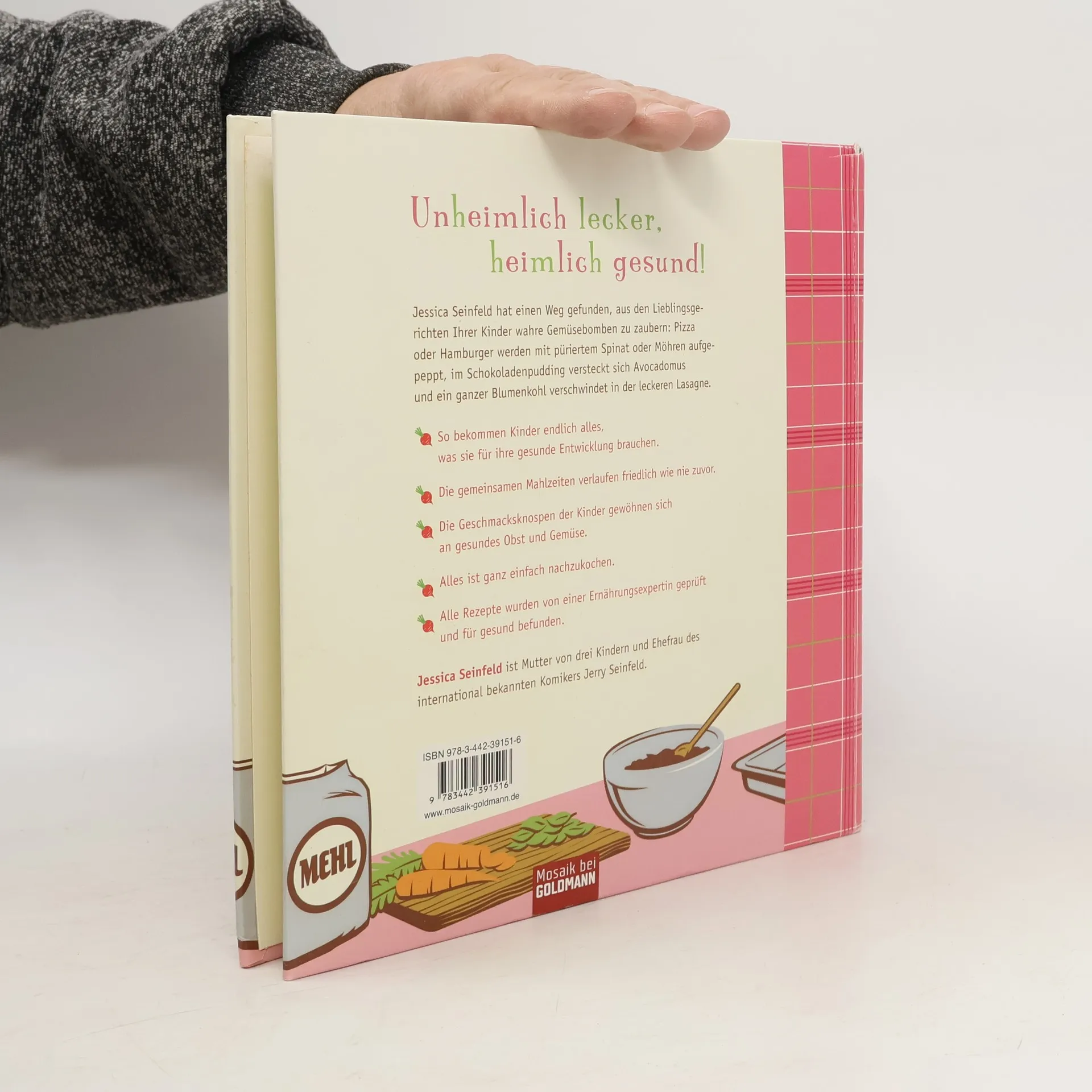 Heimlich gesund – unheimlich lecker! „Iss endlich dein Gemüse, sonst gibt es keinen Nachtisch!“ Dieser Satz wird in Zukunft der Vergangenheit angehören. Stattdessen werden Mütter begeisterte Ausrufe hören: „Mama, das schmeckt super!“ Das klingt verführerisch – wie die leckeren Rezeptideen von Jessica Seinfeld. Jessica Seinfeld hat einen Weg gefunden, aus den Lieblingsgerichten ihrer Kinder wahre Gemüse- und Vitaminbomben zu zaubern. Pizza oder Hamburger werden mit püriertem Spinat oder Möhren aufgepeppt, ein ganzer Blumenkohl verschwindet in der leckeren Lasagne. So bekommen Kinder endlich alles, was sie für ihre gesunde Entwicklung brauchen, die gemeinsamen Mahlzeiten verlaufen friedlich wie nie zuvor! Und die Geschmacksknospen der Kinder gewöhnen sich an gutes Gemüse – und werden diese Vorliebe für den Rest des Lebens abspeichern. So schmeckt Gemüse jedem Kind – für den Rest seines Lebens!