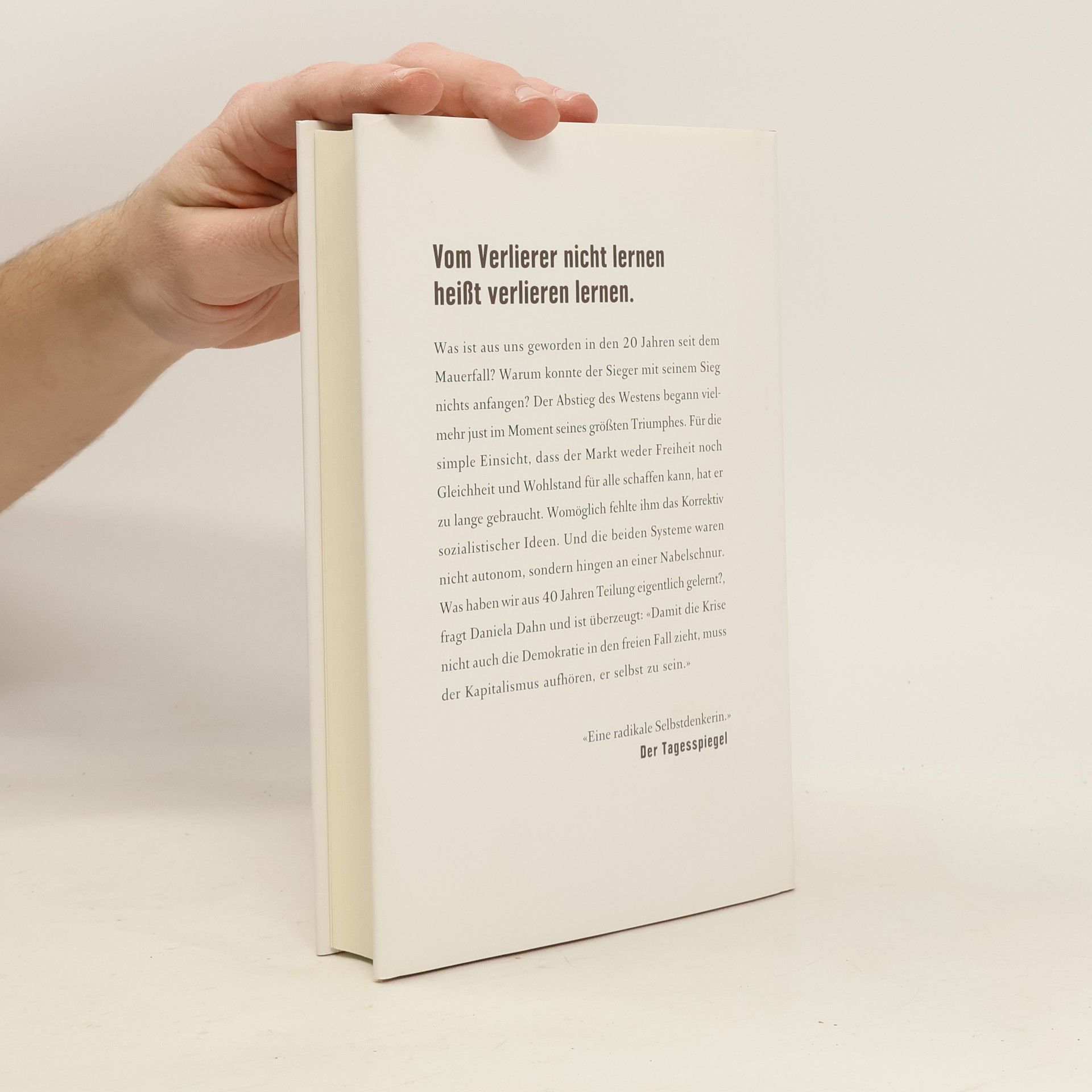 Vom Verlierer nicht lernen, heißt verlieren lernenWas ist aus uns geworden in den 20 Jahren seit dem Mauerfall? Warum konnte der Sieger mit seinem Sieg nichts anfangen? Sein Abstieg setzte just im Moment des größten Triumphes ein. Für die simple Einsicht, dass der Markt nicht perfekt ist, hat er zu lange gebraucht. Fehlte ihm das Korrektiv sozialistischer Ideen? Waren beide Seiten gar nicht autonom, sondern hingen an einer Nabelschnur? Haben wir aus 40 Jahren Teilung nichts gelernt?, fragt Daniela Dahn und ist überzeugt: Damit die Krise nicht auch die Demokratie in den freien Fall zieht, muss der Kapitalismus aufhören, er selbst zu sein. «Eine radikale Selbstdenkerin.»Der Tagesspiegel