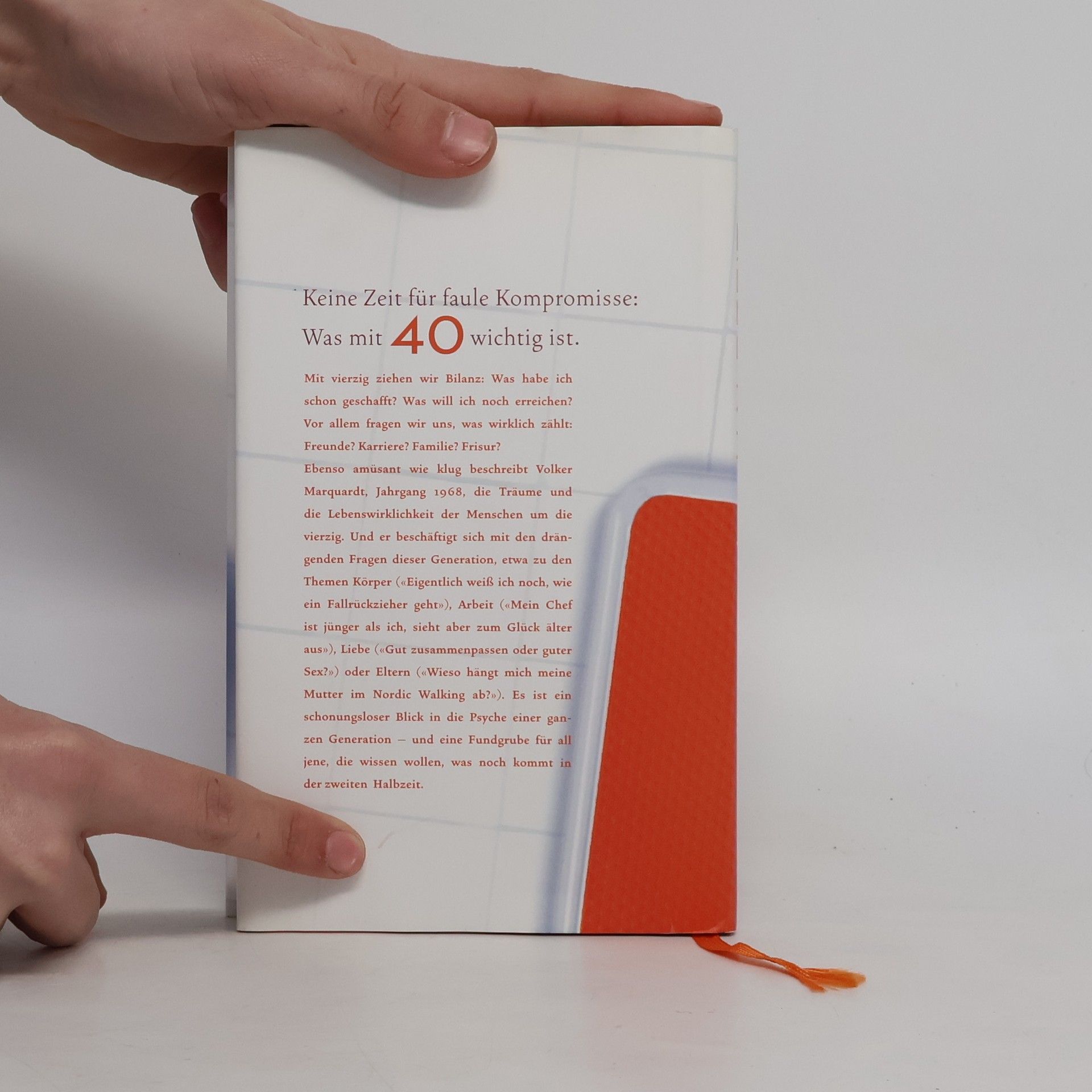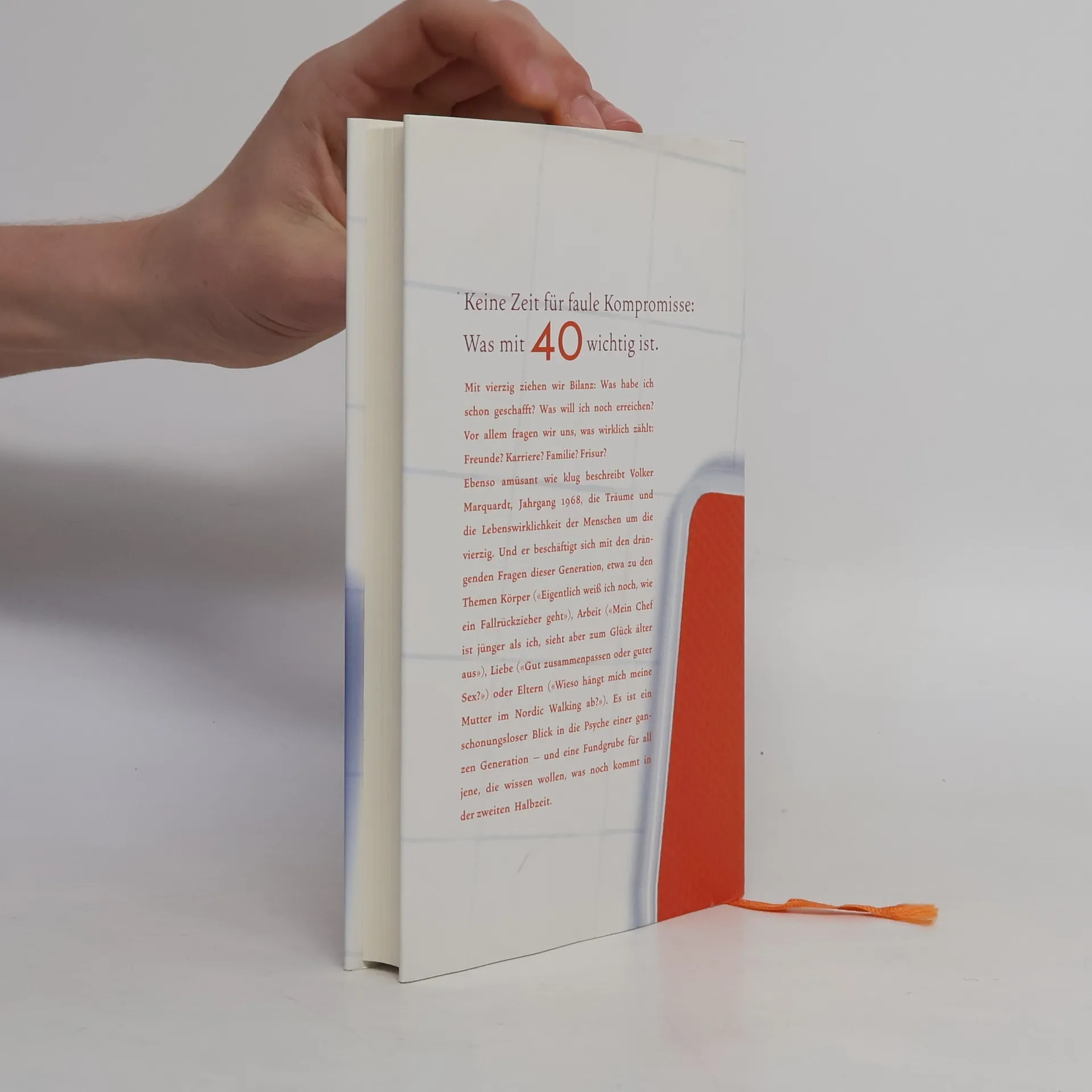 Keine Zeit für faule Kompromisse: Was mit 40 wichtig ist. Mit vierzig ziehen wir Bilanz: Was habe ich schon geschafft? Was will ich noch erreichen? Vor allem fragen wir uns, was wirklich zählt: Freunde? Karriere? Familie? Frisur? Ebenso amüsant wie klug beschreibt Volker Marquardt, Jahrgang 1968, die Träume und die Lebenswirklichkeit der Menschen um die vierzig. Und er beschäftigt sich mit den drängenden Fragen dieser Generation, etwa zu den Themen Körper («Eigentlich weiß ich noch, wie ein Fallrückzieher geht»), Arbeit («Mein Chef ist jünger als ich, sieht aber zum Glück älter aus»), Liebe («Gut zusammenpassen oder guter Sex?») oder Eltern («Wieso hängt mich meine Mutter im Nordic Walking ab?»). Es ist ein schonungsloser Blick in die Psyche einer ganzen Generation – und eine Fundgrube für all jene, die wissen wollen, was noch kommt in der zweiten Halbzeit.