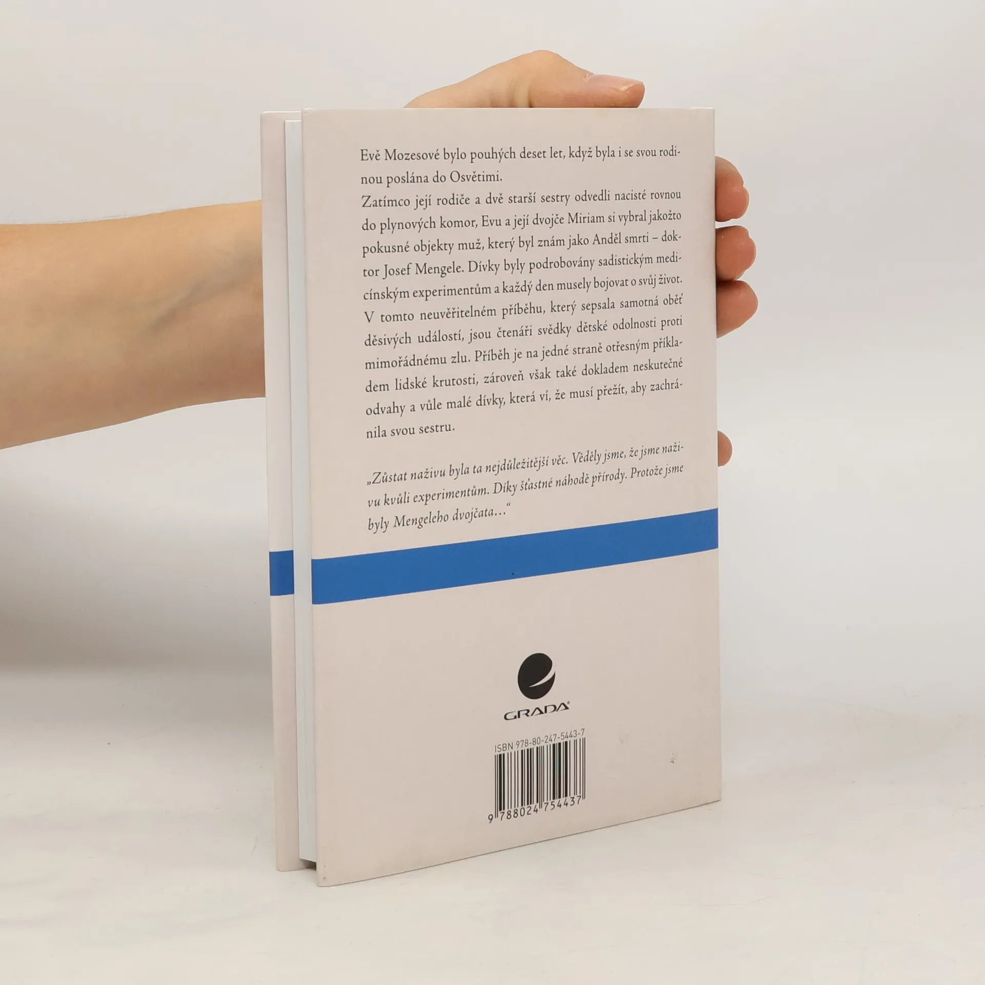 Evě Mozes bylo deset let, když byla se svou rodinou poslána do Osvětimi. Zatímco její rodiče a dvě starší sestry byli posláni do plynových komor, Evu a její dvojče Miriam si vybral coby pokusné objekty muž, který byl znám jako Anděl smrti – Dr. Josef Mengele. Dívky byly podrobeny sadistickým medicínským experimentům a musely každodenně bojovat o svůj život. V tomto neuvěřitelném příběhu, který sepsala samotná oběť děsivých událostí, jsou čtenáři svědky dětské odolnosti proti mimořádnému zlu. Eva byla například vystavena infekci, u níž Mengele věřil, že bude smrtelná, a bude pak moci provést pitvu i na Miriam, která měla sloužit jako „srovnávací vzorek“. Přežila – a dodnes neví, jaké onemocnění to bylo. Po osvobození tábora sestry založily skupinu, která podporovala bývalé oběti Mengeleho experimentů.