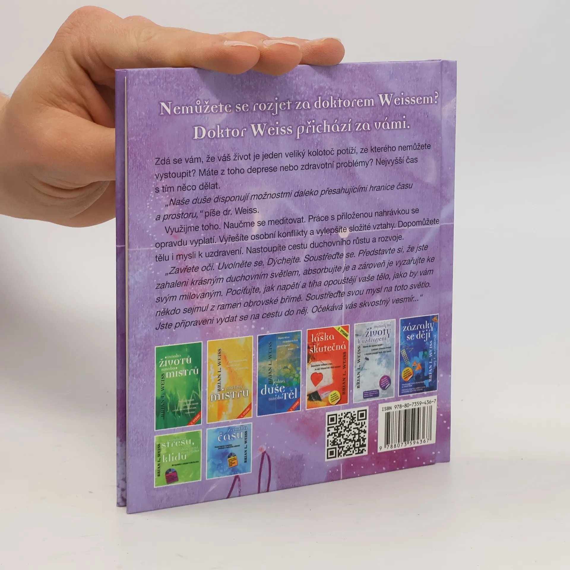 Meditace je občerstvením duše. Relaxační a láskyplná... Pokud jste se až dosud domnívali, že meditace je něco těžkého, vhodného leda tak pro mnichy, rychle to zase pusťte z hlavy. Je to naopak snadné, povznášející a příjemné. A protože pouhým čtením se toho člověk moc nenaučí, můžete se pohodlně uložit a nechat se vést podmanivým hlasem. Jak říká autor téhle knihy: „Všechno začíná tím, že zavřete oči, uvolníte svaly a zpomalíte dech…“ Meditace je cestou, která nás vede do vlastního nitra, k našemu vyššímu já a k vesmírné moudrosti. A to nejsou jen nějaké vzletné řeči. Praktické účinky jsou jasně patrné a prokázaly je i studie předních univerzit. Meditací lze například snížit krevní tlak, posílit imunitní systém, podpořit hojení a zmírnit stres. Mnozí klienti dr. Weisse také zvítězili nad nespavostí, úzkostnými stavy, fobiemi a různými chorobami nebo dokázali vyřešit problémy s nadváhou. A všichni se začali cítit lépe a optimističtěji. Meditace a vizualizace vám pomohou přestat tolik přemýšlet a nastoupit cestu. Dojde k uzdravení. Začnete používat dosud nevyužívanou část mysli. Prohlédnete. Pochopíte. A zmoudříte. Pak nastane mír.