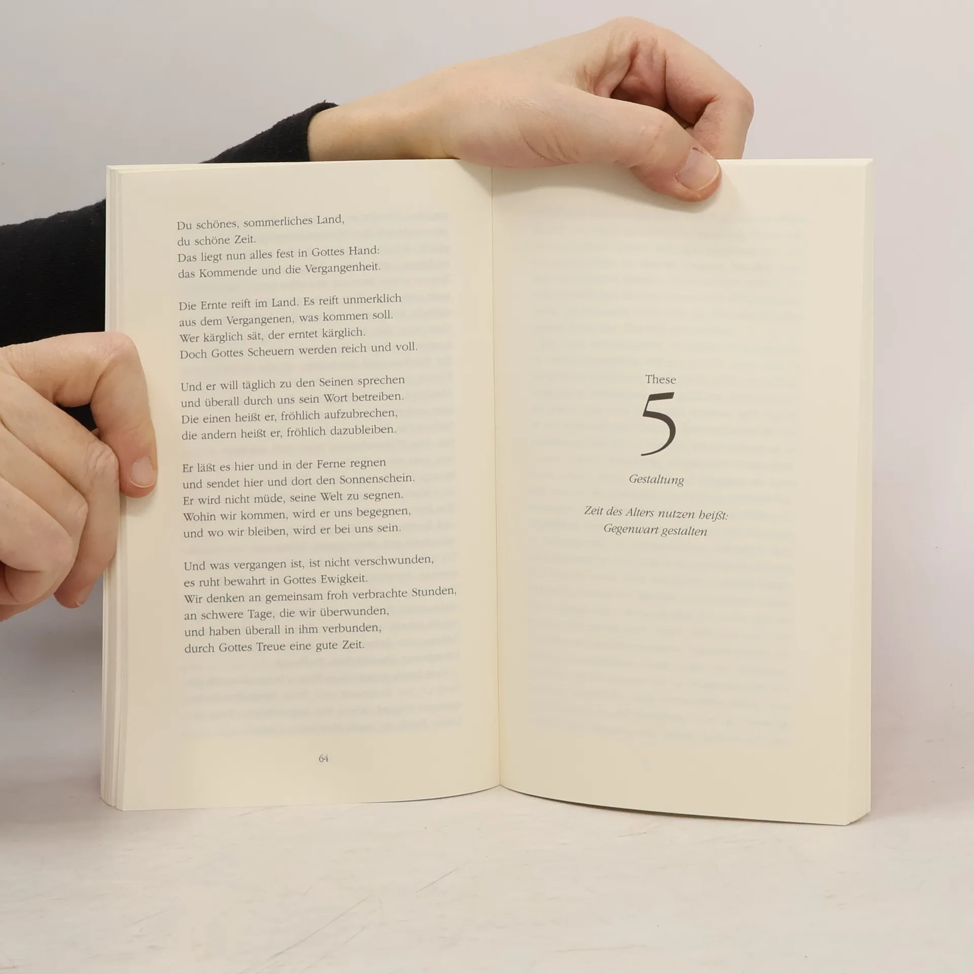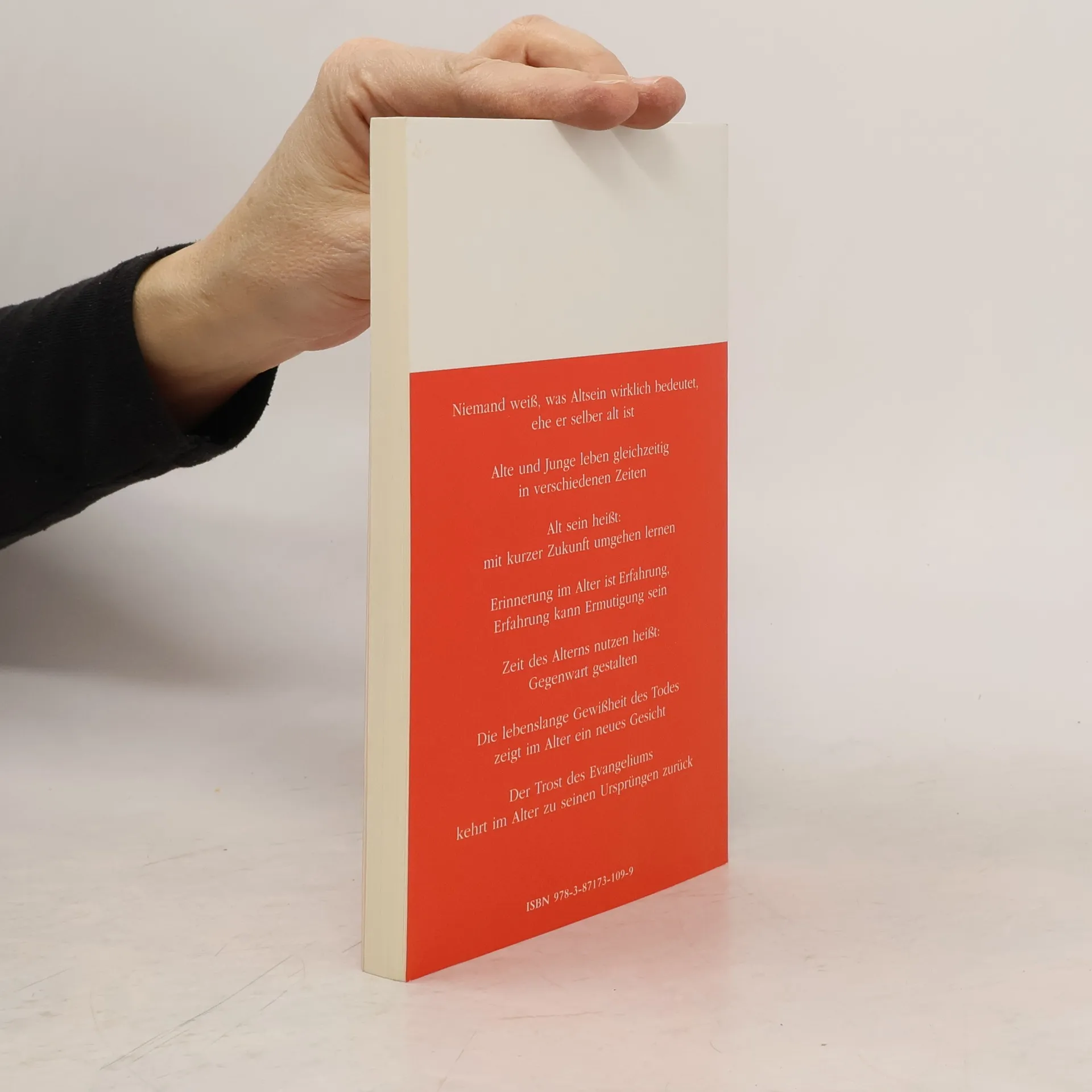1. These: Niemand weiß, was Altsein wirklich bedeutet, ehe er selber alt ist 2. These: Alte und Junge leben gleichzeitig in verschiedenen Zeiten 3. These: Alt sein heißt: mit kurzer Zukunft umgehen lernen 4. These: Erinnerung im Alter ist Erfahrung, Erfahrung kann Ermutigung sein 5. These: Zeit des Alterns nutzen heißt: Gegenwart gestalten 6. These: Die lebenslange Gewißheit des Todes zeigt im Alter ein neues Gesicht 7. These: Der Trost des Evangeliums kehrt im Alter zu seinen Ursprüngen zurück