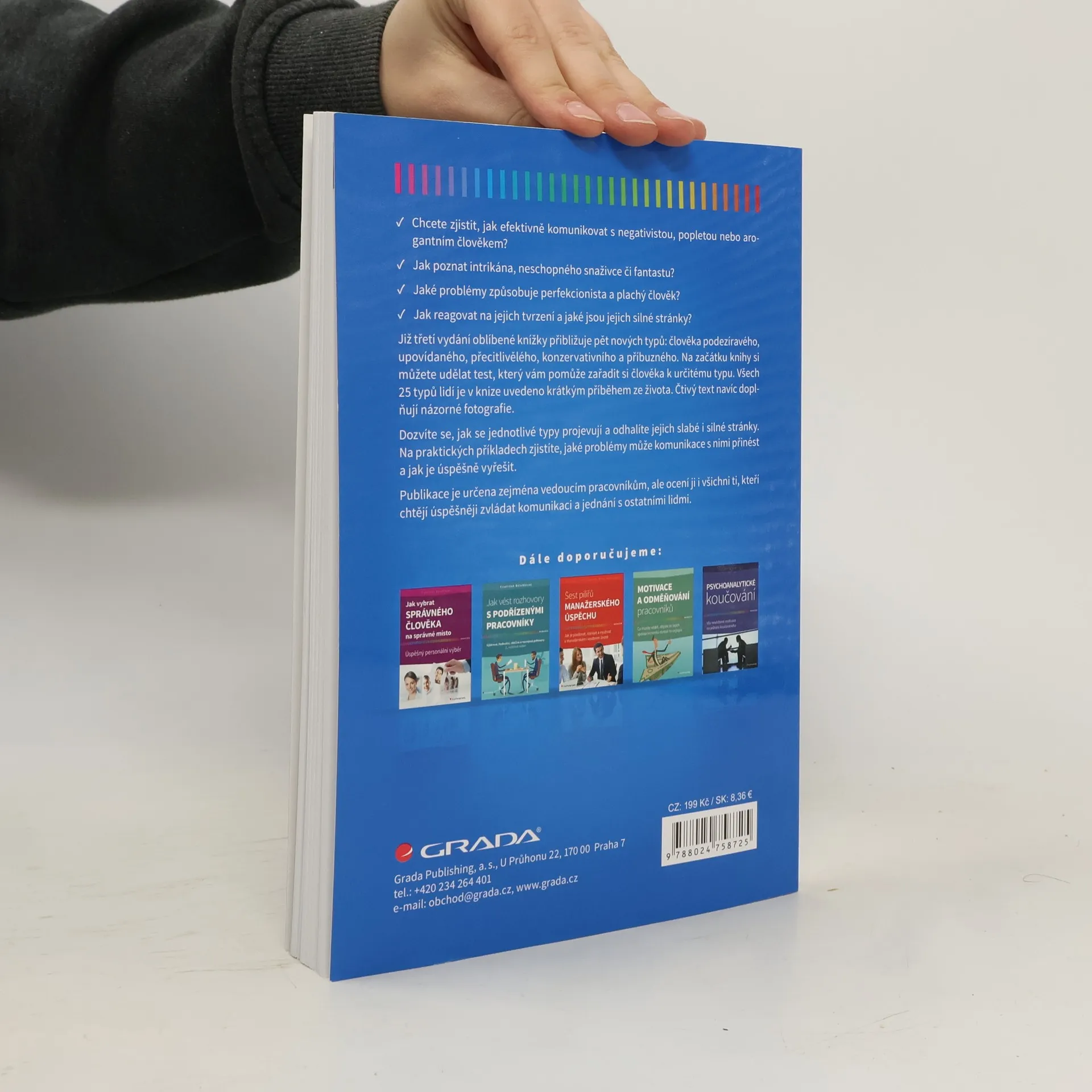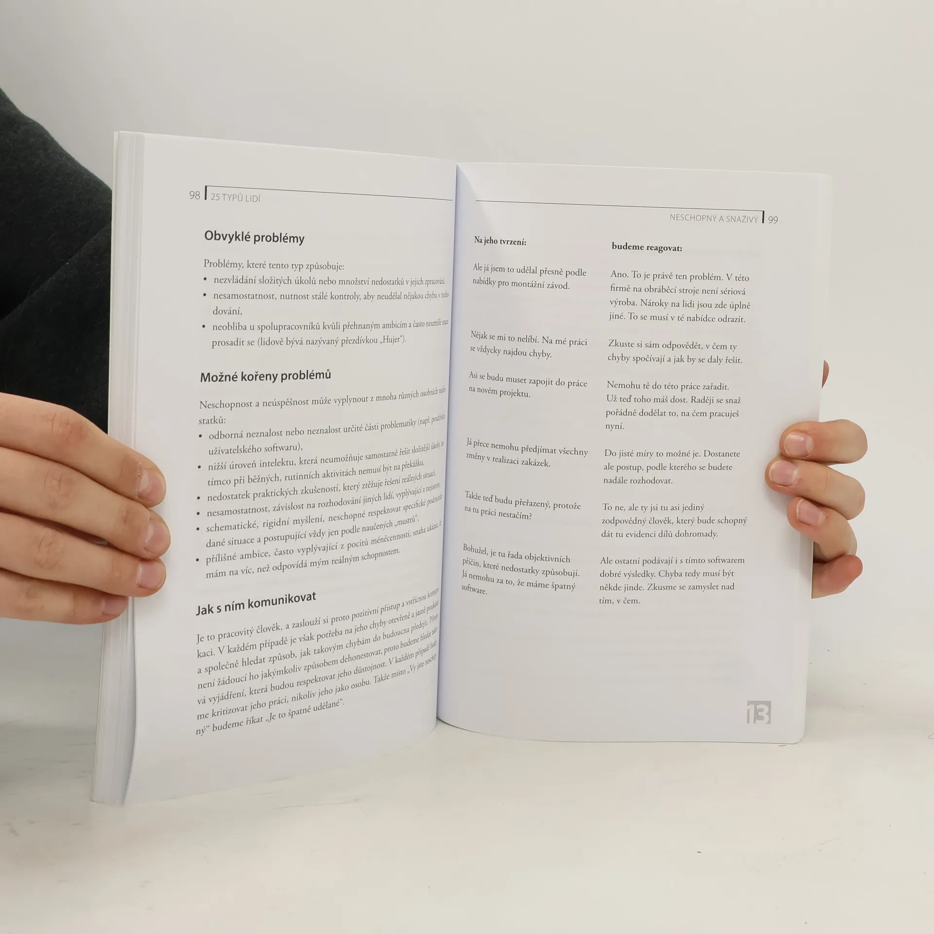Jak efektivně komunikovat s negativistou, popletou nebo arogantním člověkem? Jak poznat intrikána, neschopného snaživce či fantastu? Jaké problémy způsobuje perfekcionista a plachý člověk? Jak reagovat na jejich tvrzení a jaké jsou jejich silné stránky? Publikace je určena zejména vedoucím pracovníkům, ale ocení ji všichni ti, kteří chtějí úspěšněji zvládat komunikaci a jednání s jinými lidmi. Již třetí vydání oblíbené knížky přibližuje pět nových typů: člověka podezíravého, upovídaného, přecitlivělého, konzervativního a příbuzného. Čtivý text doplňují fotografie zachycující jednotlivé typy.