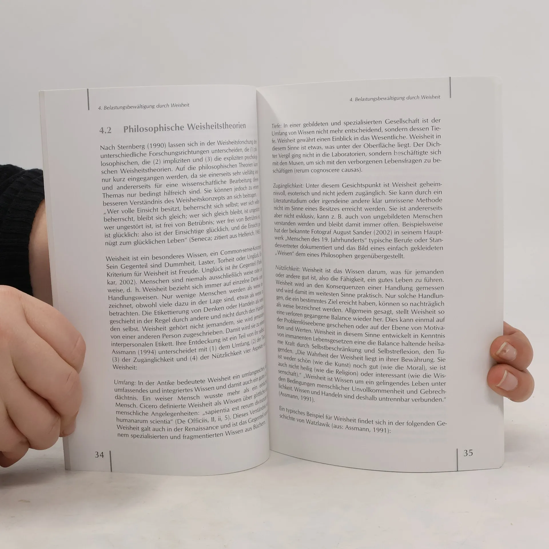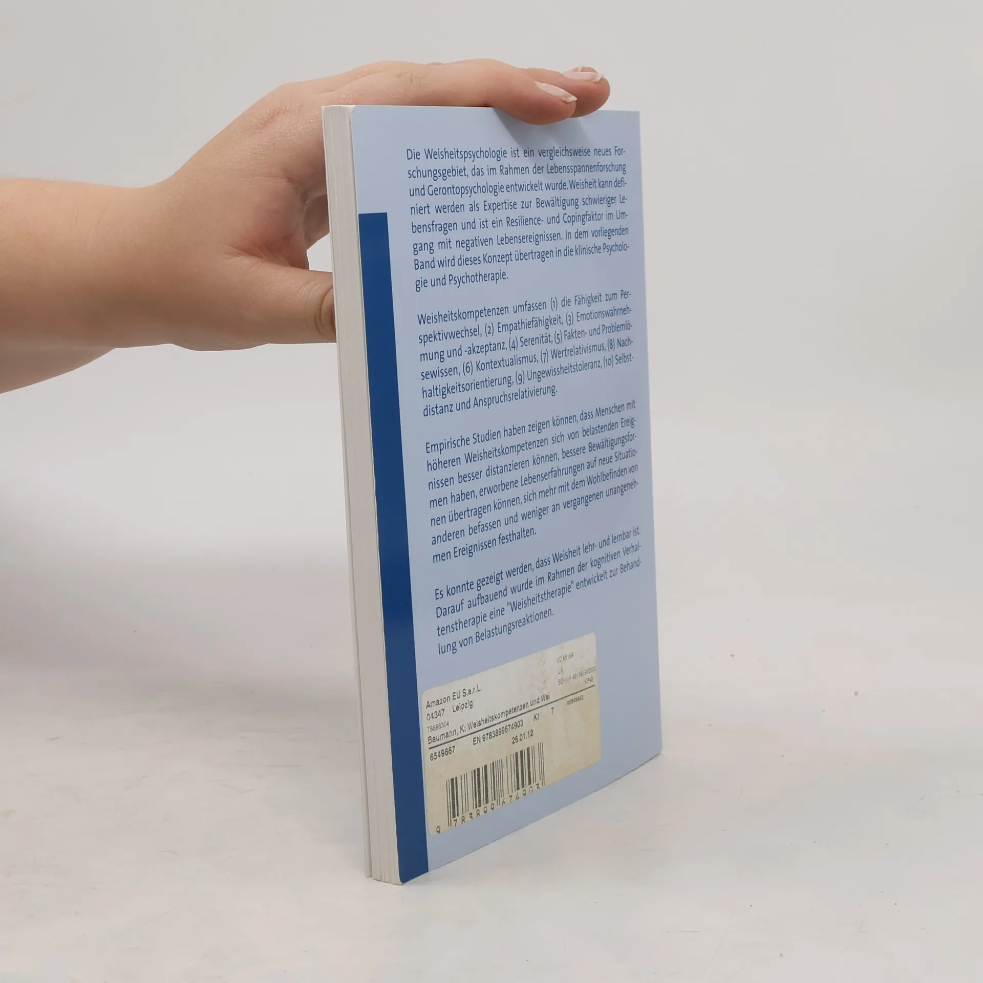 Die Weisheitspsychologie ist ein vergleichsweise neues Forschungsgebiet, das im Rahmen der Lebensspannenforschung und Gerontopsychologie entwickelt wurde. Weisheit kann definiert werden als Expertise zur Bewältigung schwieriger Lebensfragen und ist ein Resilience- und Copingfaktor im Umgang mit negativen Lebensereignissen. In dem vorliegenden Band wird dieses Konzept übertragen in die klinische Psychologie und Psychotherapie. Weisheitskompetenzen umfassen (1) die Fähigkeit zum Perspektivwechsel, (2) Empathiefähigkeit, (3) Emotionswahrnehmung und -akzeptanz, (4) Serenität, (5) Fakten- und Problemlösewissen, (6) Kontextualismus, (7) Wertrelativismus, (8) Nachhaltigkeitsorientierung, (9) Ungewissheitstoleranz, (10) Selbstdistanz und Anspruchsrelativierung. Empirische Studien haben zeigen können, dass Menschen mit höheren Weisheitskompetenzen sich von belastenden Ereignissen besser distanzieren können, bessere Bewältigungsformen haben, erworbene Lebenserfahrungen auf neue Situationen übertragen können, sich mehr mit dem Wohlbefinden von anderen befassen und weniger an vergangenen unangenehmen Ereignissen festhalten. Es konnte gezeigt werden, dass Weisheit lehr- und lernbar ist. Darauf aufbauend wurde im Rahmen der kognitiven Verhaltenstherapie eine „Weisheitstherapie“ entwickelt zur Behandlung von Belastungsreaktionen.