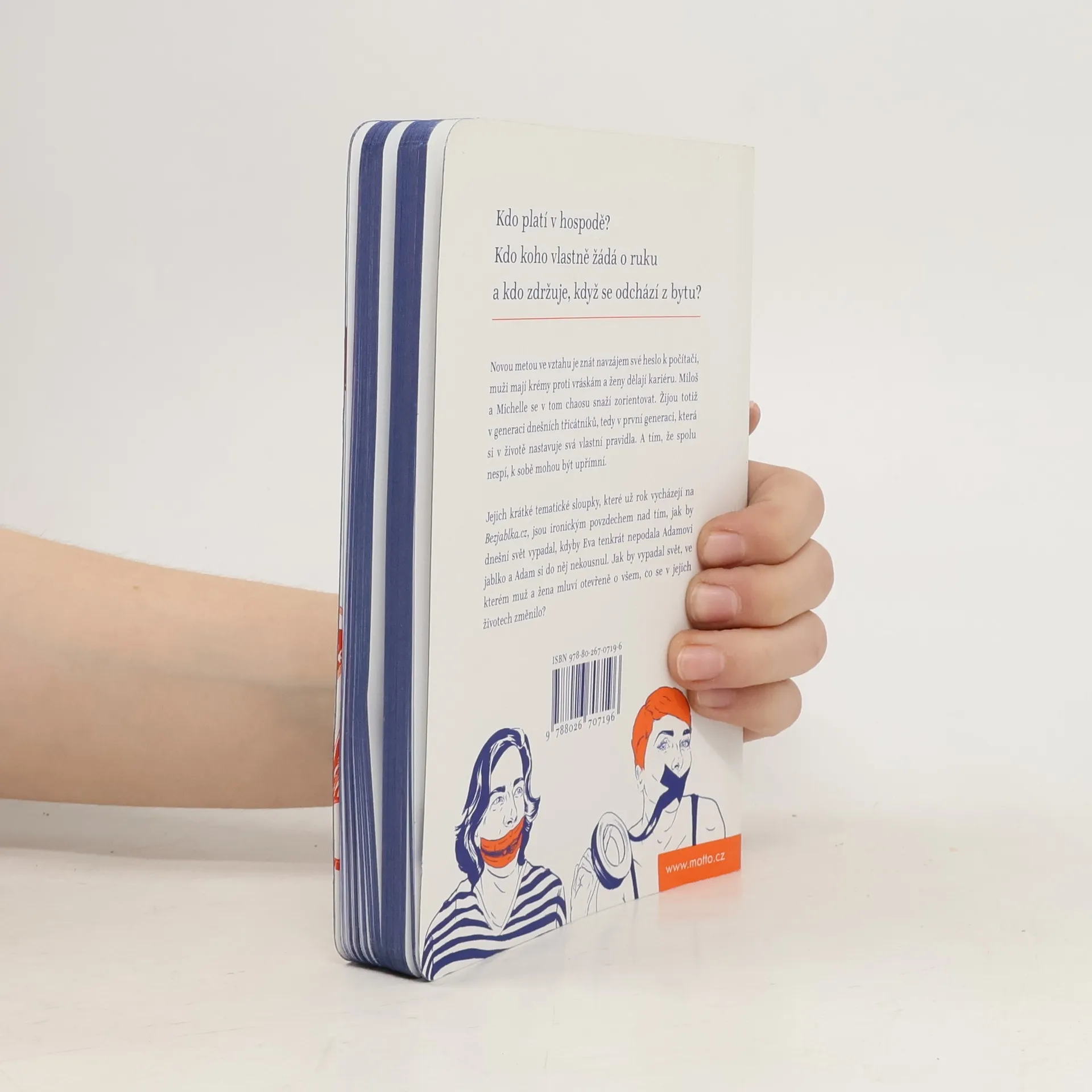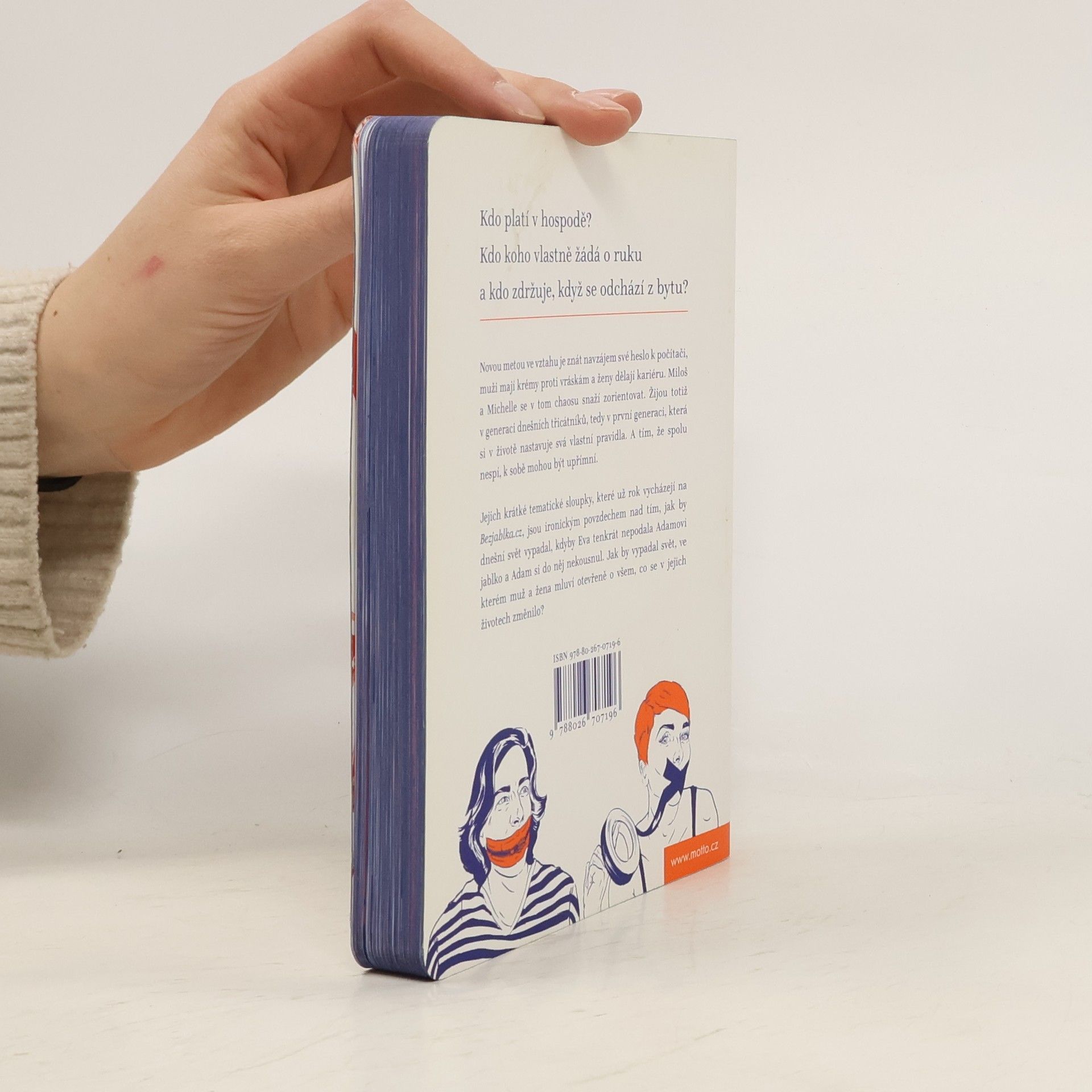 Kdo platí v hospodě? Kdo koho vlastně žádá o ruku a kdo zdržuje, když se odchází z bytu? Žijeme ve světě, který se rychle mění. Tak rychle, že se na některé změny nejsme schopní adaptovat. Novou metou ve vztahu je znát navzájem své heslo k počítači, muži mají krémy proti vráskám a ženy dělají kariéru. Miloš a Michelle se v tom chaosu snaží zorientovat. Žijou totiž v generaci dnešních třicátníků, tedy v první generaci, která si v životě nastavuje svá vlastní pravidla. Pohledem muže a ženy se dotýkají různých situací, pro které v dnešních zběsilých časech najednou není žádný návod. Zkoumají místa, která jsou zanesena stereotypy a u kterých žena zdvihá obočí a muž se kouká jinam. A tím, že spolu nespí, k tobě mohou být upřímní. Jejich krátké tematické sloupky, které už rok vycházejí na Bezjablka.cz, jsou ironickým povzdechem nad tím, jak by dnešní svět vypadal, kdyby Eva tenkrát nepodala Adamovi jablko a Adam si do něj nekousnul. Jak by vypadal svět, ve kterém se žena a muž před sebou nestydí a mluví otevřeně o všem, co se v jejich životech změnilo?