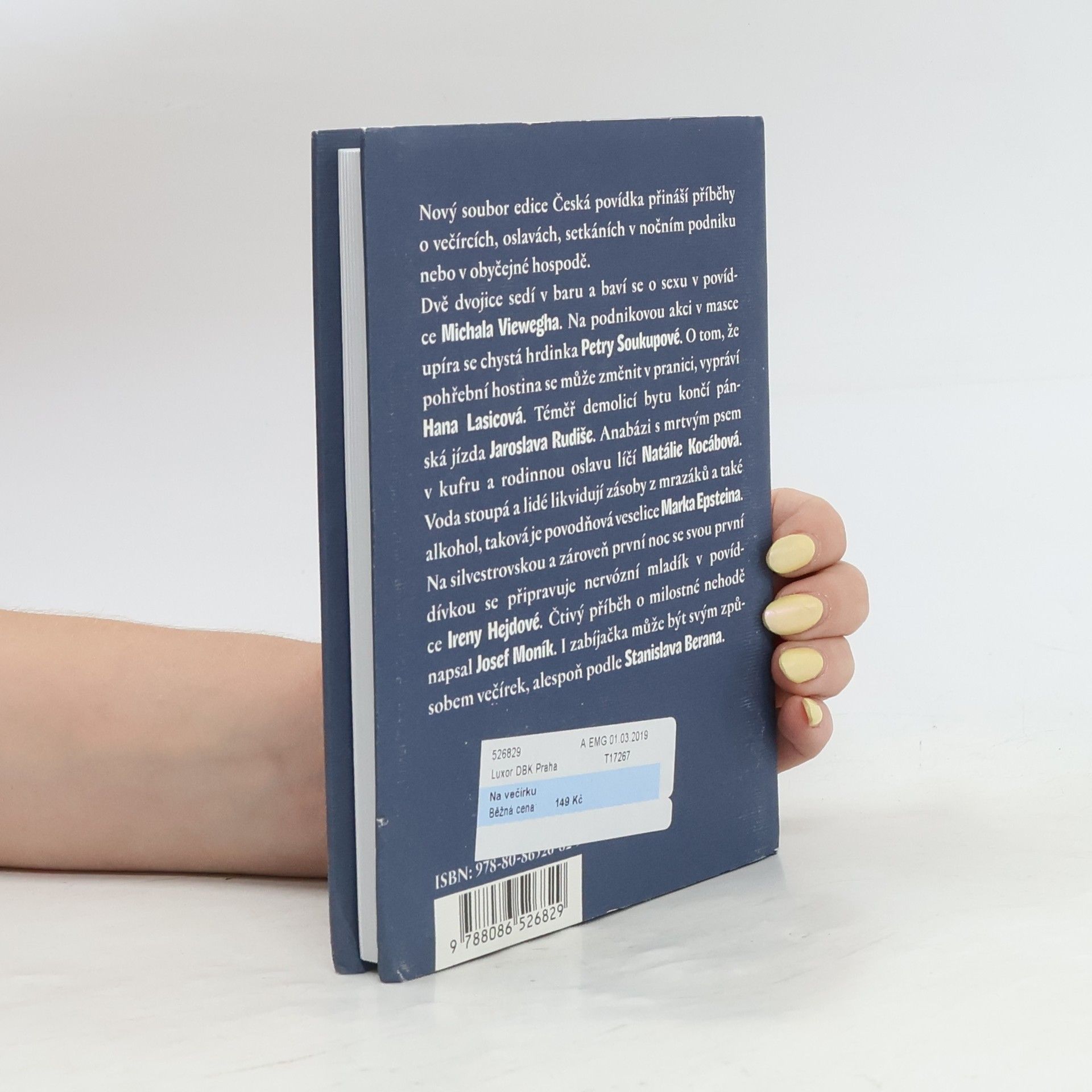 Povídky o večírcích a oslavách. Dvě dvojice sedí v baru a baví se o sexu v povídce Michala Viewegha. Na večírek v masce upíra se chystá hrdinka příběhu Petry Soukupové. O tom, že pohřební hostina se může změnit v pranici, píše Hana Lasicová, j.h. Téměř demolicí bytu končí pánská jízda Jaroslava Rudiše. Anabázi s mrtvým psem v kufru ličí N. Kocábnová. Povodňovou veselici nabízí Marek Epstein. Na silvestrovskou a zároveň svou iniciační noc se chystá maldík v povídce Ireny Hejnové. Večírek ve formě zabijačky se odehrává v povídce S. Berana.