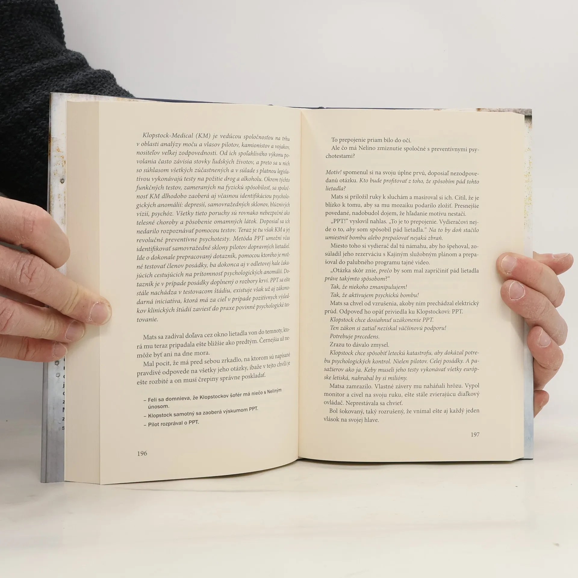Predstavte si, že letíte z Buenos Aires do Berlína v luxusnom dvojposchodovom airbuse s vyše 600 pasažiermi. Aj keď máte strach z lietania, očakávate hladký priebeh cesty. Takto sa začína cesta doktora Matsa Krügera, no čoskoro sa všetko zmení. Matsovi zavolá neznámy vydierač, ktorý ho núti, aby spôsobil pád lietadla, inak zomrie jeho dcéra Nele, ktorá má každú chvíľu priviesť na svet dieťa. Zatiaľ čo Nele unáša šialený ochranca práv zvierat, Mats má 13 hodín na to, aby vyvolal u svojej bývalej pacientky dávno zahojenú traumu a vyprovokoval ju k zničeniu lietadla so 626 cestujúcimi. Začína sa napínavý a nervy trhajúci príbeh, pričom čitateľ je svedkom každého okamihu. Tento thriller sa inšpiruje tragédiou z marca 2015, keď lietadlo Germanwings narazilo do hôr, pričom všetci na palube zahynuli. Vyšetrovanie odhalilo, že nehodu zapríčinil druhý pilot, ktorý trpel depresiami. Táto katastrofa vyvolala otázky o bezpečnosti v letectve a viedla k požiadavkám na prísnejšie testy pre pilotov. Existuje totiž jediná zbraň, ktorú možno prepašovať na palubu každého lietadla – duševne labilný človek. Majster trileru Sebastian Fitzek sa tejto témy chopil a vytvoril napínavú hru o čas, bezpečnosť a životy nevinných.