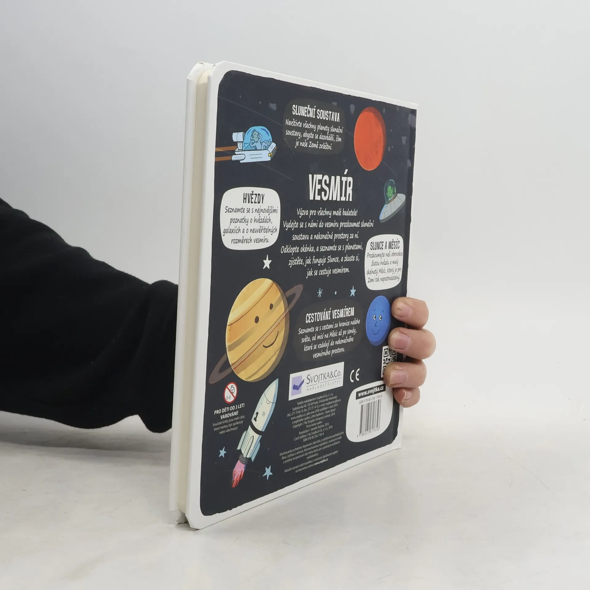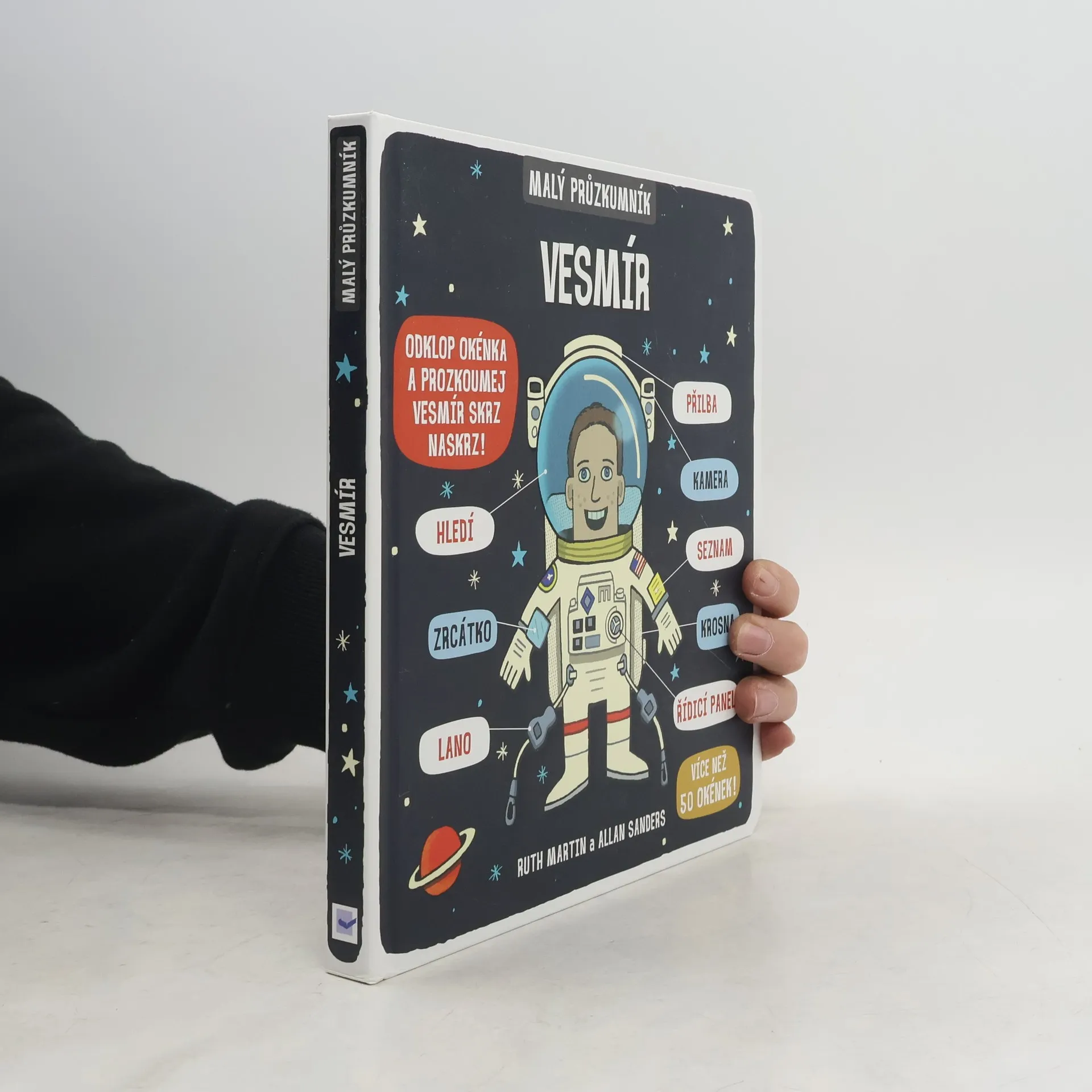 Zveme všechny malé průzkumníky k objevování – odklopte více než 50 okének a prozkoumejte vesmír skrz naskrz! Je toho přece spousta k objevování! Přilba skafandru, hledí, zrcátko, lano, kamera, seznam, krosna, řídicí panel... Zveme všechny malé průzkumníky k objevování! Vydejte se s námi do vesmíru prozkoumat sluneční soustavu a nekonečné prostory za ní. Odklopte více než 50 okének, nahlédněte dovnitř a prozkoumejte vesmír skrz naskrz. Seznamte se s planetami, zjistěte, jak funguje Slunce, a zkuste si, jak se cestuje vesmírem za hranice našeho světa. Přečtěte si něco o nejnovějších poznatcích o hvězdách, galaxiích a neuvěřitelných rozměrech vesmíru a navštivte všechny planety sluneční soustavy, abyste se dověděli, čím je zvláštní naše Země – je toho přece spousta k objevování!