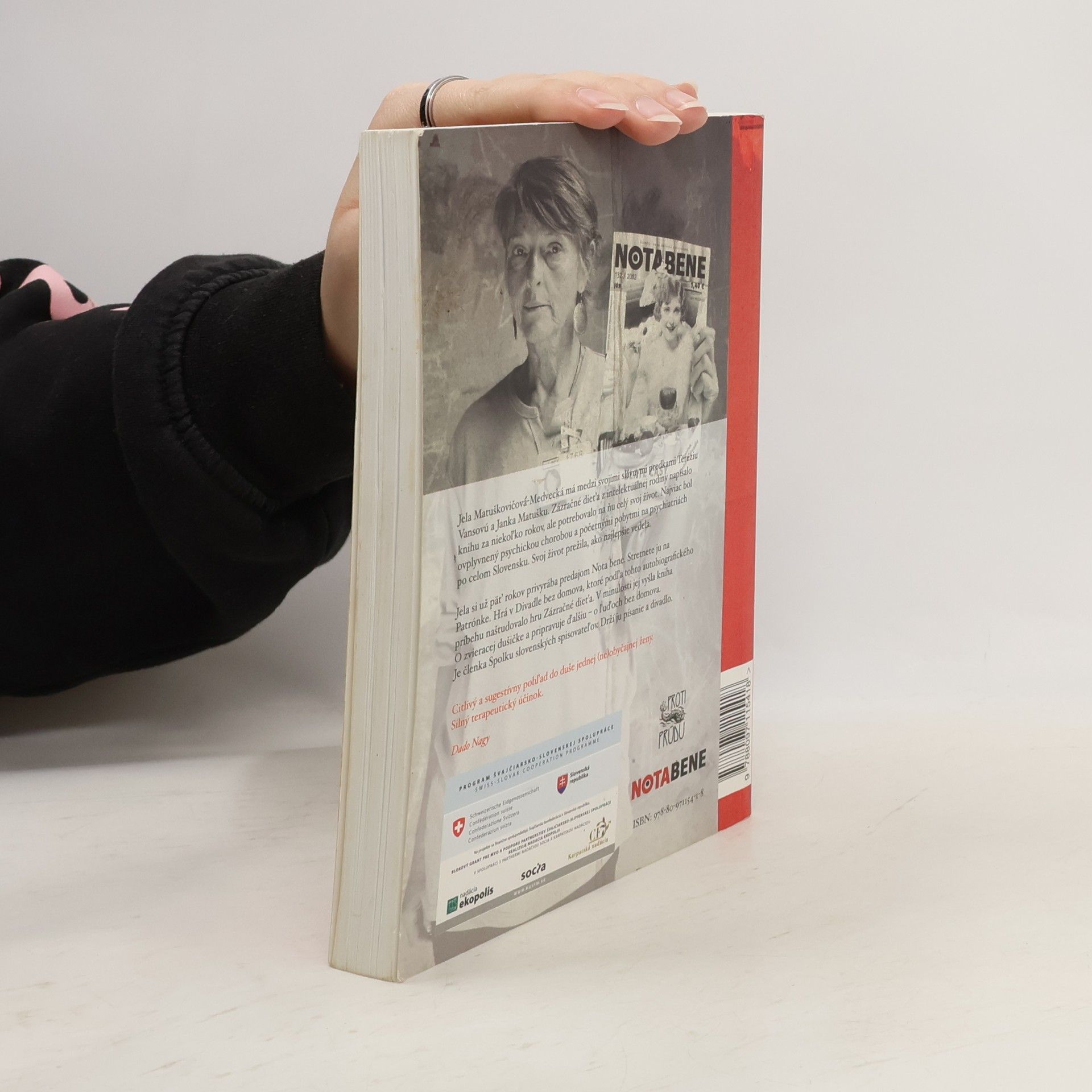 Keď sa hovorí o bezdomovcoch, málokto si predstaví spisovateľku. Predajkyňa pouličného časopisu Nota Bene Jela Matuškovičová, tiež členka Slovenského spisovateľa a herečka Divadla bez domova, premenila svoj život na knihu Zázračné dieťa. Zázračné dieťa je príbeh ženy, ktorá trpí ťažkou psychiatrickou diagnózou. Táto diagnóza spôsobila, že jej vzťahy s rodinnými príslušníkmi stroskotali a neskôr skončila na ulici. Táto odvážna kniha s trefnými postrehmi ponúka jedinečný vhľad do vnútorného sveta medziľudských vzťahov, ktoré formujú naše životy. Príbeh zachytáva detstvo pani Jely v starej slovenskej intelektuálnej rodine, prepuknutie choroby aj pobyty na psychiatriách počas totality, kde zažila neľudský prístup zo strany lekárov a zdravotníckeho personálu.