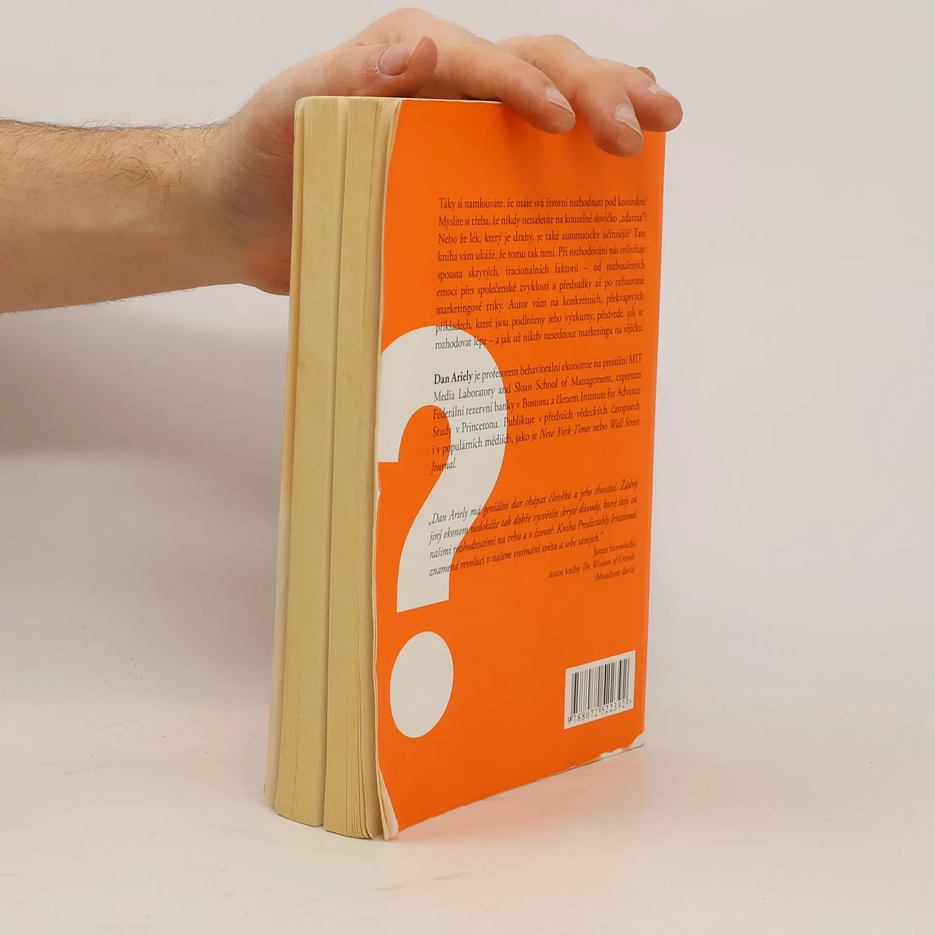 Iracionální faktory v ekonomice i v životě Taky si namlouváte, že máte svá životní rozhodnutí pod kontrolou? Myslíte si třeba, že nikdy nenaletíte na kouzelné slovíčko „zdarma“? Nebo že lék, který je drahý, je také automaticky účinnější? Tato kniha vám ukáže, že tomu tak není. Při rozhodování nás ovlivňuje spousta skrytých, iracionálních faktorů – od rozbouřených emocí přes společenské zvyklosti a předsudky až po rafinované marketingové triky. Autor této vysoce ceněné knihy vám na konkrétních, překvapivých příkladech, které jsou podloženy jeho výzkumy, předvede, jak se rozhodovat lépe – a jak už nikdy nesednout marketingu na vějičku.